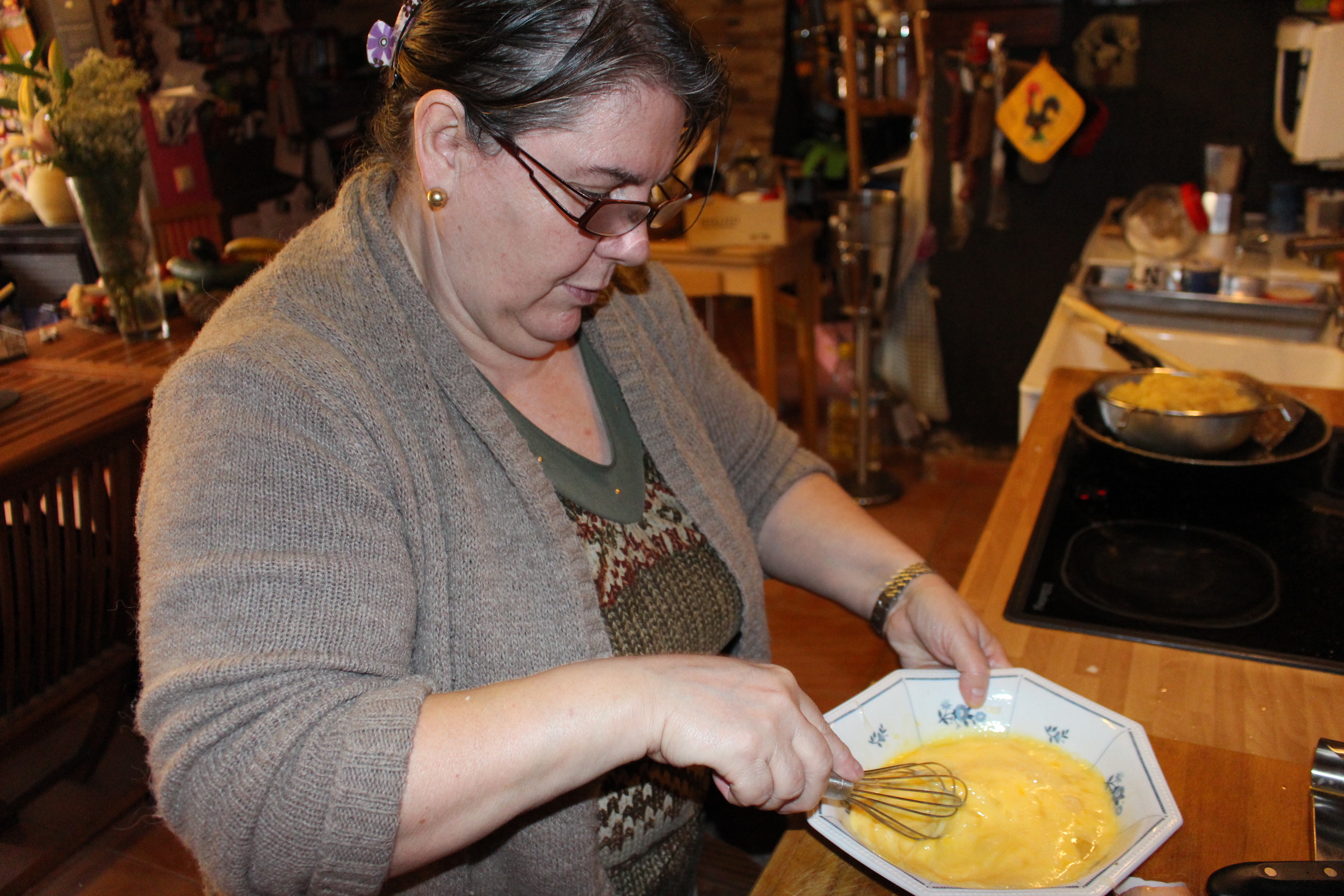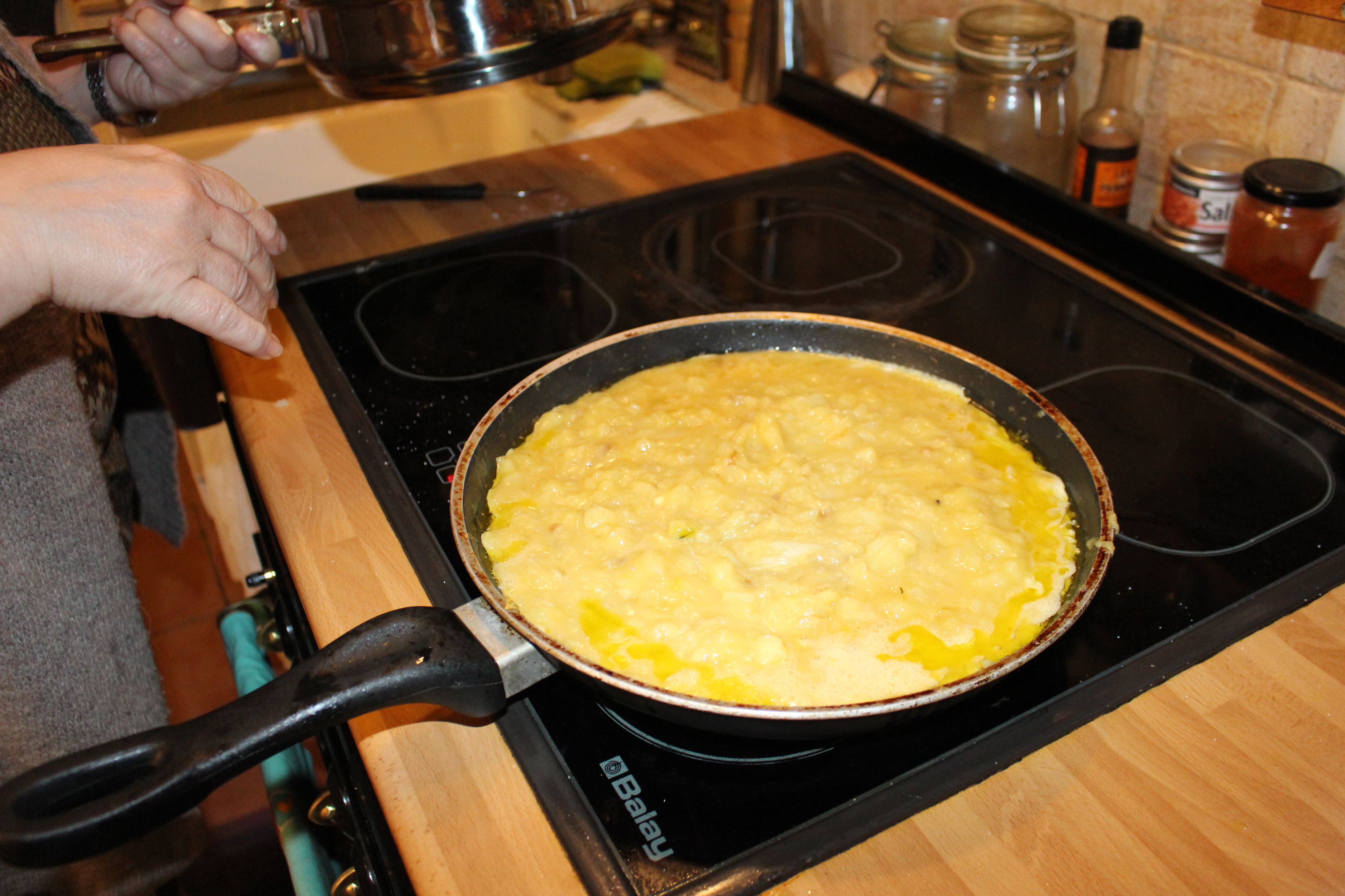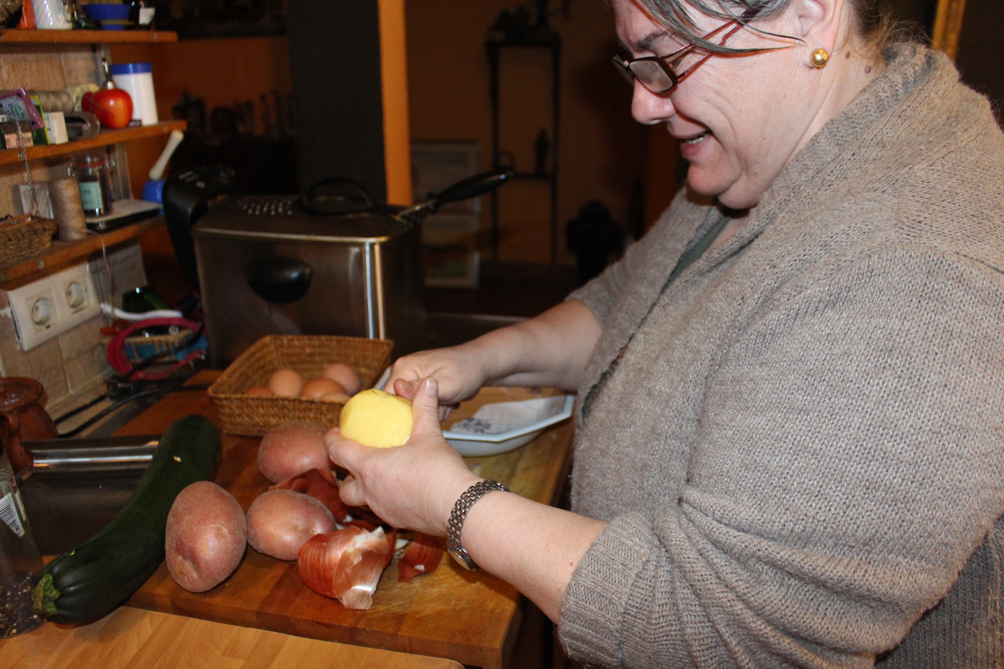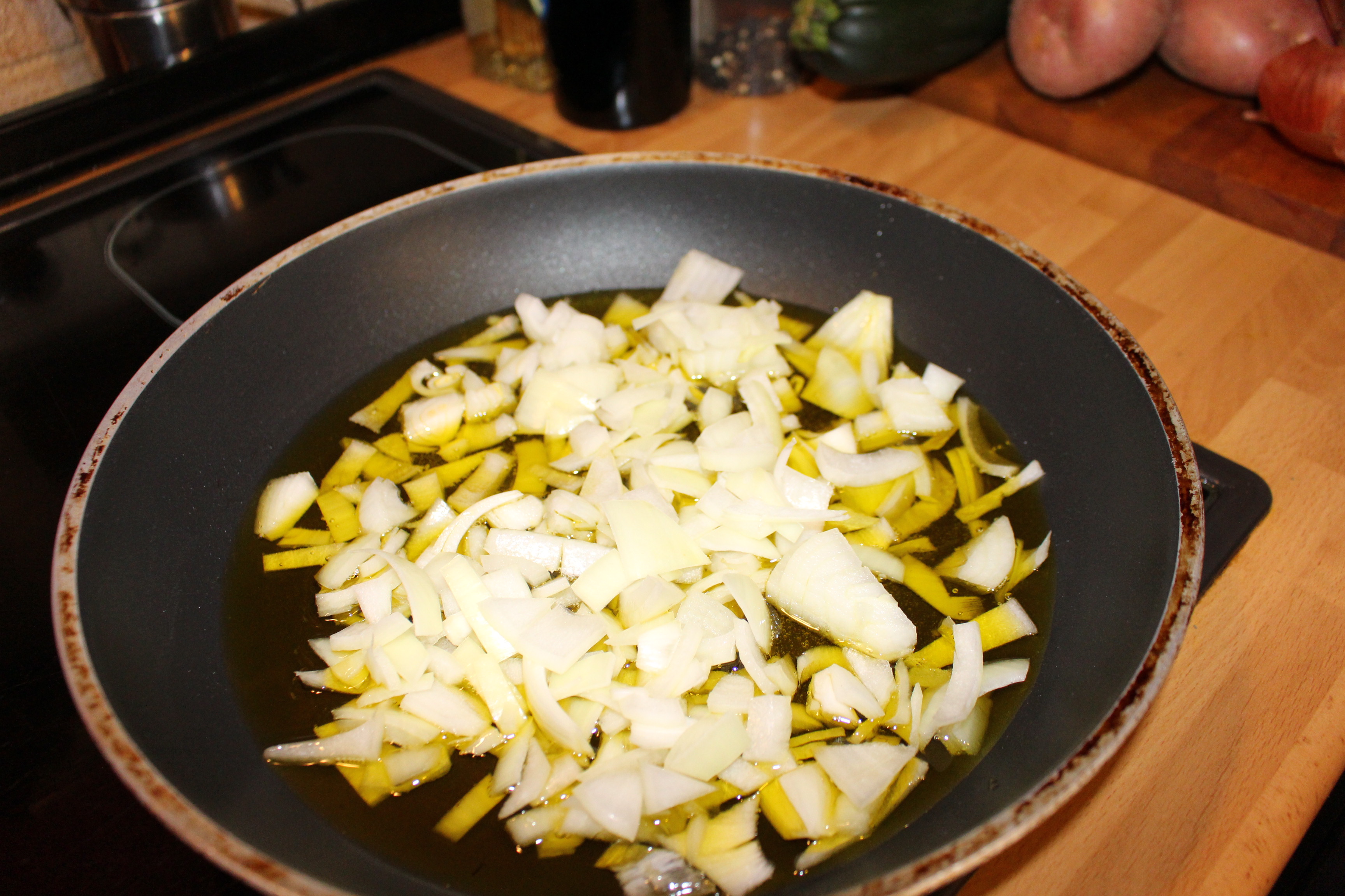 Pone aceite de oliva en la sartén y añade la cebolla, la pocha y añade las patatas y el calabacín cortado en cuadraditos, Deja que se vaya haciendo lentamente, hasta que todos los ingredientes estén blandos. Bate los 6 huevos de corral de sus gallinas con unas varillas. Cuela las patatas, la cebolla y el calabacín para quitarles el aceite y los mezcla con los huevos batidos.