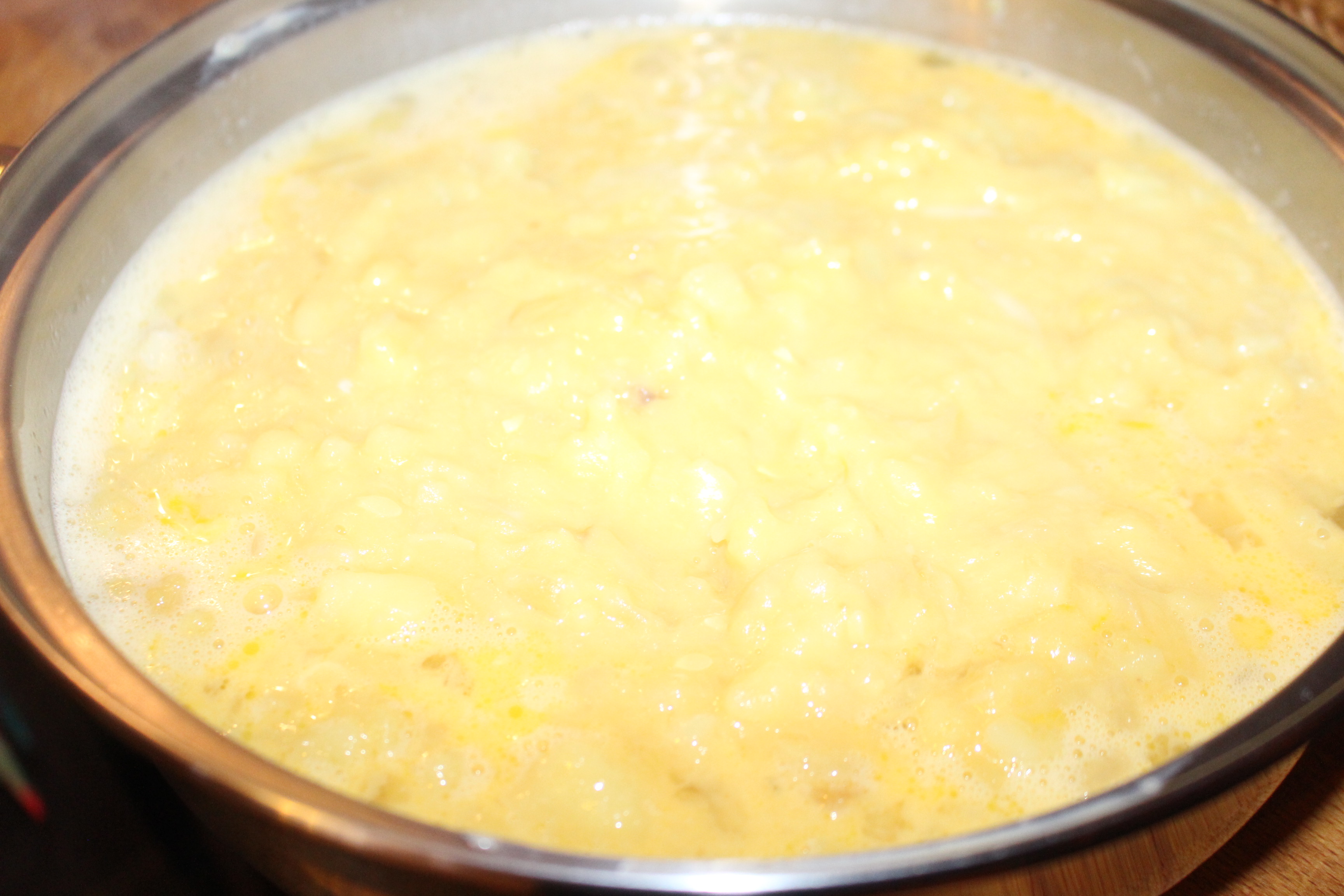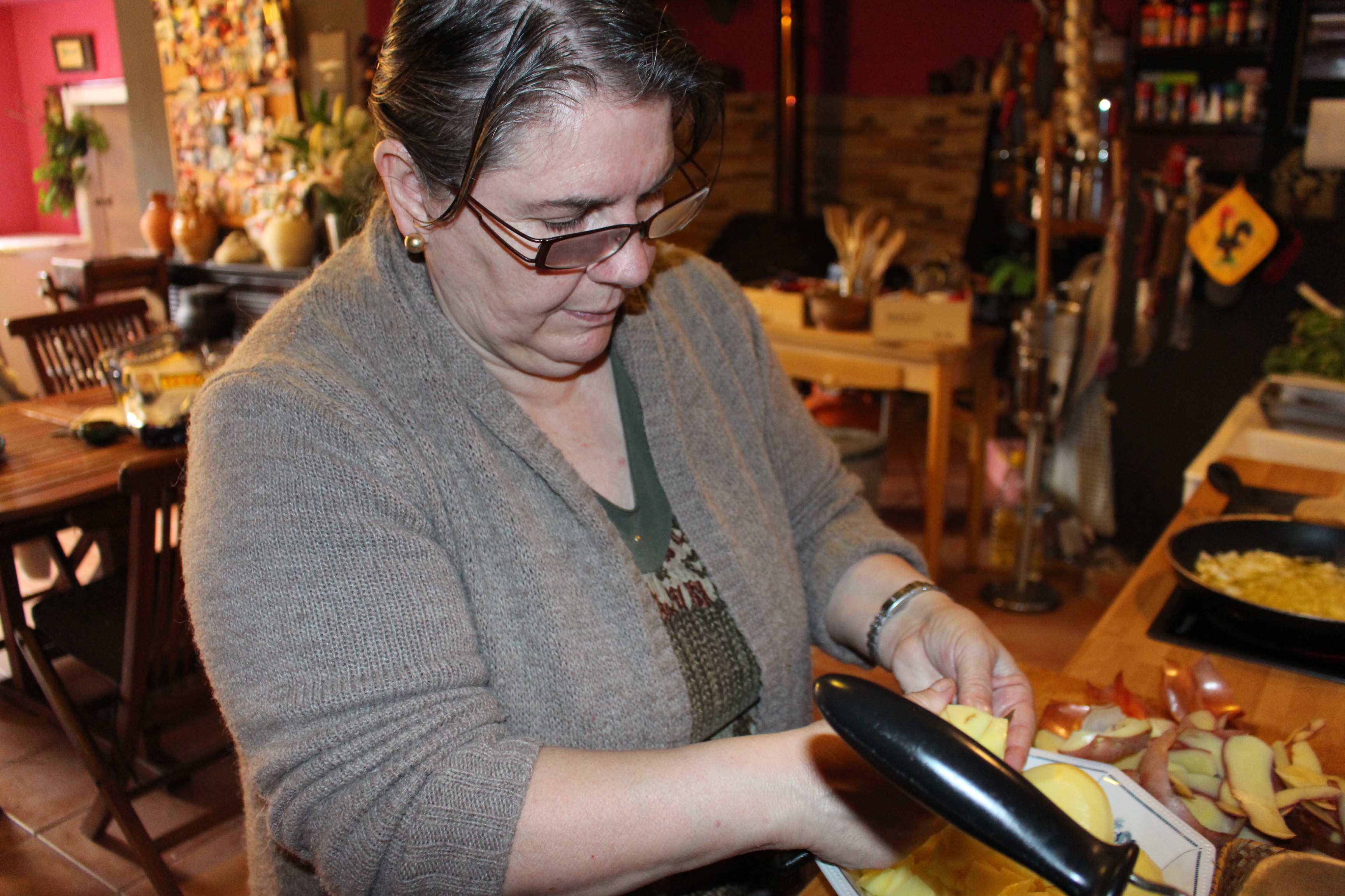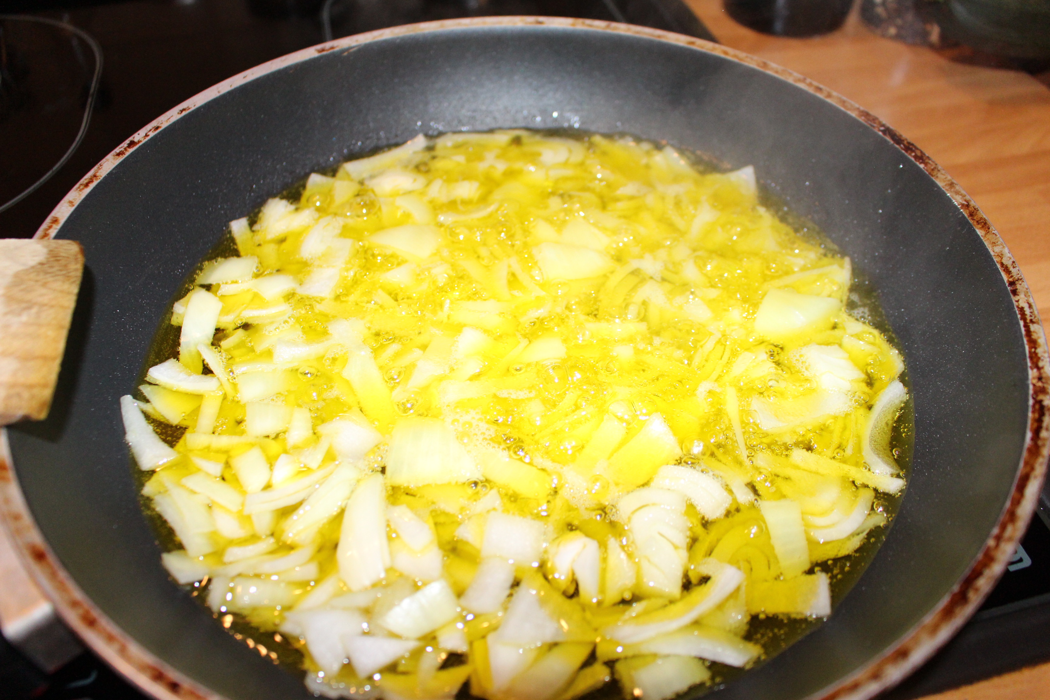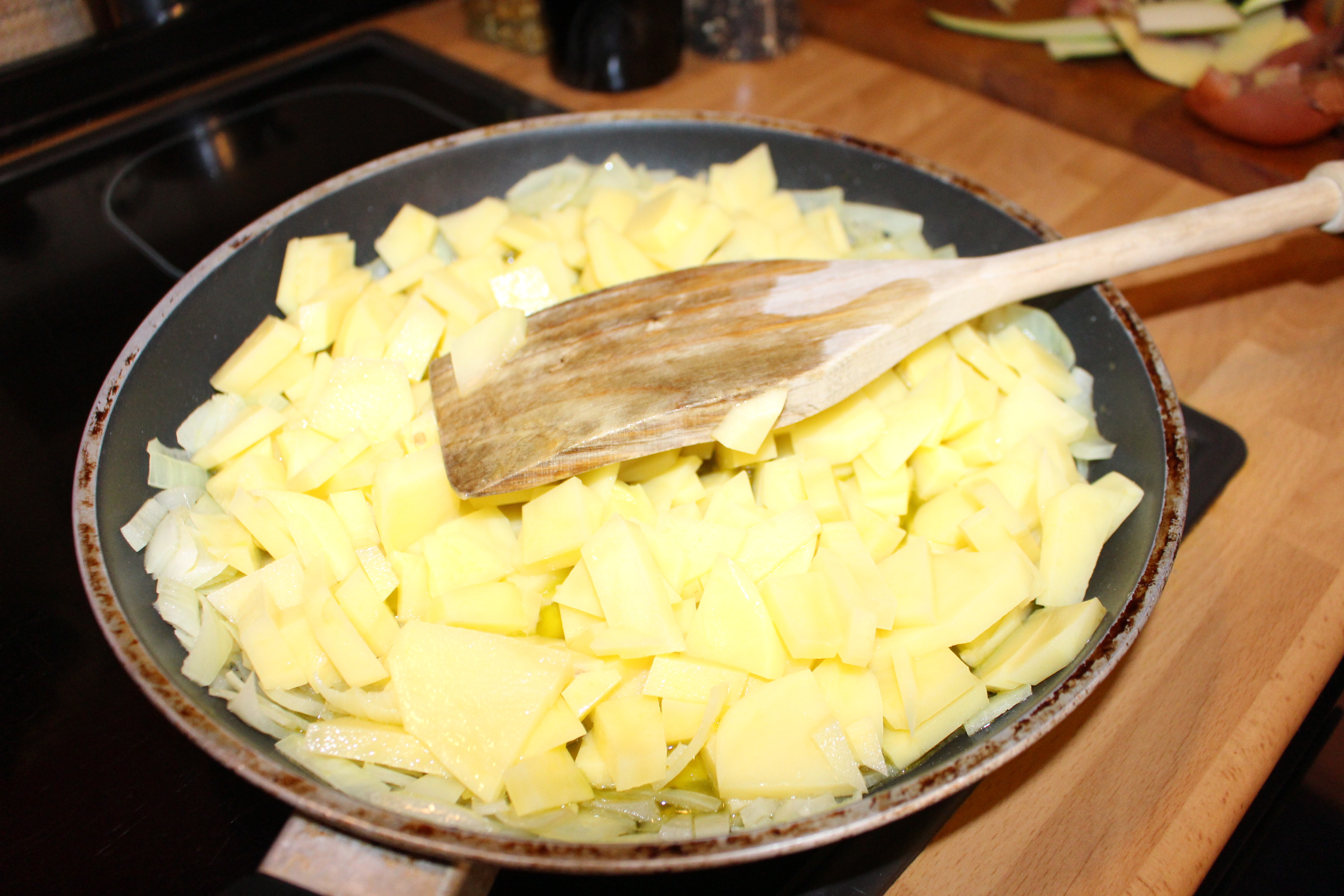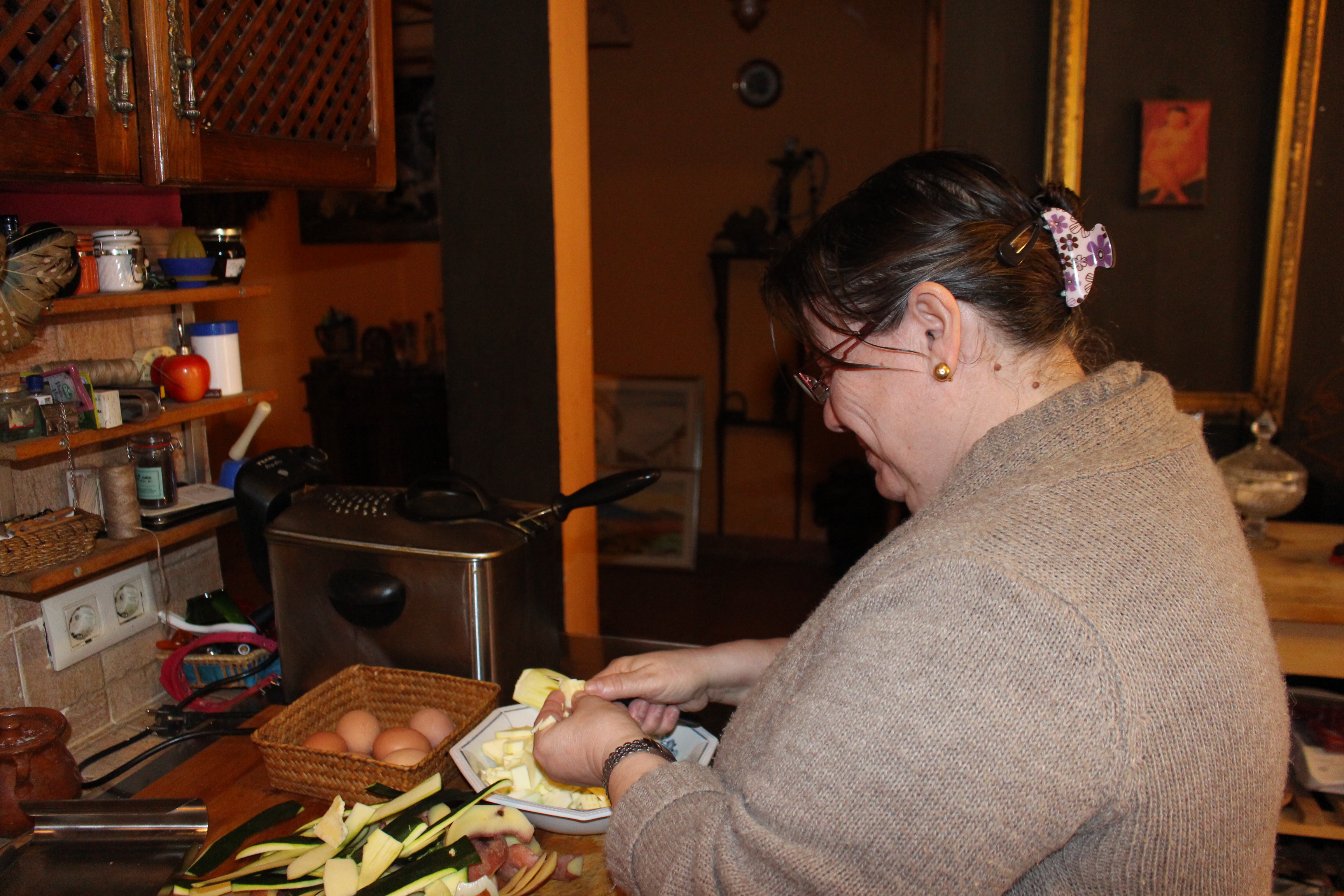 Pone aceite de oliva en la sartén y añade la cebolla, la pocha y añade las patatas y el calabacín cortado en cuadraditos, Deja que se vaya haciendo lentamente, hasta que todos los ingredientes estén blandos. Bate los 6 huevos de corral de sus gallinas con unas varillas. Cuela las patatas, la cebolla y el calabacín para quitarles el aceite y los mezcla con los huevos batidos.