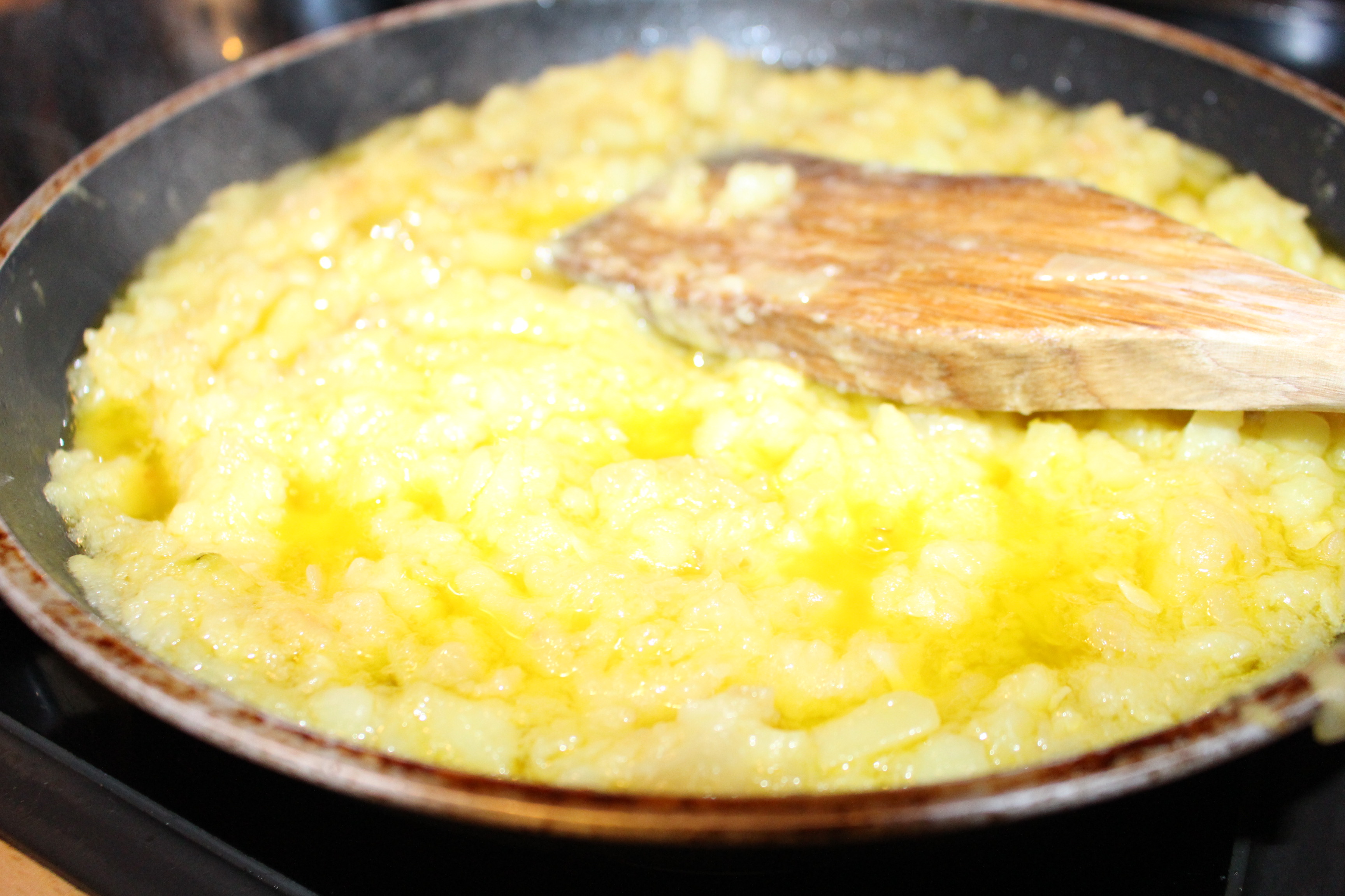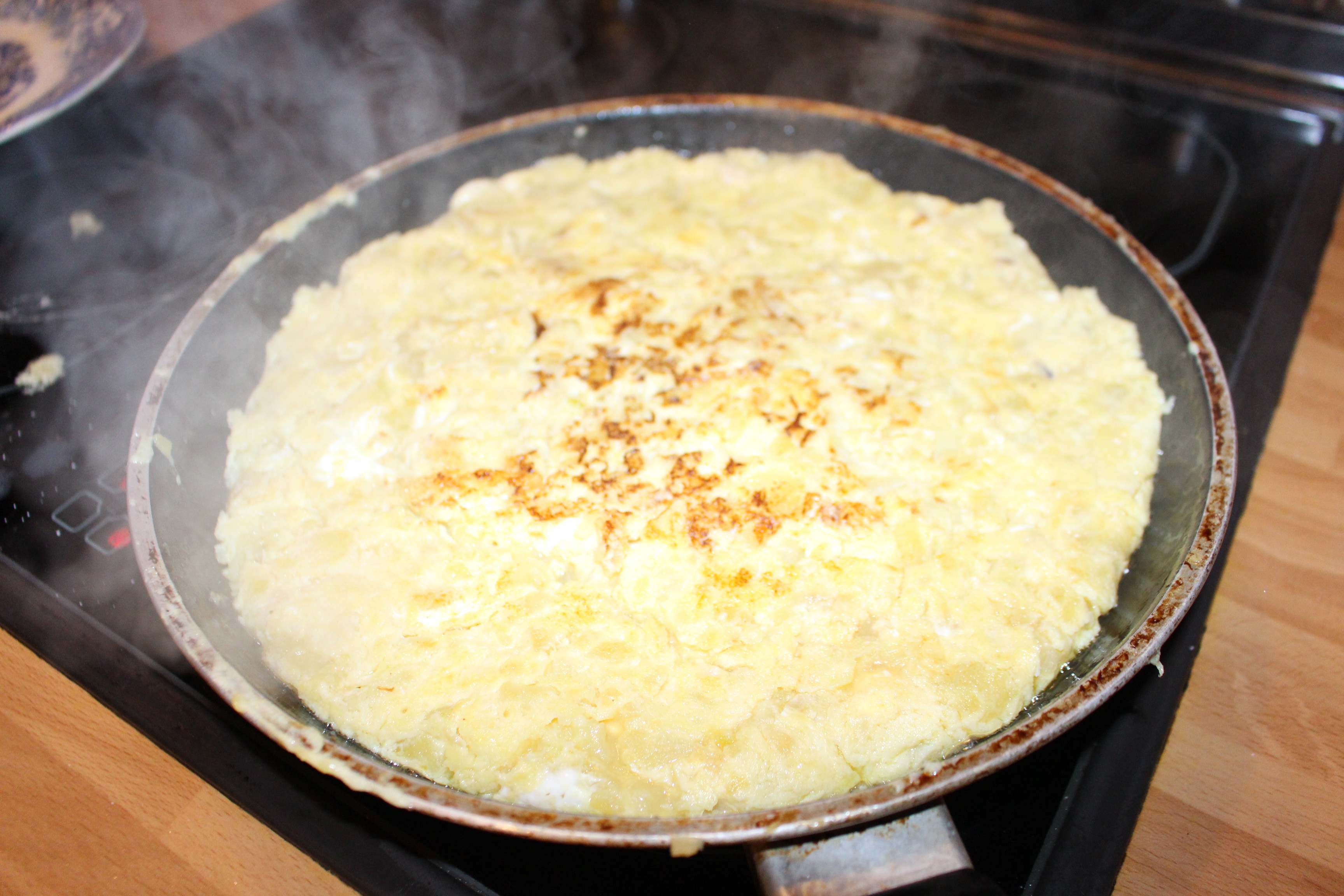 Coloca todo en la sartén con el aceite bien caliente, vuelta y vuelta y Juliana ha preparado una espectacular tortilla.