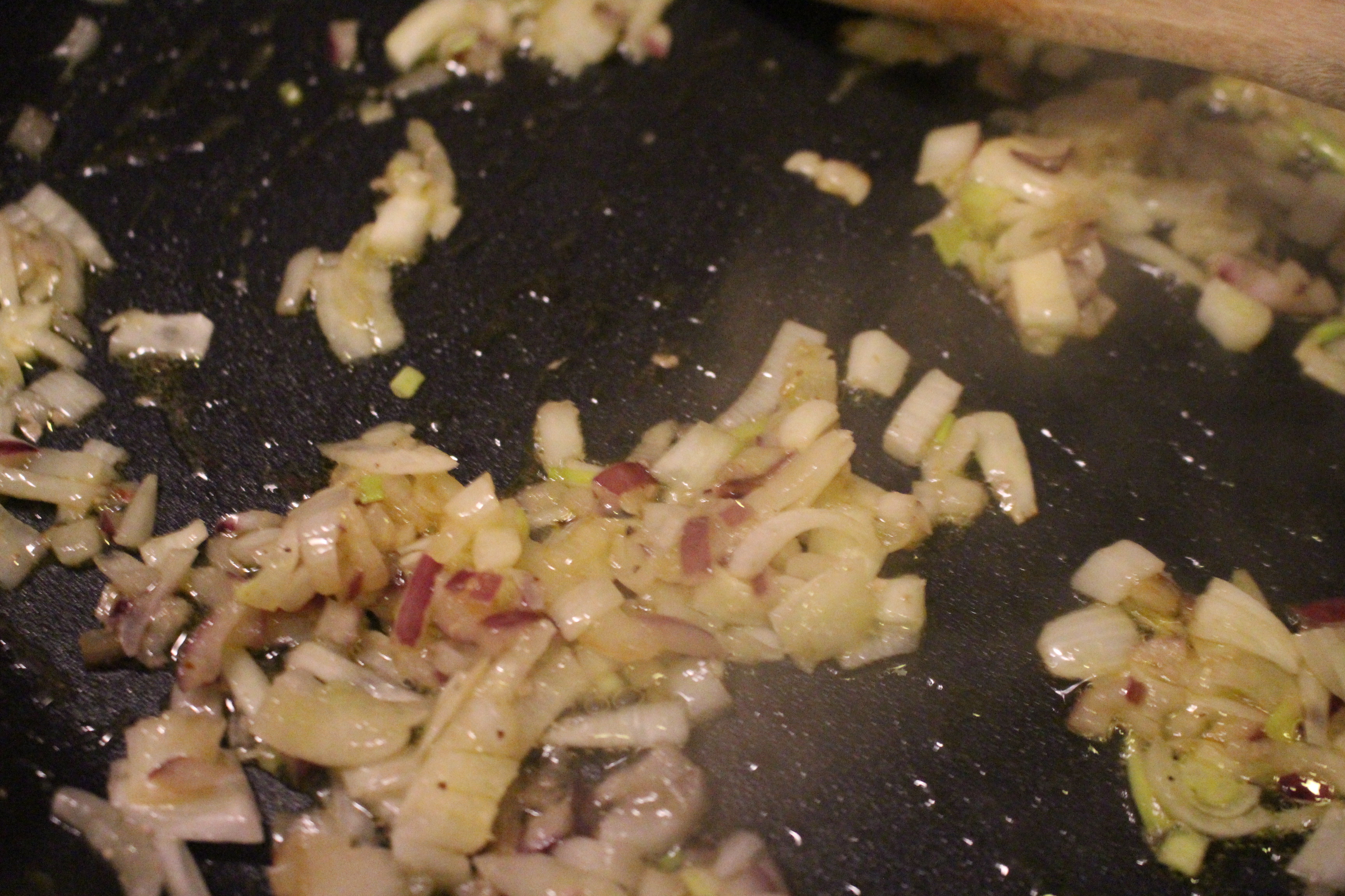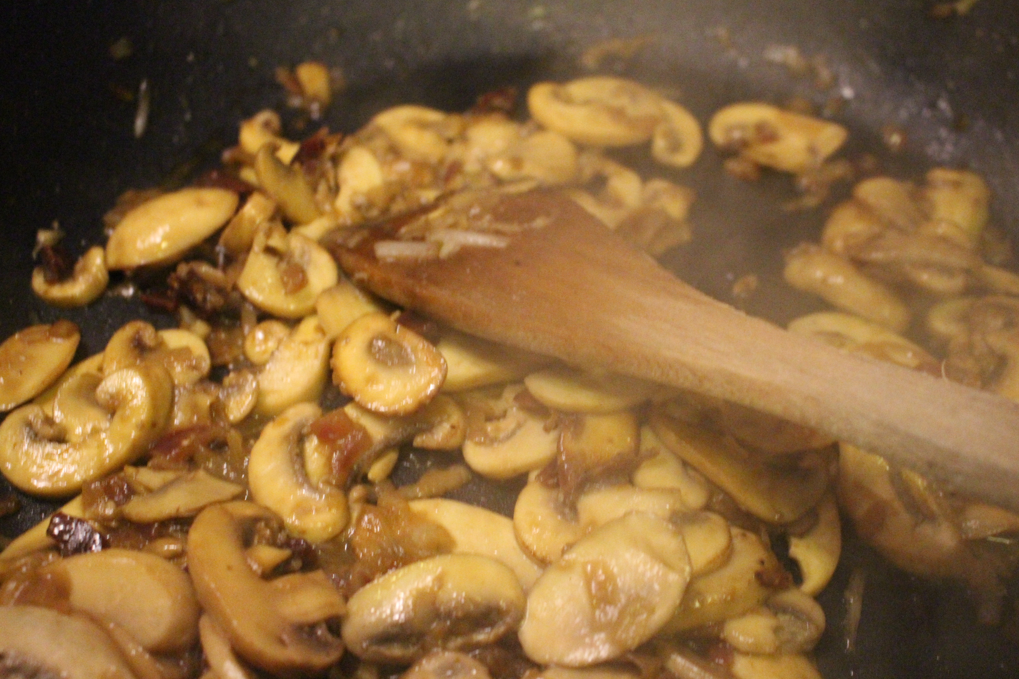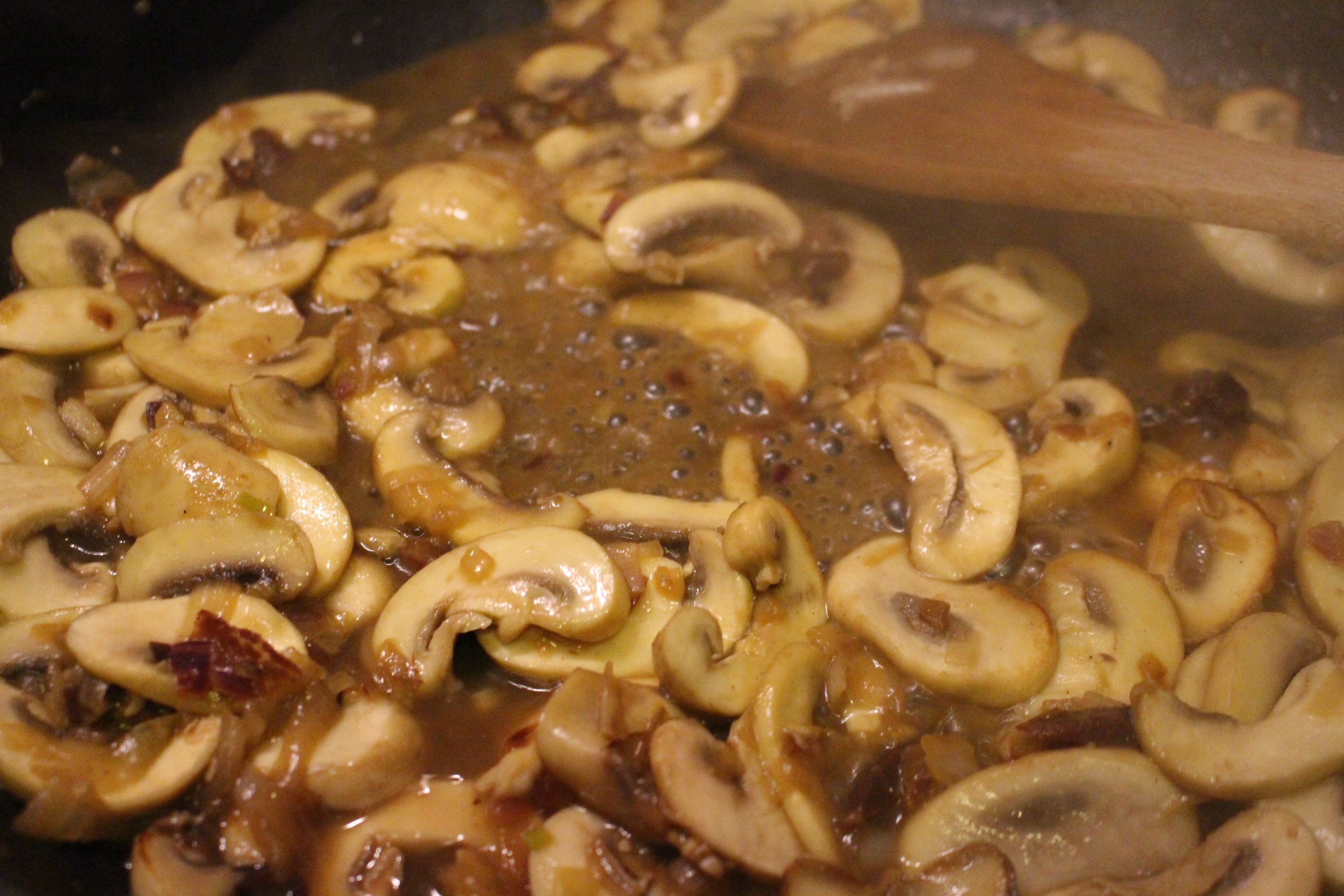 En esa misma olla pongo la cebolleta y la cebolla roja a pochar lentamente, añado los champiñones y el jamón serrano cortado en tiras pequeñas. Salpimentó y añado el coñac o el brandy. Dejo que evapore el alcohol e incorporó la nata líquida y una cucharada de mostaza Dijon. Doy vueltas, tiene que quedaros una salsa homogénea.
