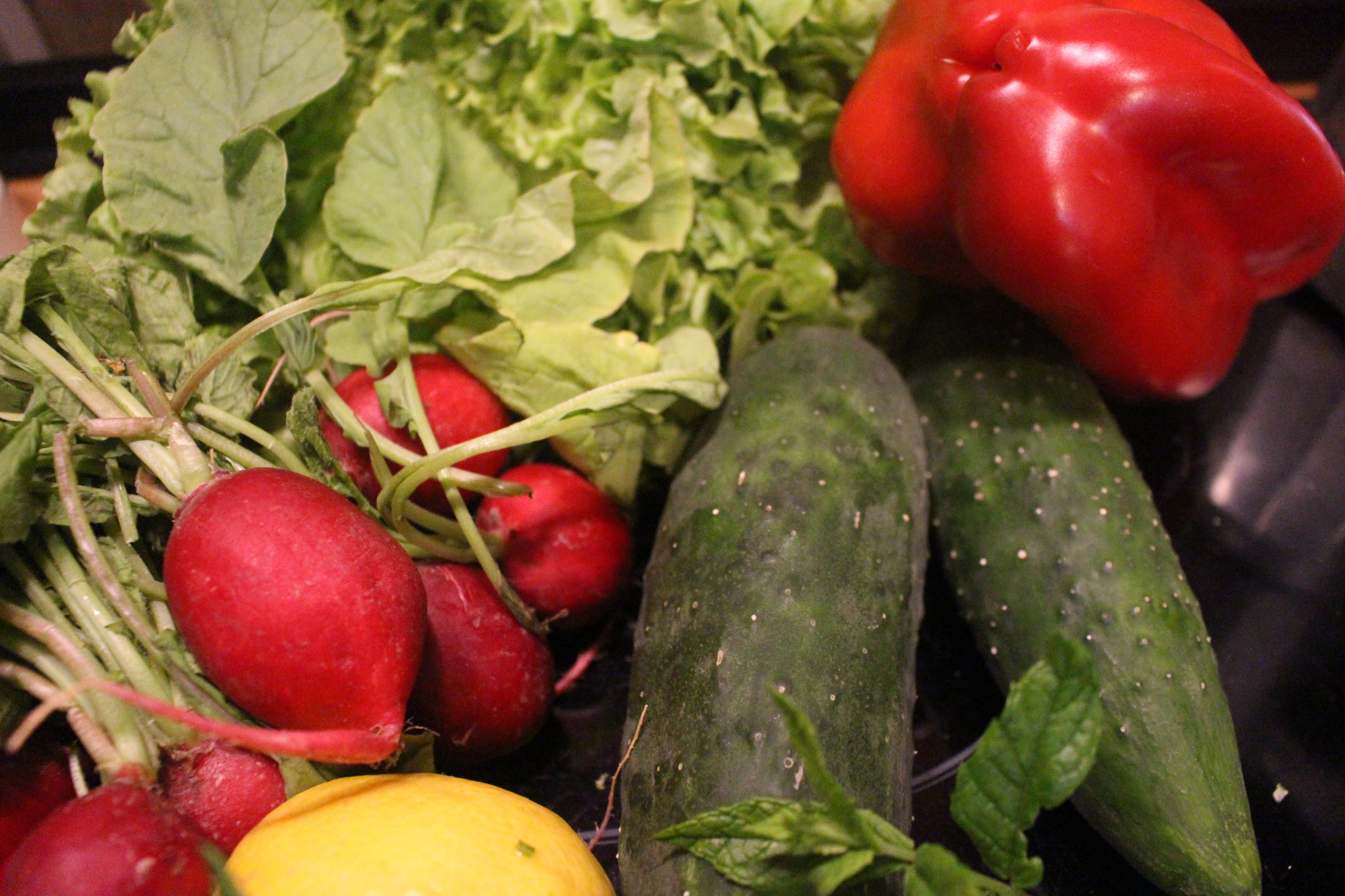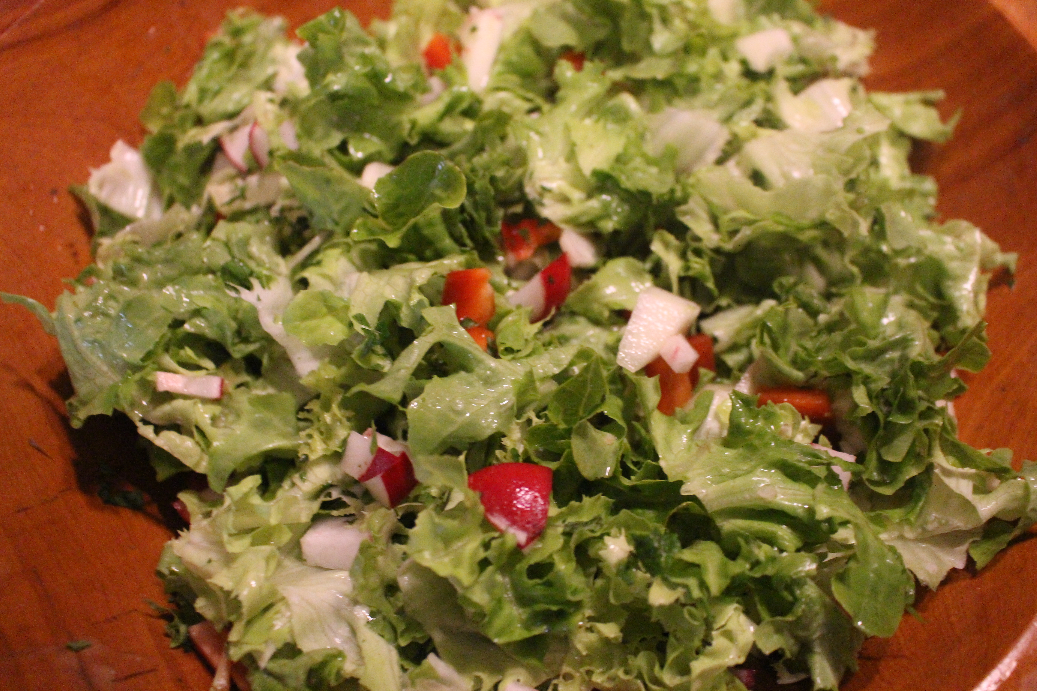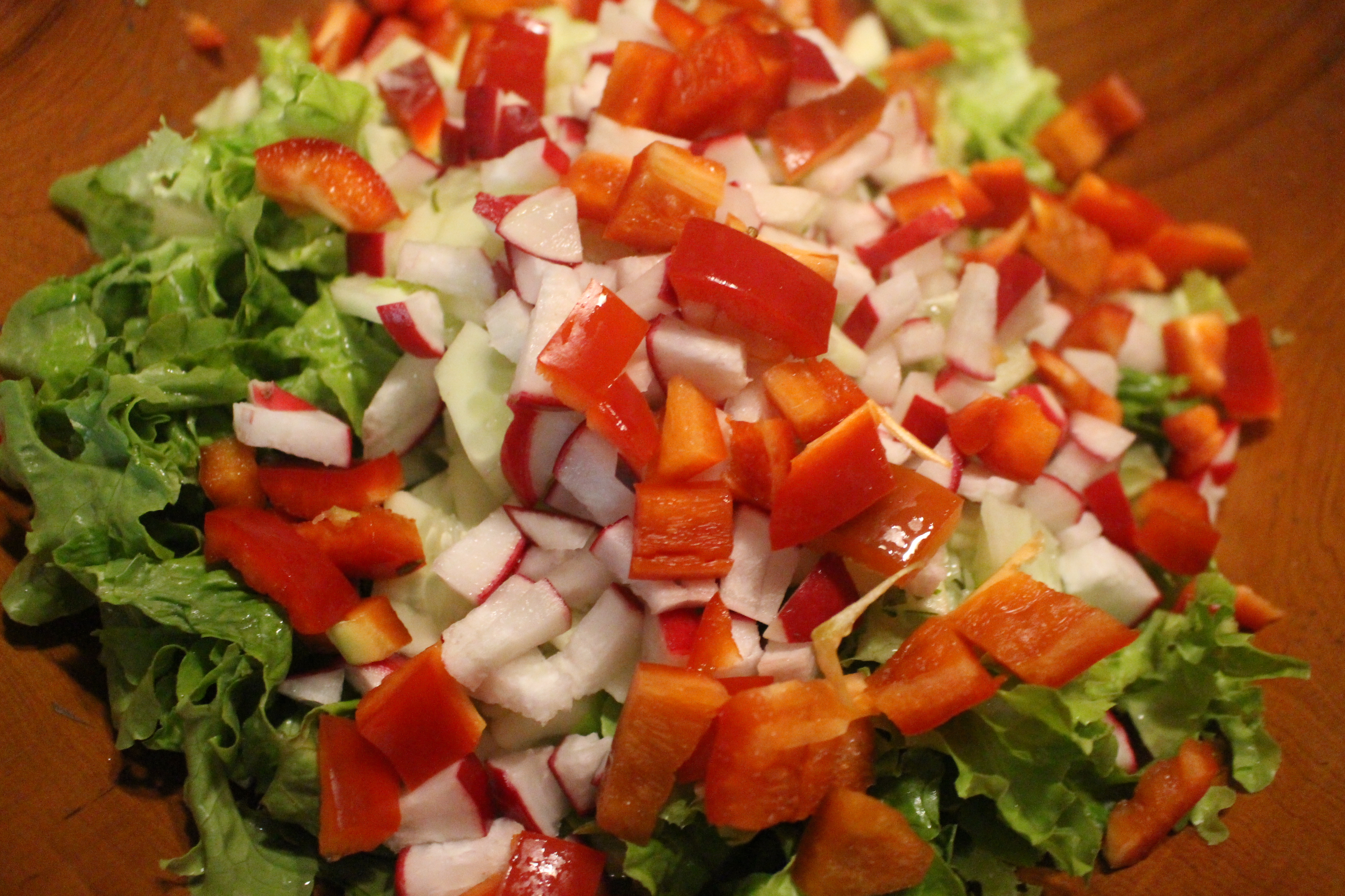 Cortamos la lechuga en trozos pequeños, la cebolla, el pepino, los rabanitos y el pepino y vamos mezclando.