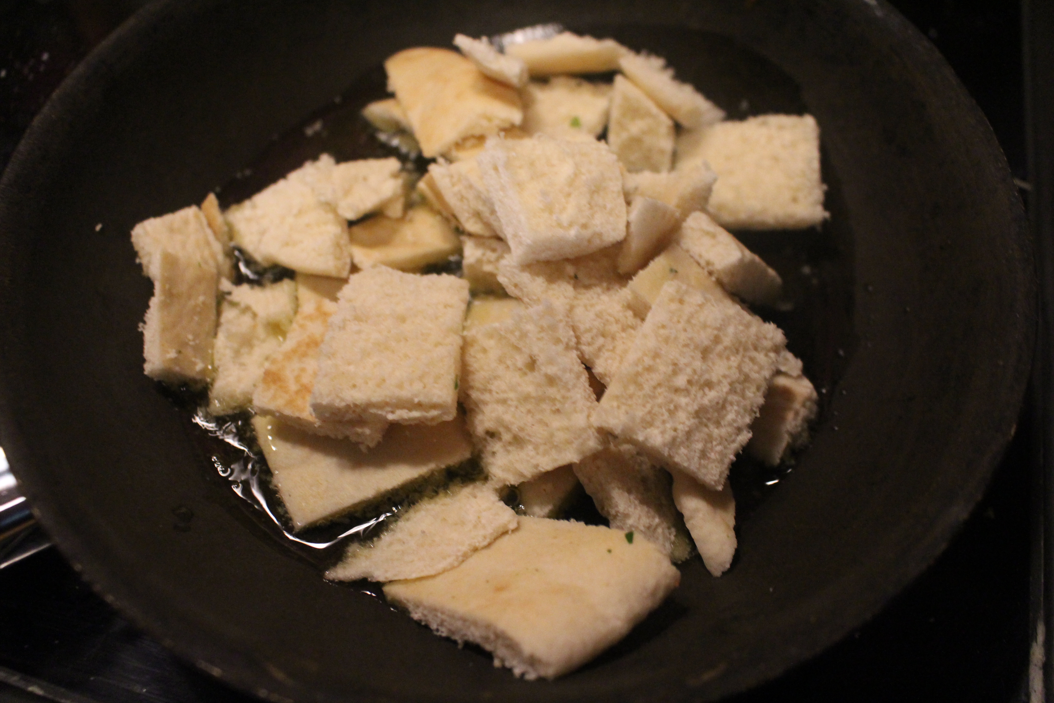 En una sartén con un poco de aceite de oliva coloco el pan de pita y lo voy dorando hasta que quede crujiente.