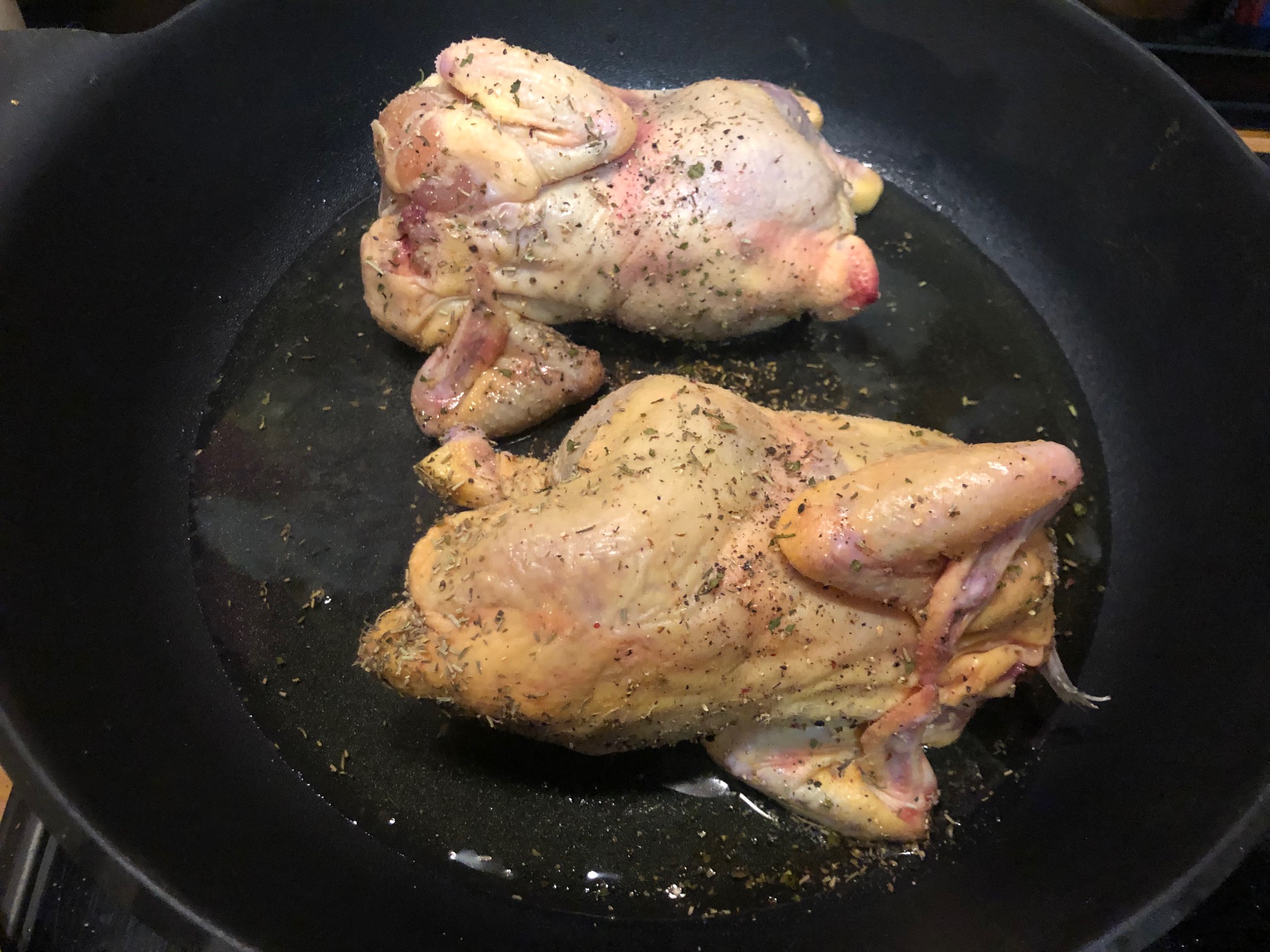 Primero del lado de las alas y luego con la pechuga en la sartén para que se llene de la grasa del animal y no quede tan seca. Una técnica que el maestro utiliza para las aves  de caza.