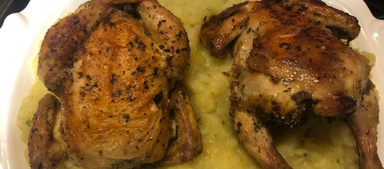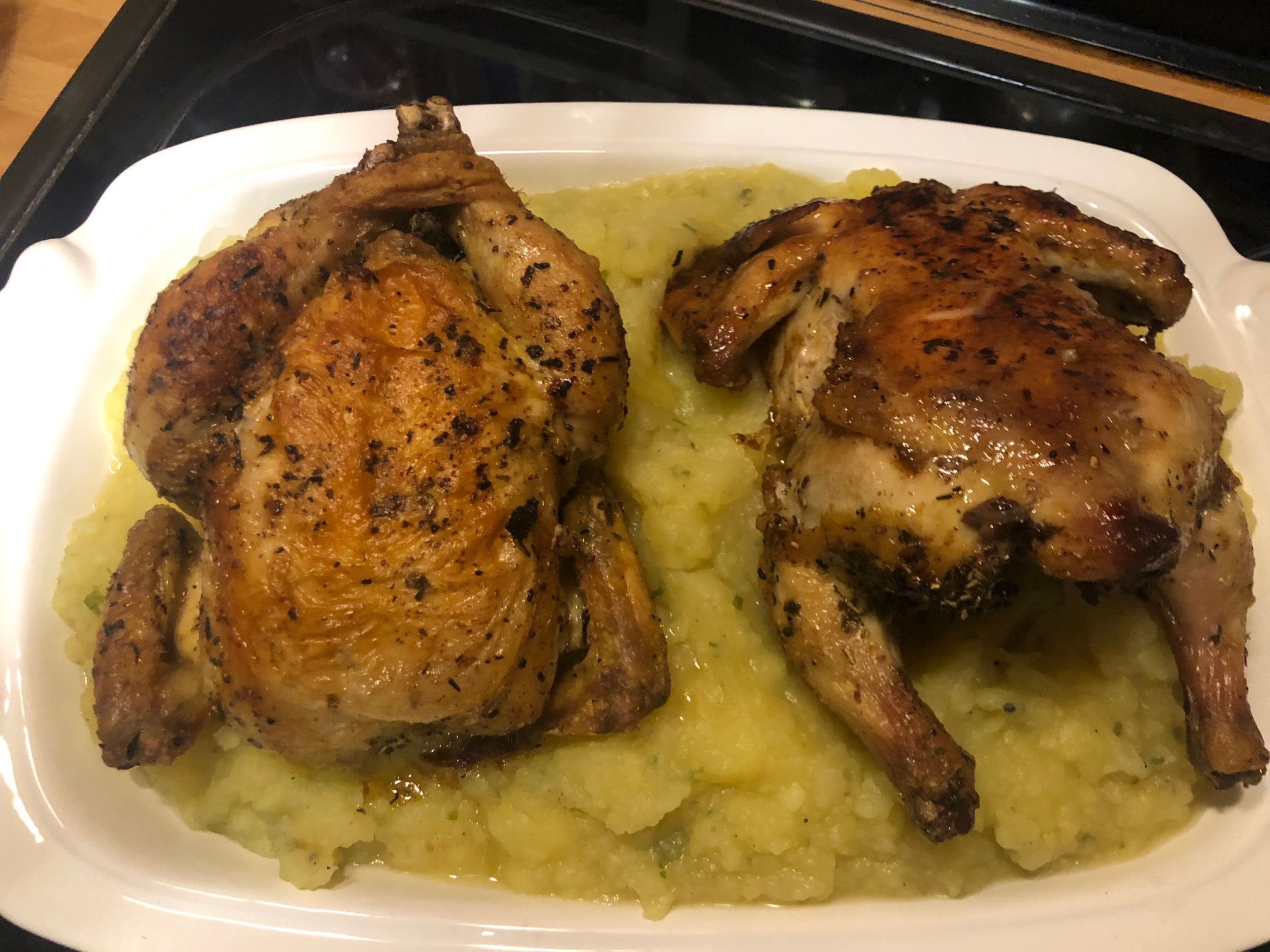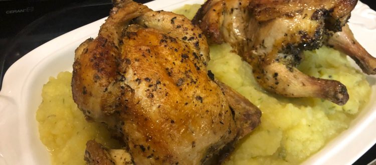 Sacamos los pollitos el horno y colocamos en una bandeja encima del puré de patatas