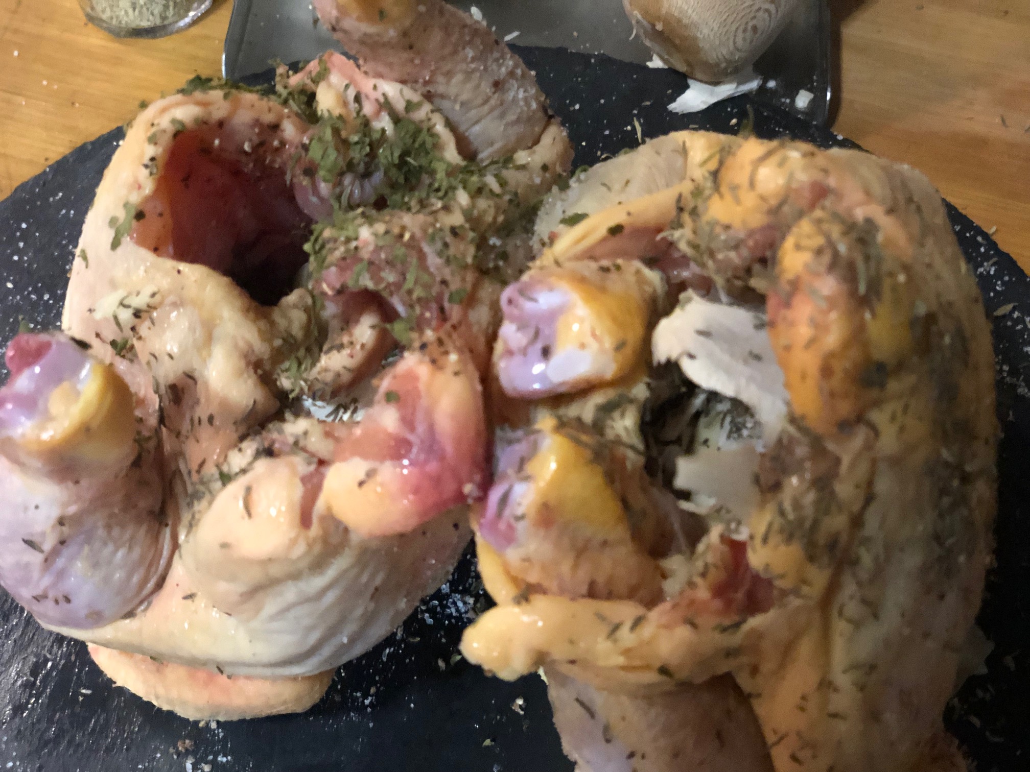 Introducimos en el interior de los picantones parte de este majado, el resto lo utilizamos para embadurnar los pollitos con un picel