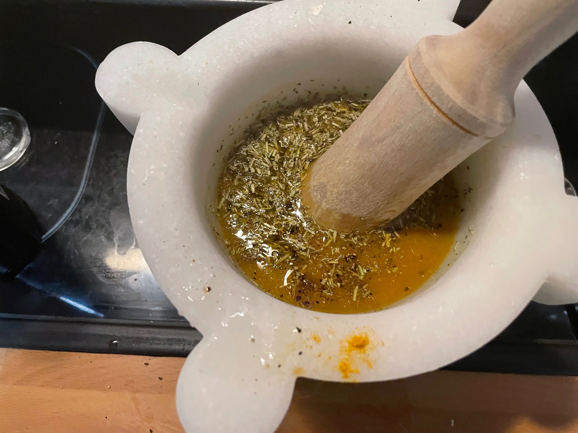 Yo he cogido el mortero y he añadido sal gorda, pimienta negra, tomillo, romero, cúrcuma y pimentón de la Vera, lo he acompañado de un buen aceite de oliva.