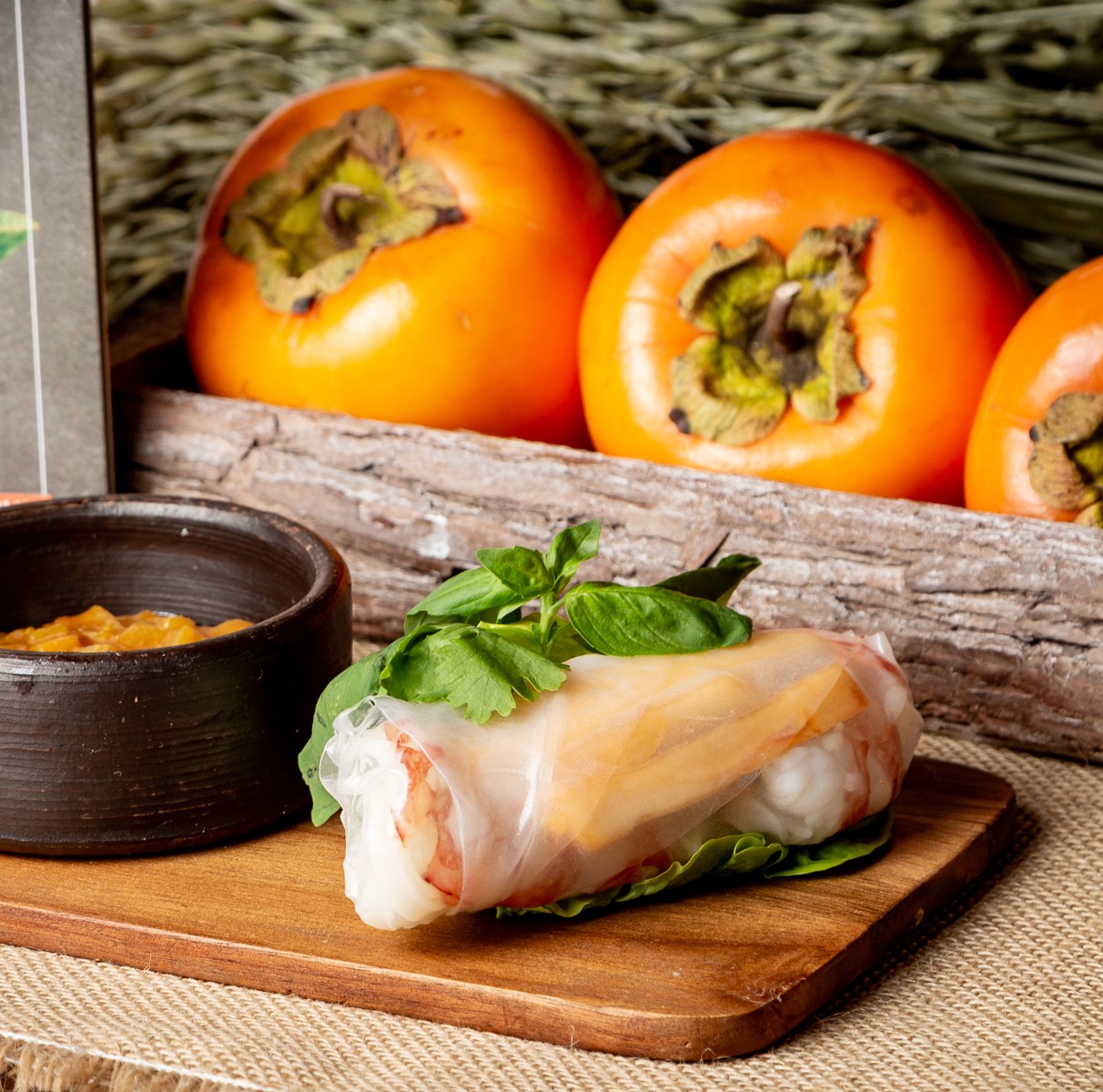 Una receta fresca y ligera que presenta el Kaki D.O.P. Ribera del Xúquer en forma de rollitos vietnamitas, acompañados de langostinos y una deliciosa salsa sweet chili, para un contraste de sabores exóticos.