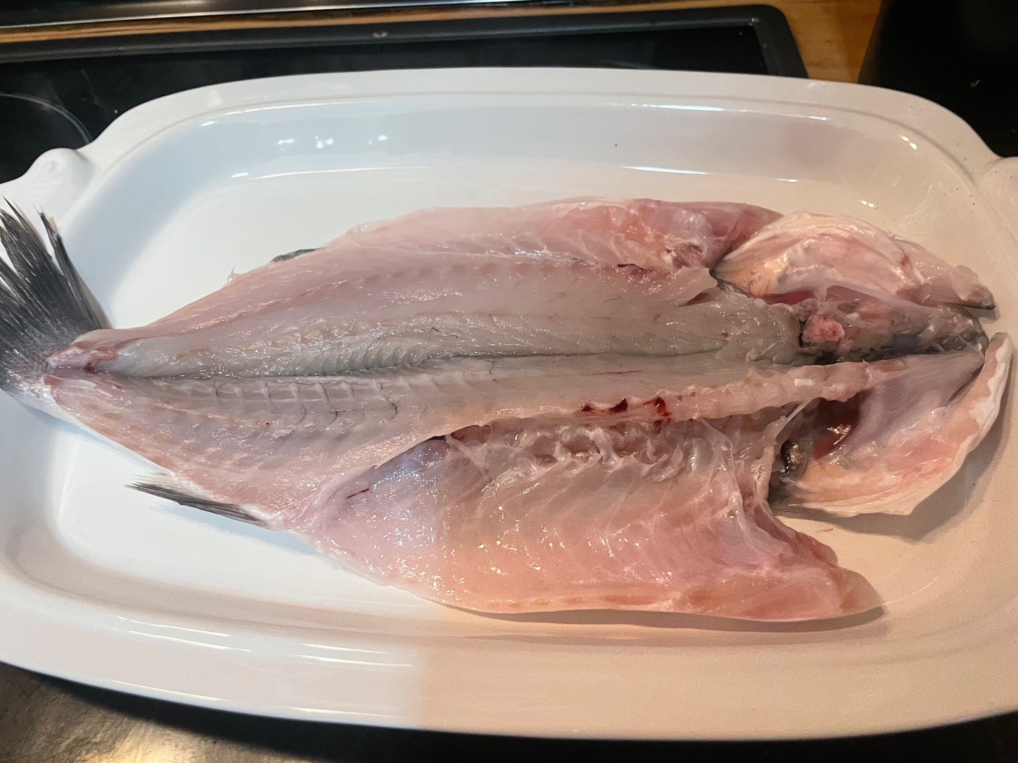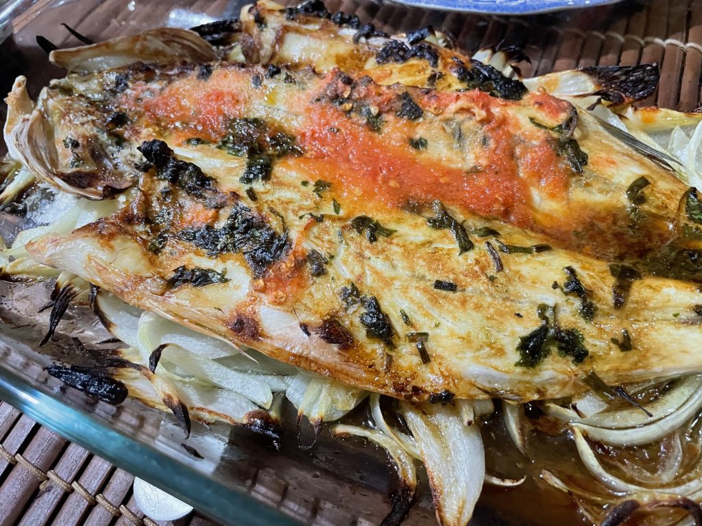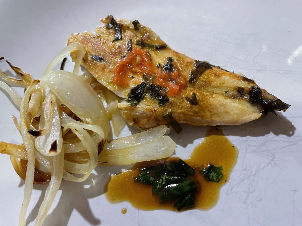 Y tenemos lista una lubina con nuestra receta inventada que esta deliciosa.