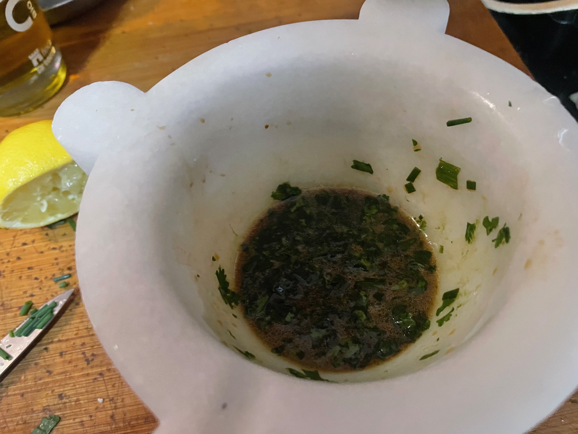 Machacamos, añadimos el aceite de oliva, zumo de limón, salsa de soja y las hierbas