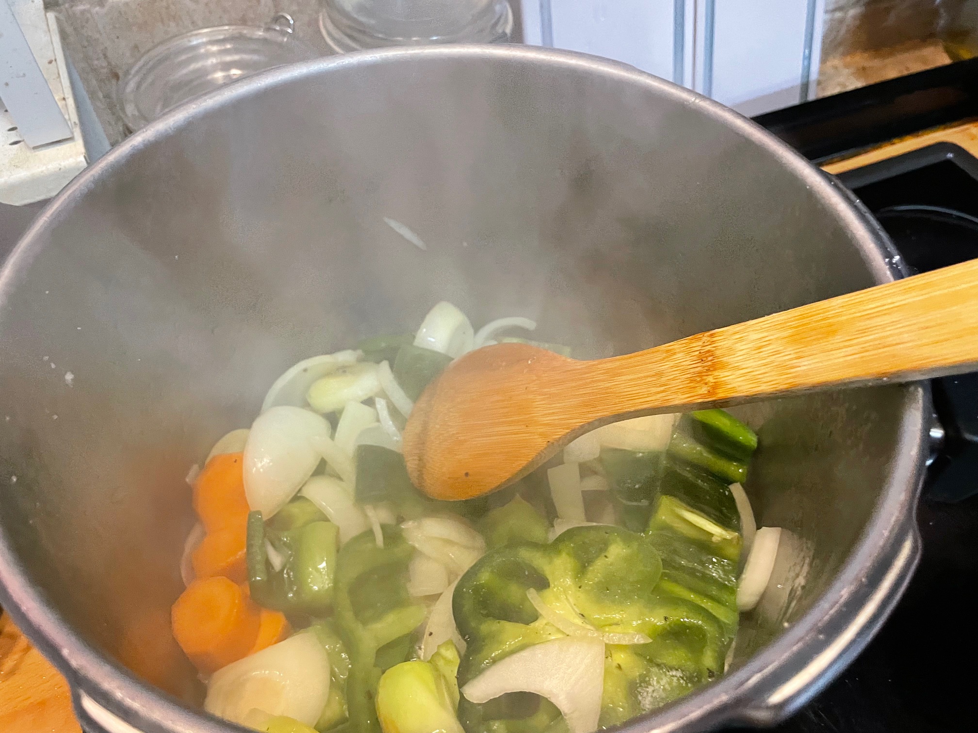 Pochamos las verduras en la olla ( no las hemos picado, porque las pasaremos por la batidora)
