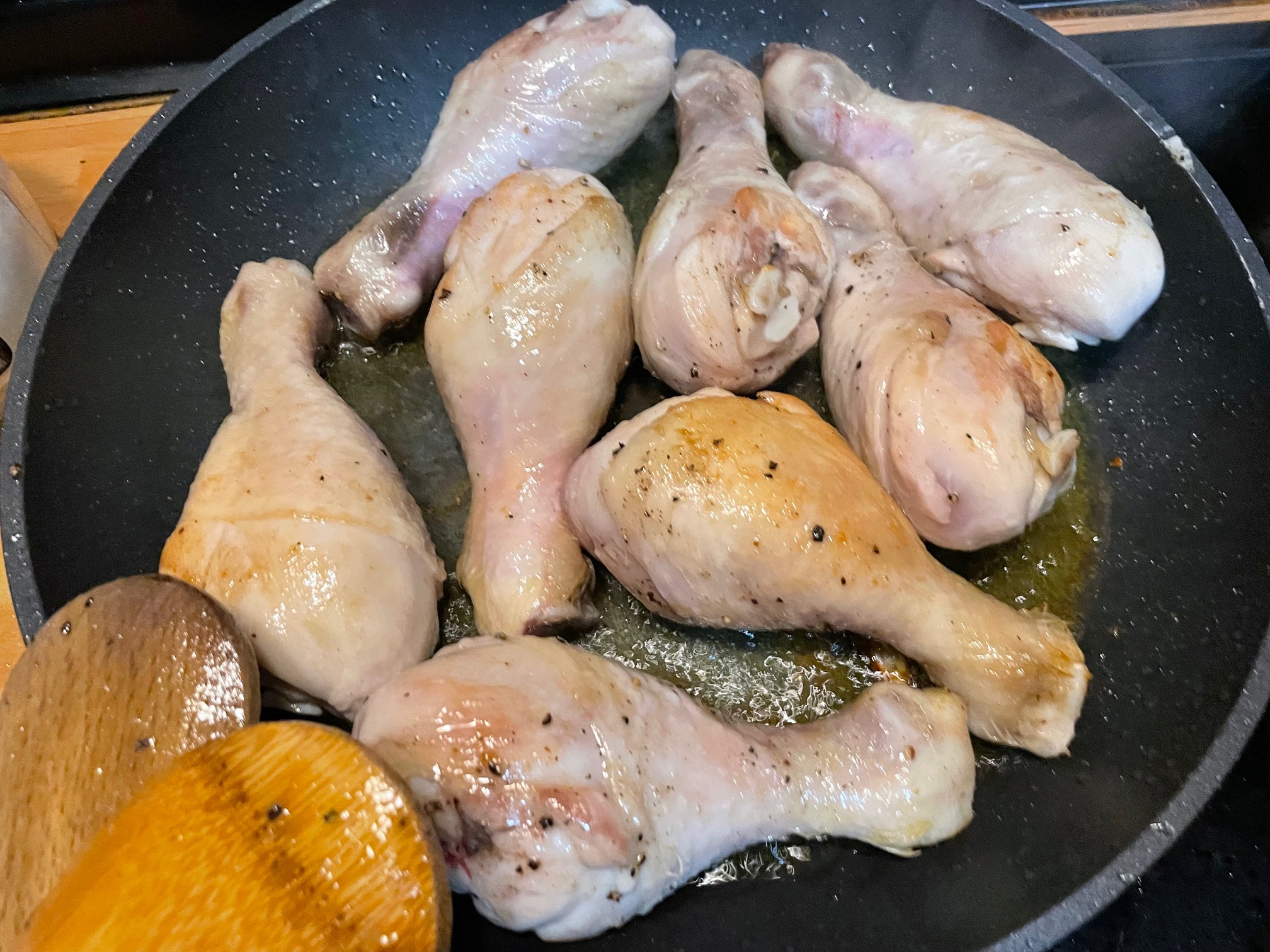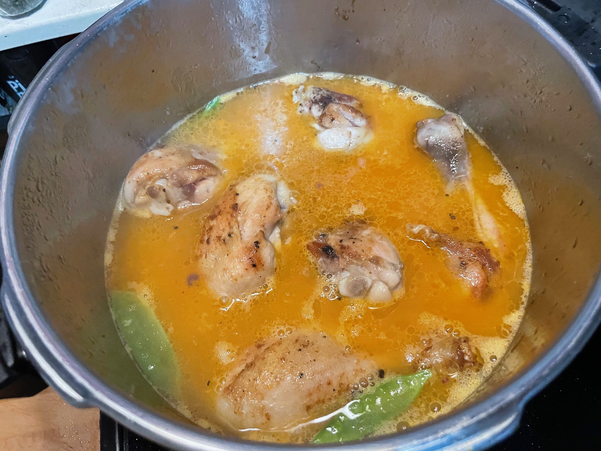 Cuando evapora el vino y estén bien dorados los muslos los incorporamos a la olla, cubrimos de agua