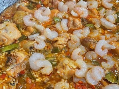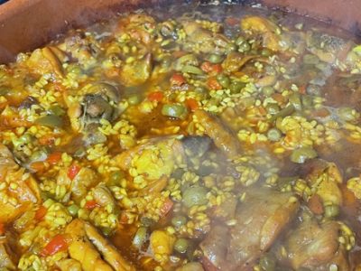 Este año nos hemos decantado por un arroz con pollo de corral, judías verdes, cebolla y pimientos verdes de su propia huerta.