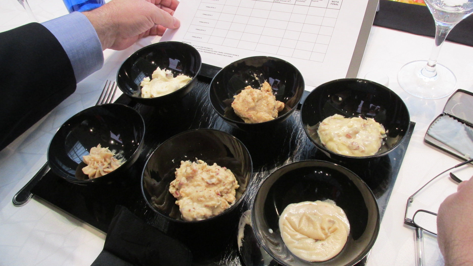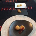 El jurado, presidido por José Gómez estuvo formado por los periodistas Juanma Bellver, que nunca deja de impresionarme por su vasto conocimiento y Julia Pérez Lozano, el gastrónomo Francis Vega y los prestigiosos cocineros Francis Paniego y Nacho Manzano puntuó en una cata a ciegas las seis bechamel utilizadas y las seis croquetas atendiendo a muy distintos criterios, desde la presentación, al sabor. Todos ellos atesoraron sabiduria valorando la cremosidad o el rebozado, la integración del sabor del jamón, el equilibrio entre los distintos componentes, la fritura. Os puedo asegurar que ha sido una puntuación a conciencia y con mucho fundamento el que ha esgrimido el jurado. Durante los tiempos muertos hemos hablado de la importancia de la utilización de la sal atendiendo al grado de curación del jamón, de la actual tendencia, a veces engañosa, de presentar las croquetas demasiado liquidas o de como comerlas (siempre con la mano). Creo que ha resultado interesante la experiencia para todos.