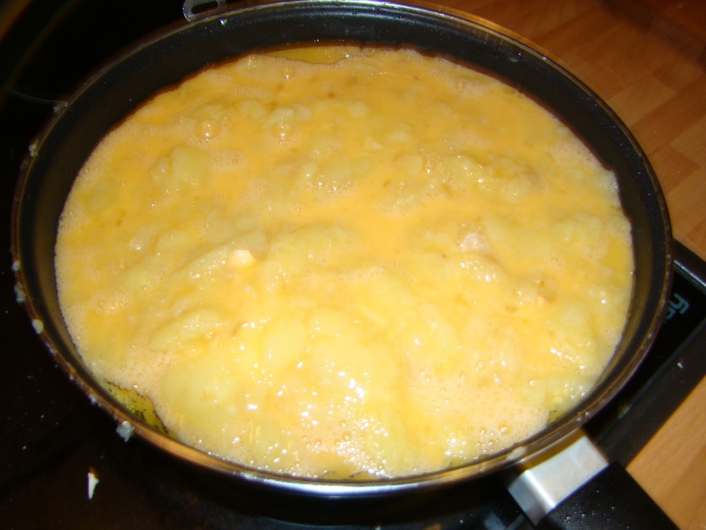 Escurro las patatas de aceite y las mezclo con los huevos y a la sartén