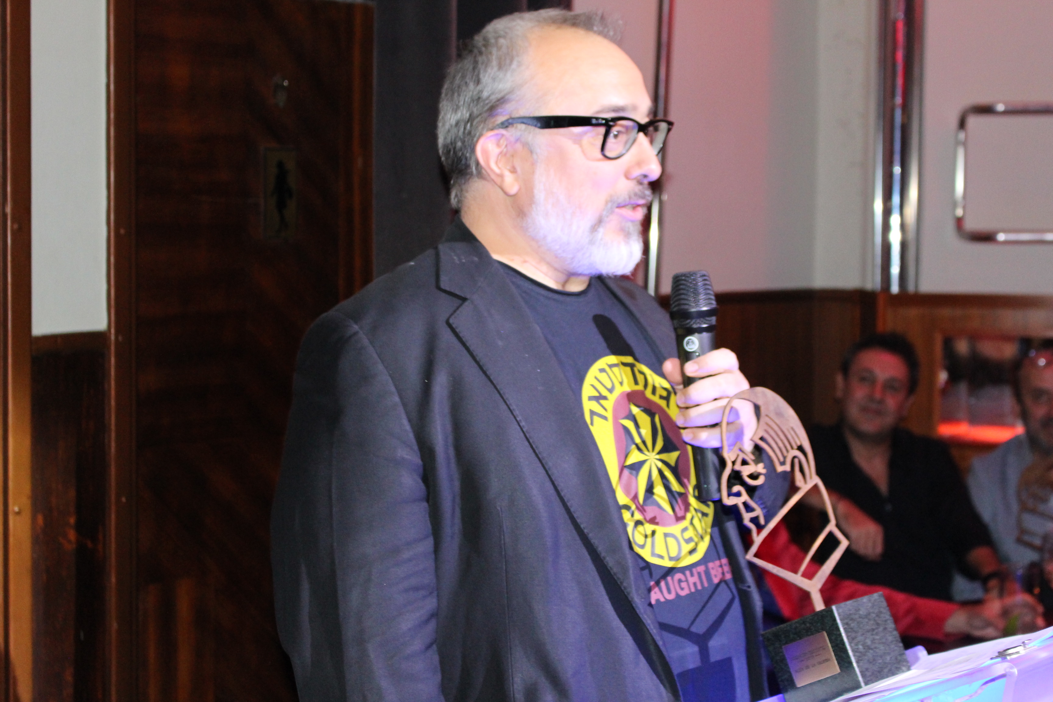 El director de cine Álex de la Iglesia recibió el galardón de manos del actor Hugo Silva, y destacó que el Chicote es el sitio “demencial por excelencia” al que debe también parte de sus inicios, pues fue en una de sus mesas donde comenzó a escribir al llegar a Madrid, vivía en una pensión cercana y era su lugar de inspiración.