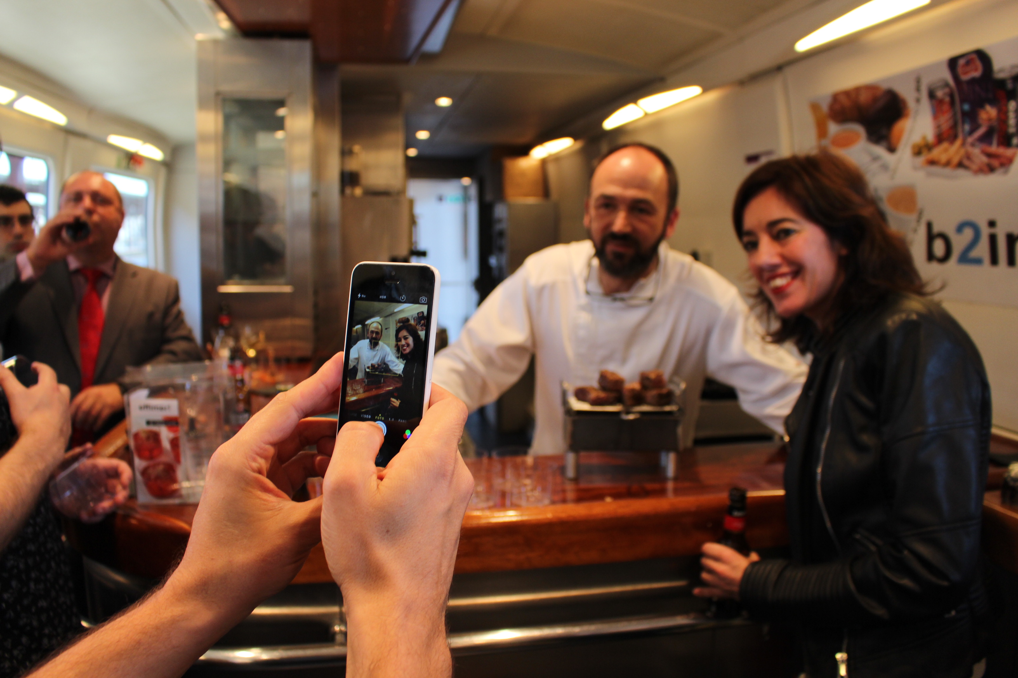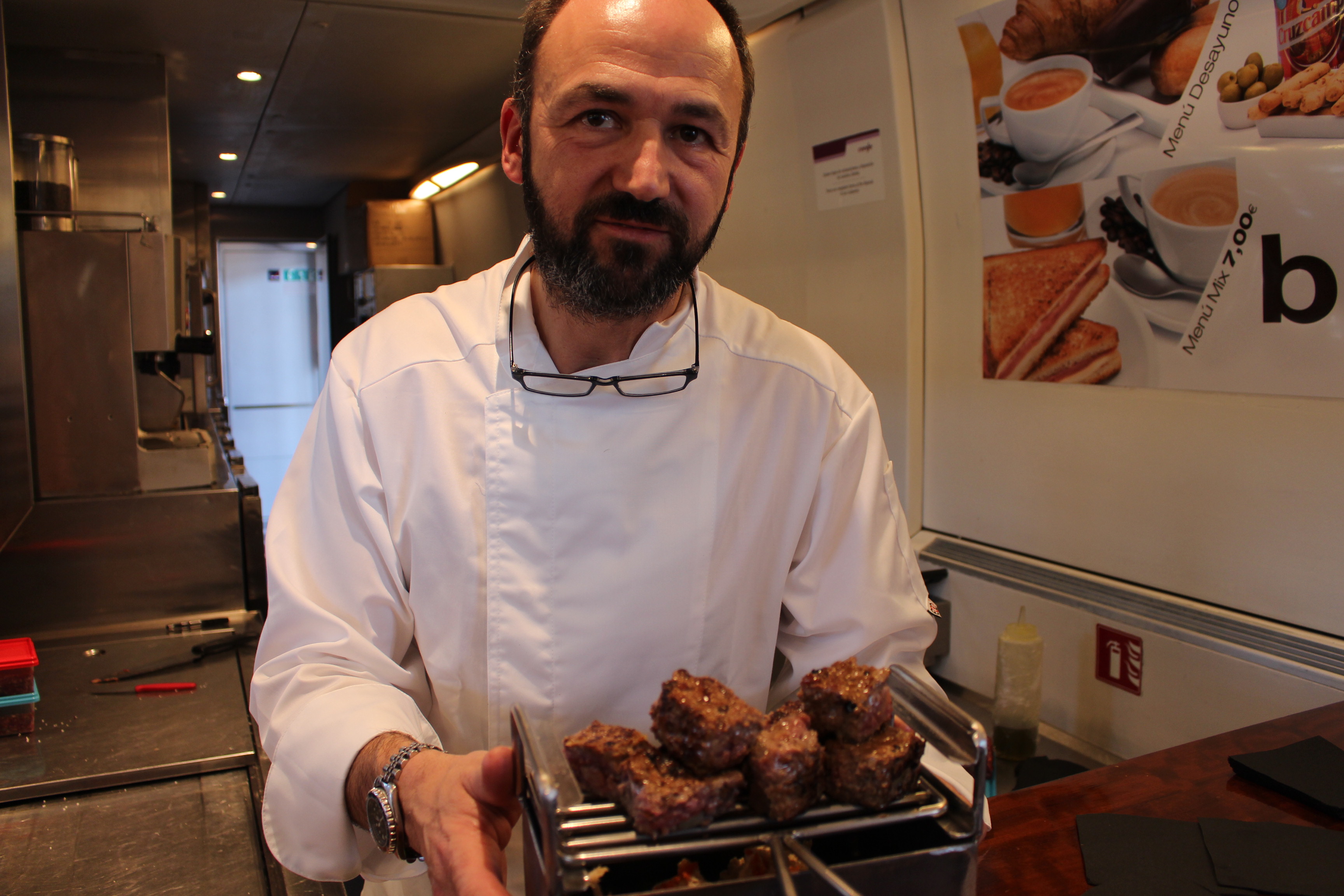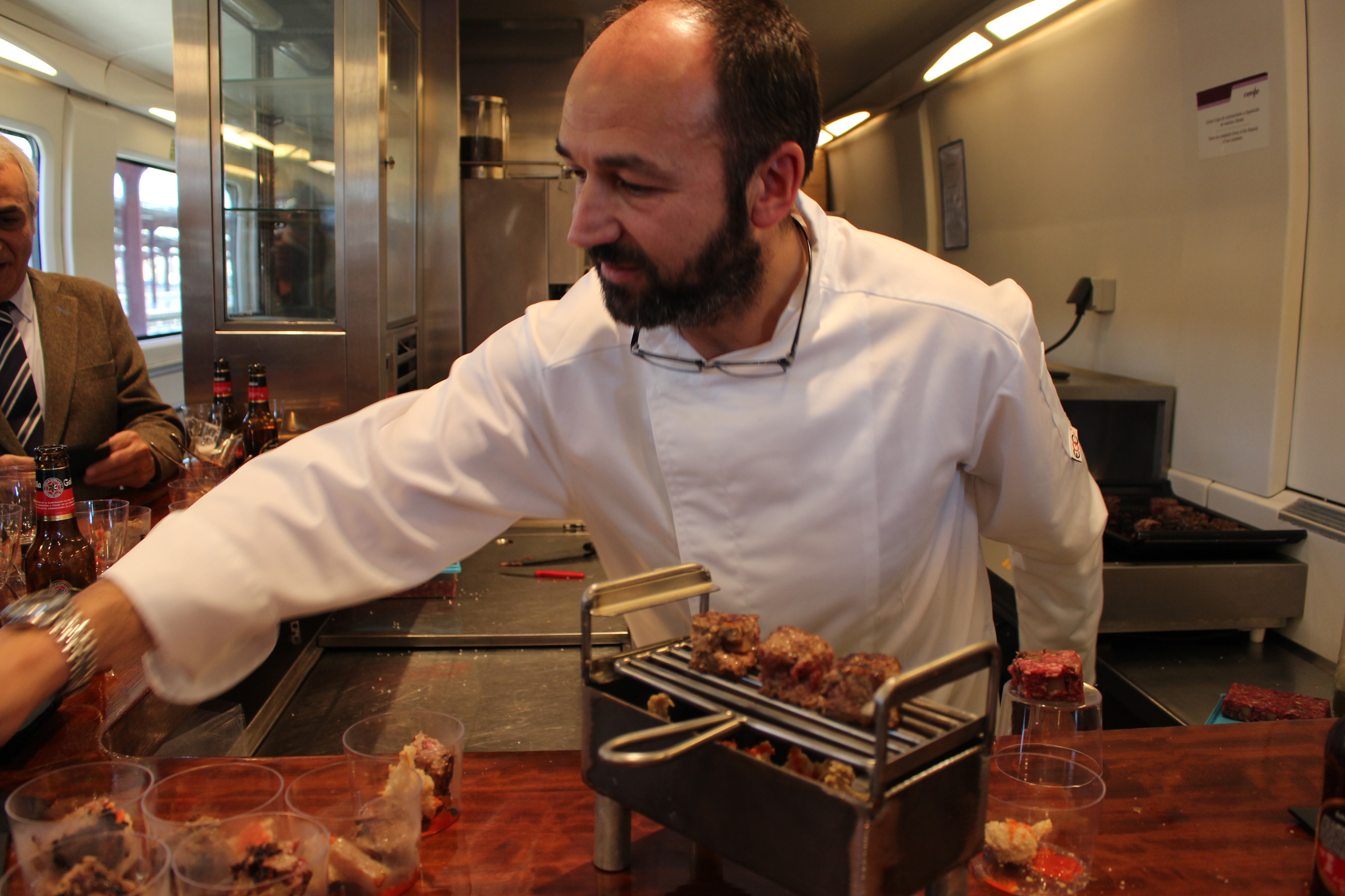 Durante la presentación del evento mi querido cocinero y representante de lo mejor de la gastronomía compostelana, Siro González elaboró unos pinchos de carne de cabra preparados en el vagón de la cafetería del tren Alvia, armonizados con vinos gallegos.