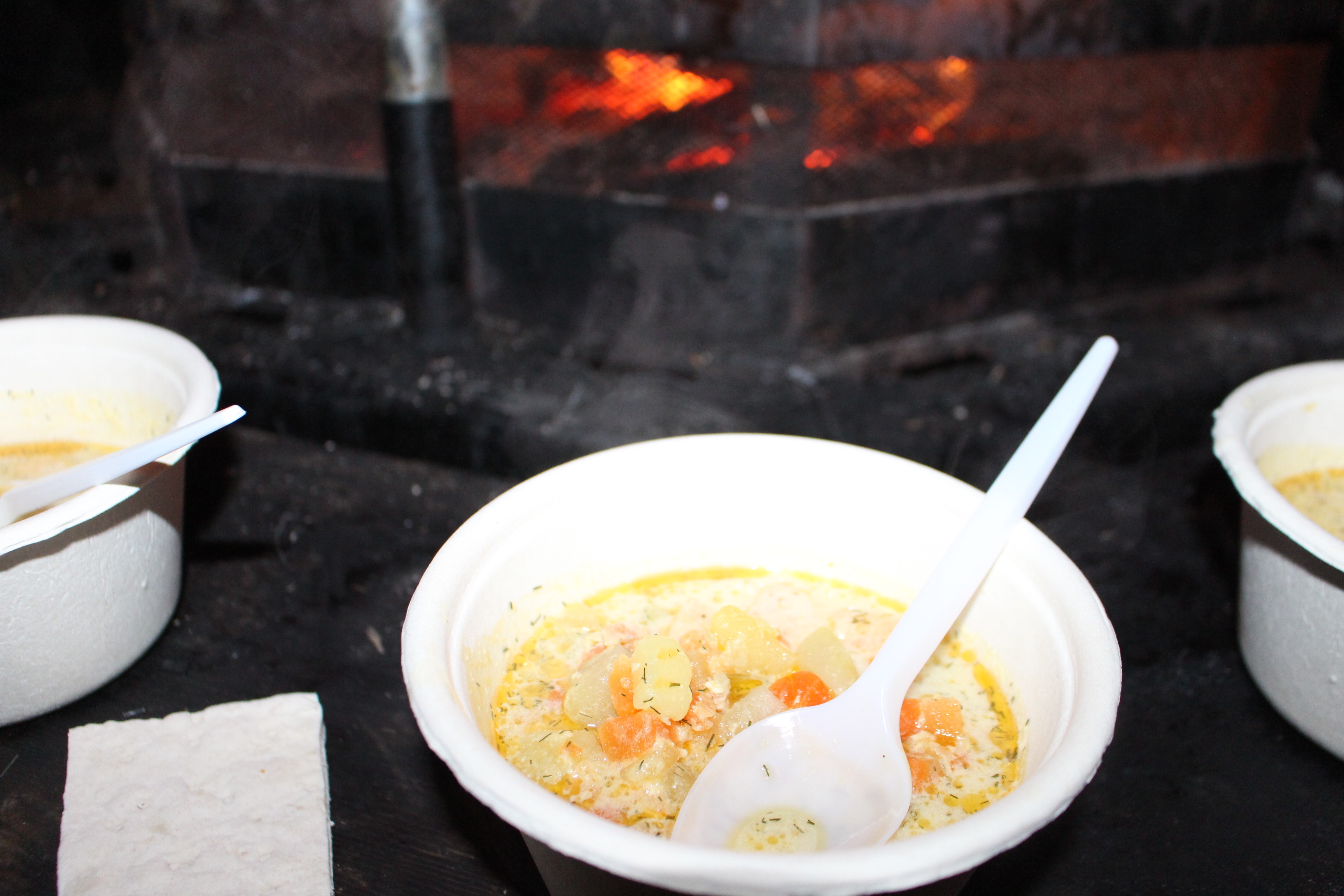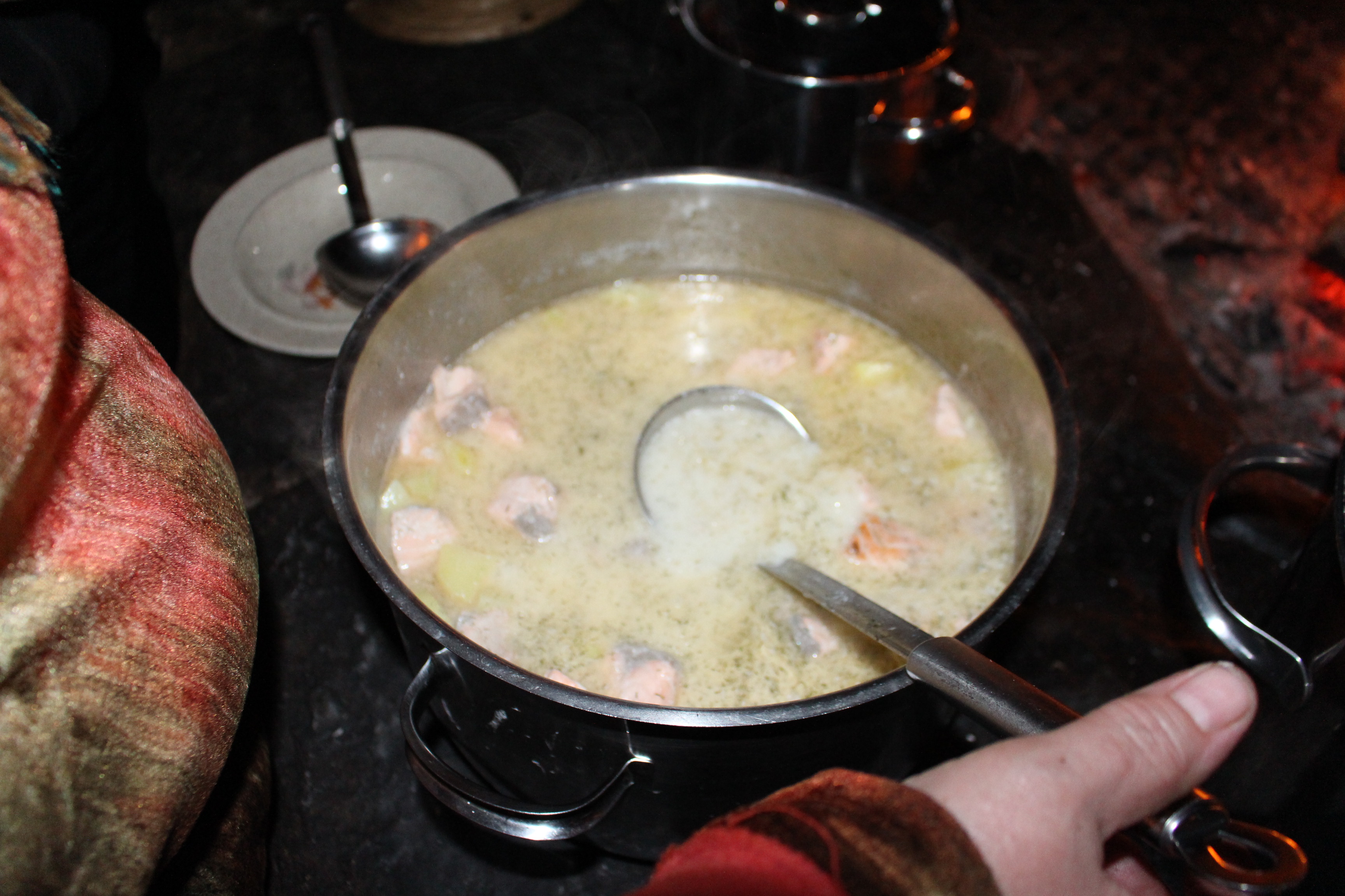 Las jornadas me resultaban agotadoras. Menos mal que los amables samis, en sus acogedoras cabañas me recofortaban con su suculento «Lohikeitto», una apetitosa sopa de salmón y patata como base del plato, elaborada al fuego, que en ocasiones puede ir acompañada por verduras, fundamentalmente zanahoria.