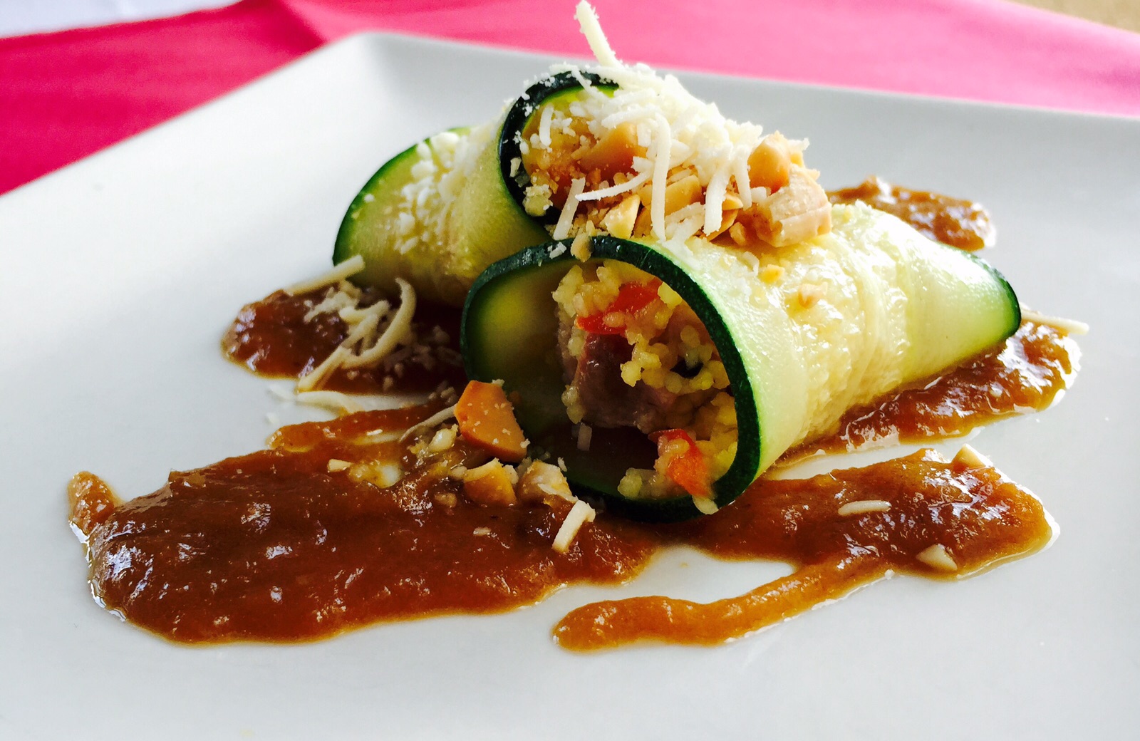 • Casa Paulino: Canelón de calabacín relleno de cous-cous de pavo sobre salsa de cebolla.