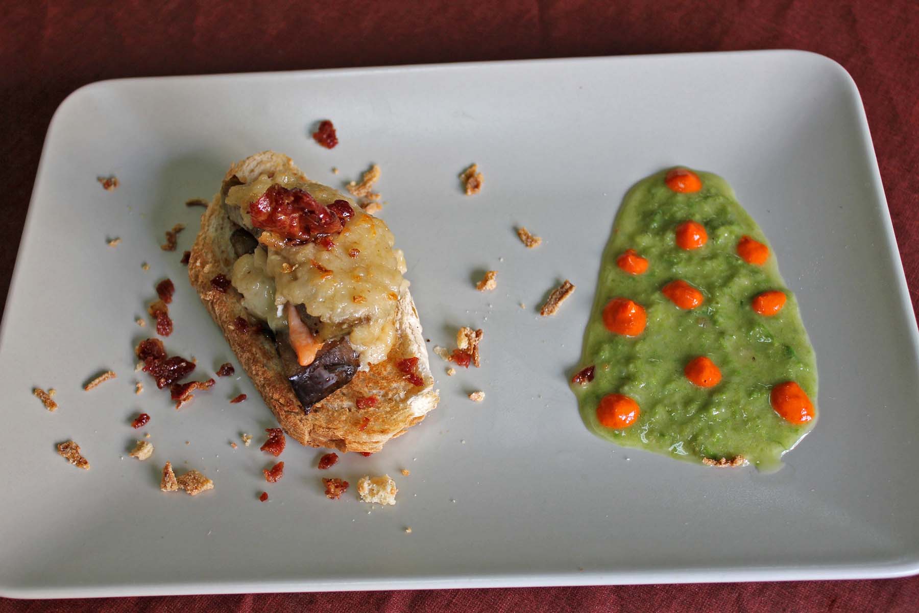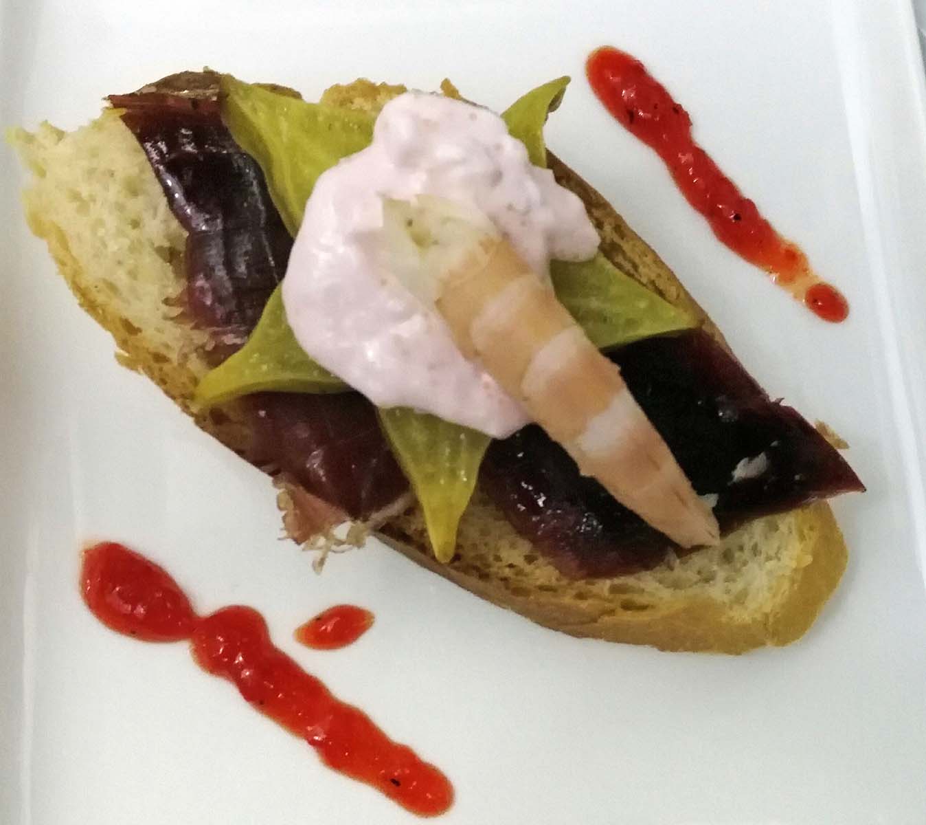 • Cristóbal: Bechamel de gambas sobre libro de berenjena, salmón y queso brie con crujiente de jamón y coulis de trigueros y piquillos.