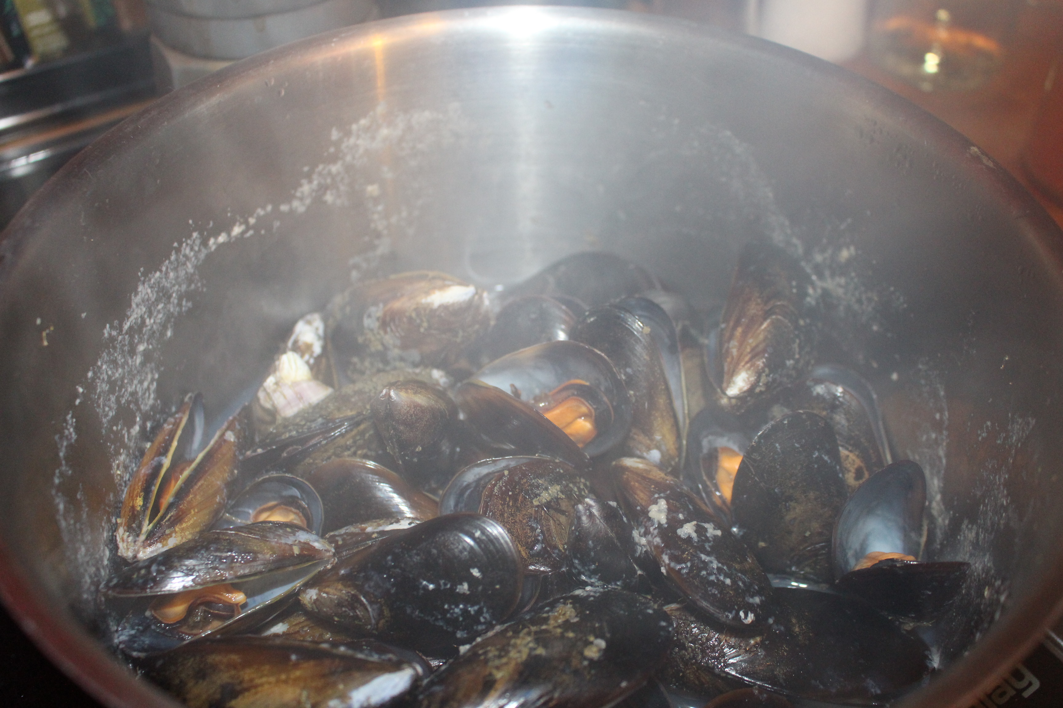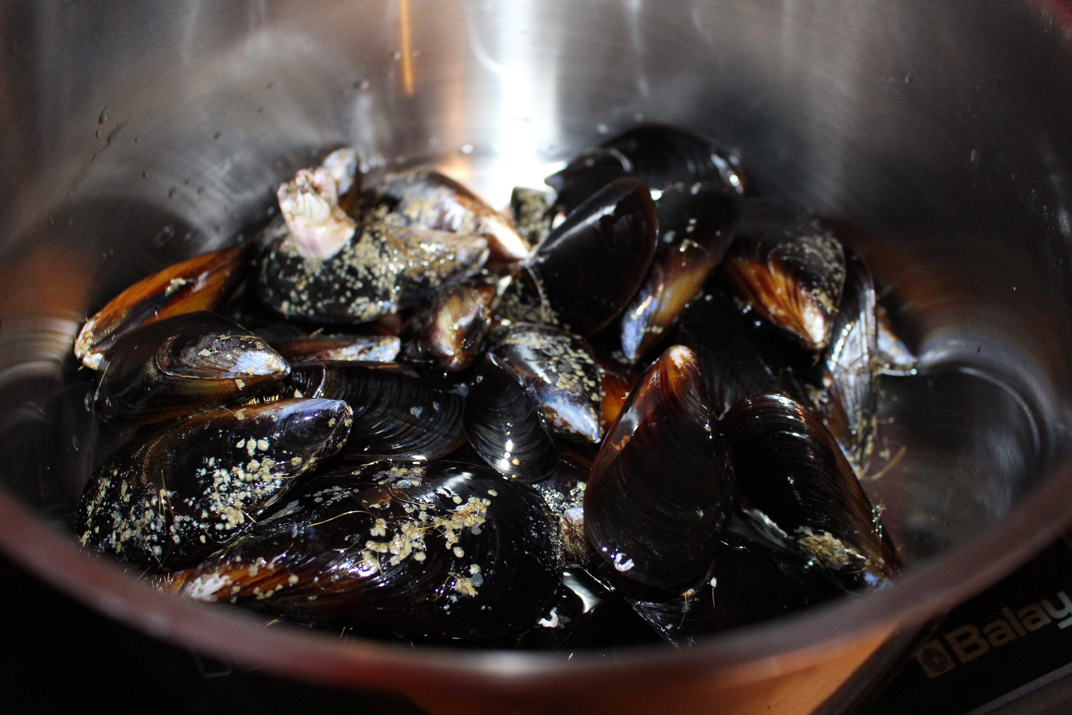 Limpio bien los mejillones, los coloco en una cazuela con dos dedos de vino blanco de calidad media, tapo la olla hasta que se abren, cuando están abiertos añado pimentón de la Vera, picante y un poco de dulce. Con la olla tapada la remuevo y listo.