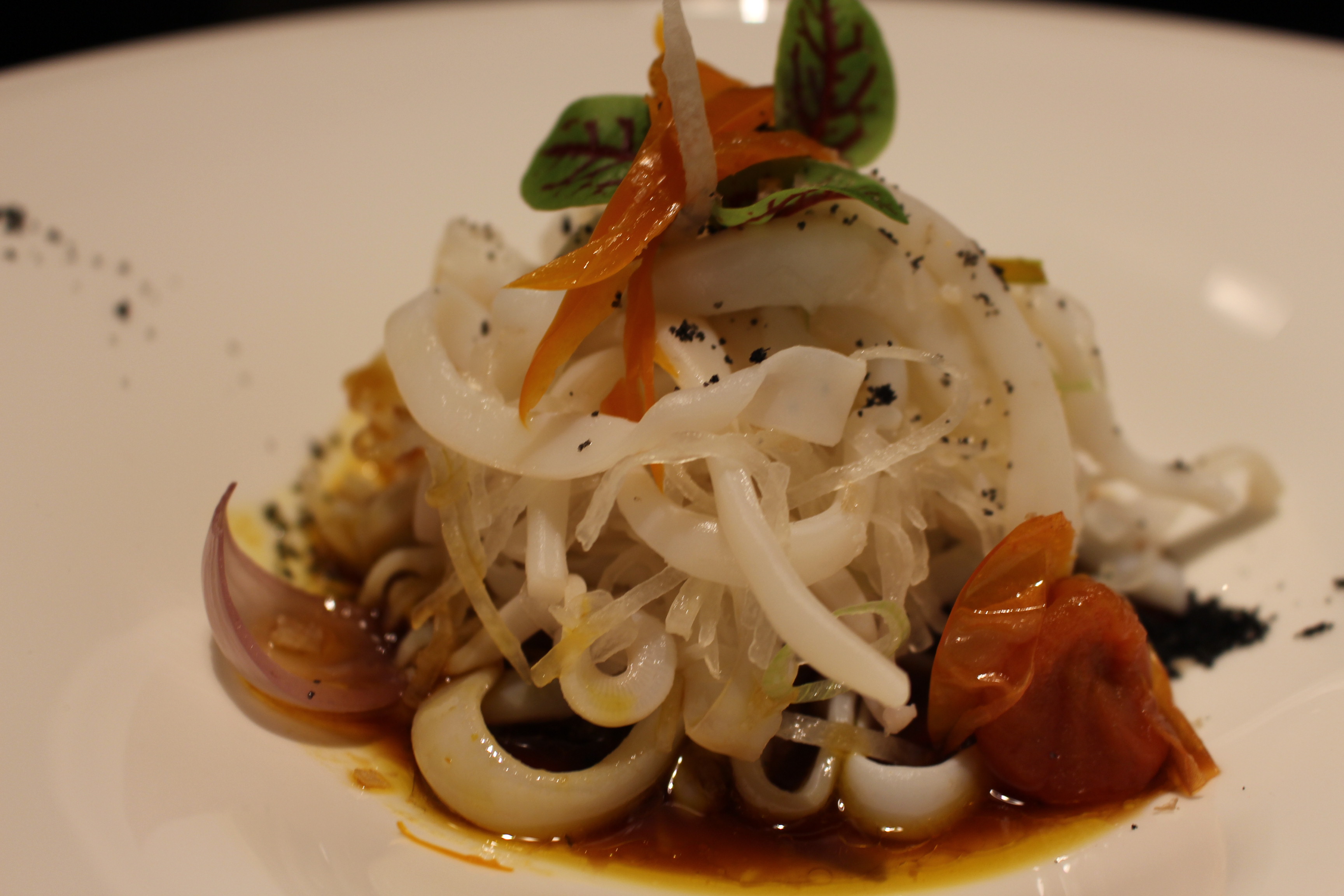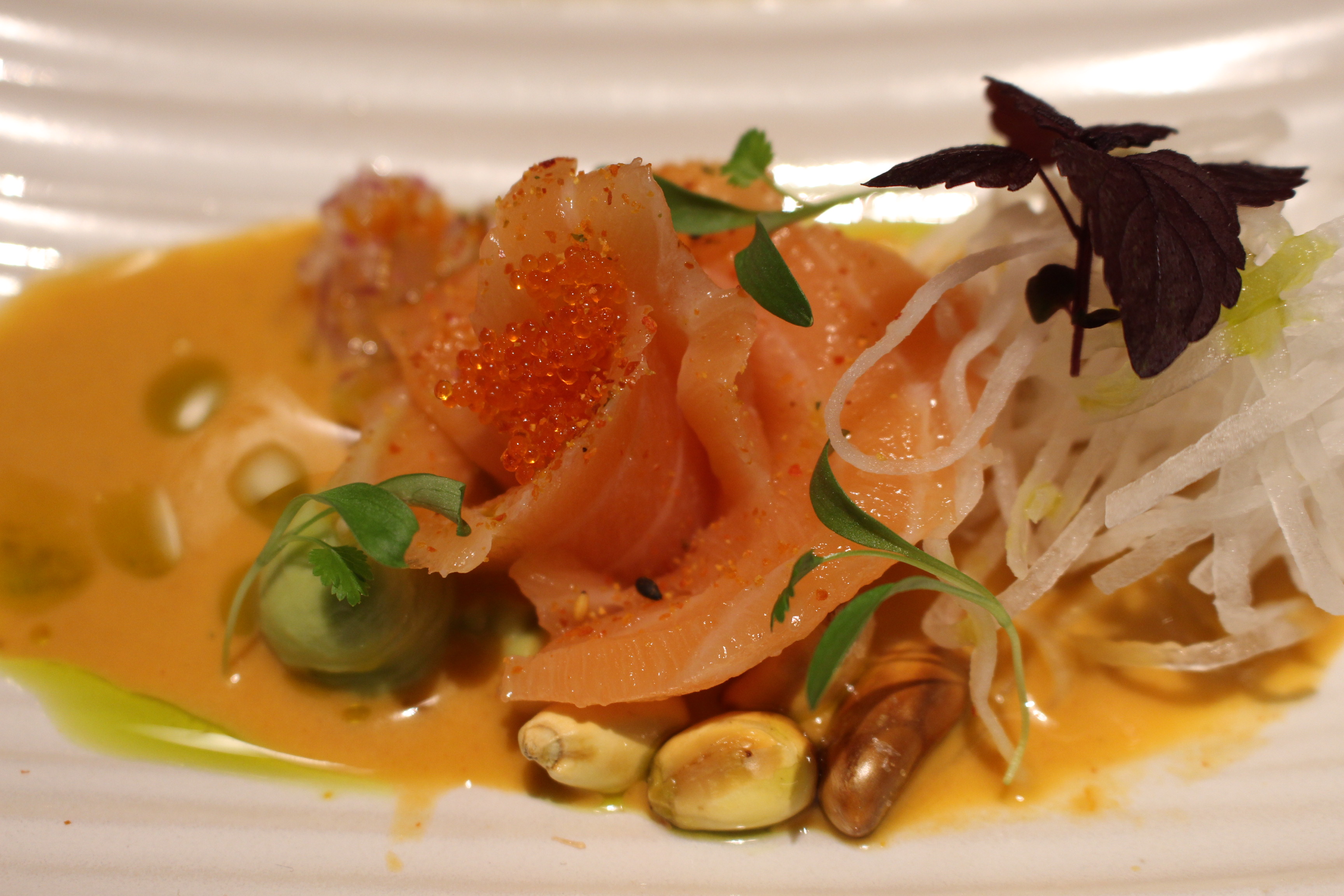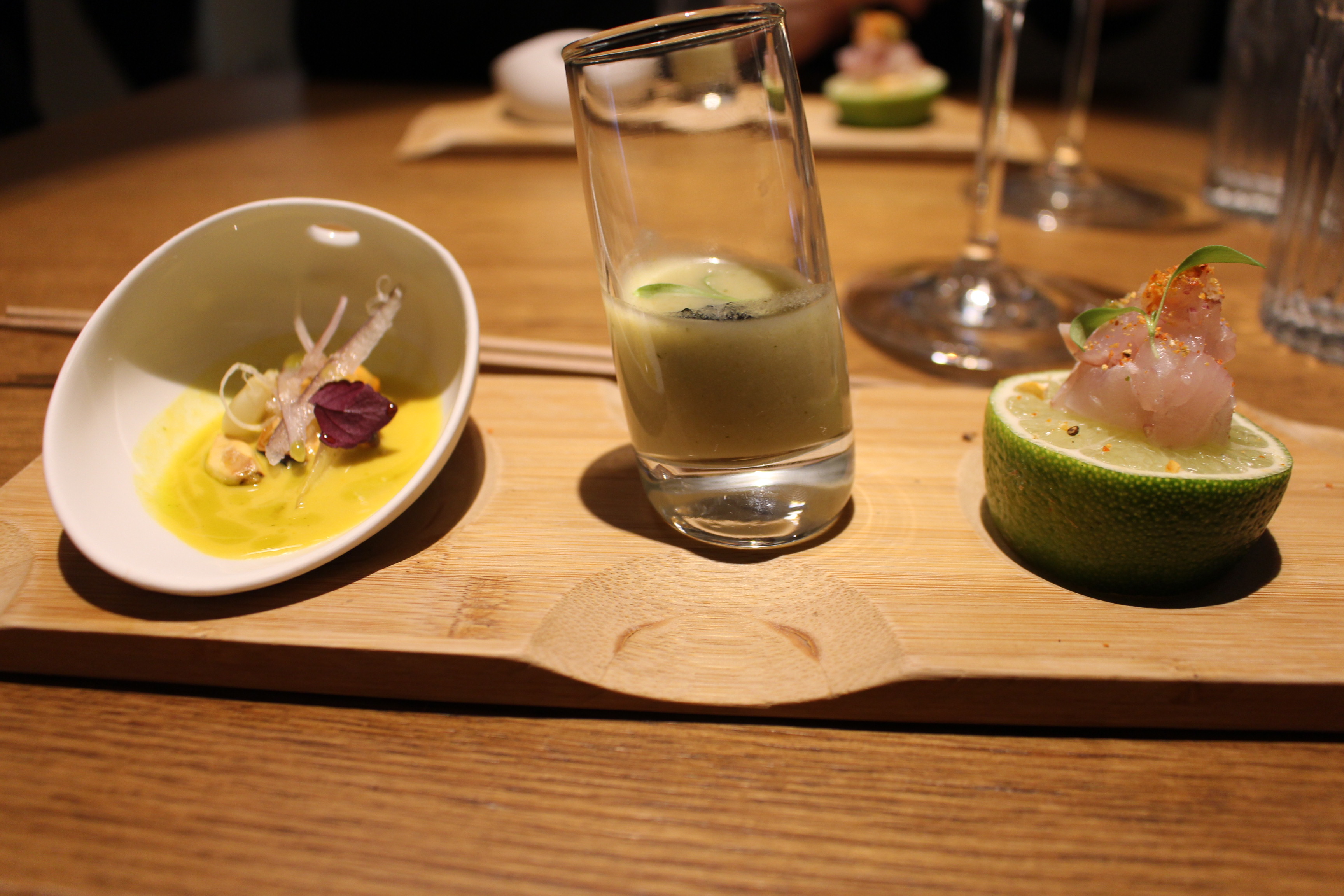 Os puedo decir que el menú me encanto, que encontré a un Luis más evolucionado que nunca, la estética de los platos te invita a disfrutarlos, llenos de matices, combinaciones de sabores, picantes, ácidos, refrescantes, muy cuidados. Os destacaría todas las propuestas y en especial el salmonete marinado en ajo, jengribre y pisco con aceite de sésamo caliente o el ceviche de mejillón con leche de tigre, una delicia.