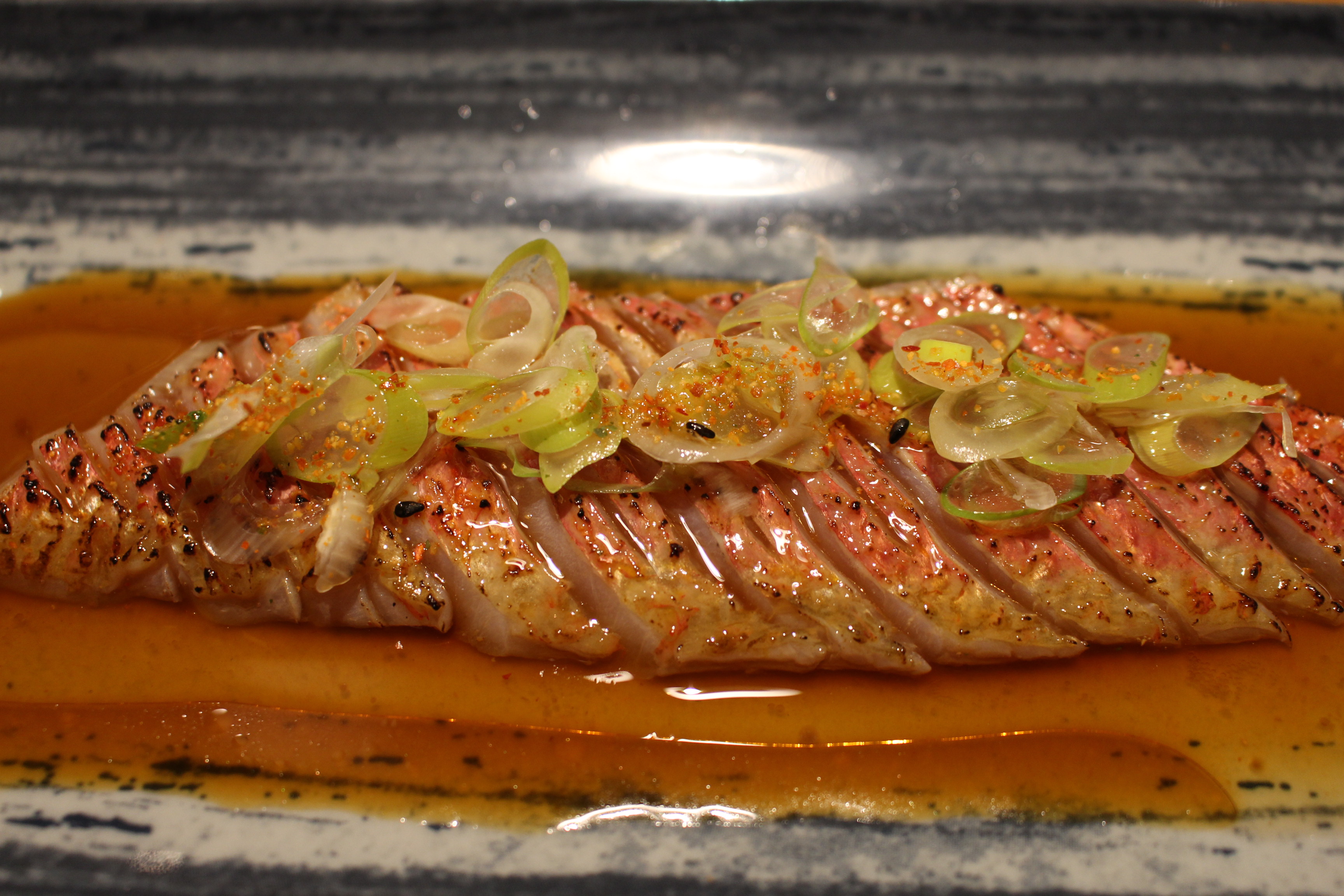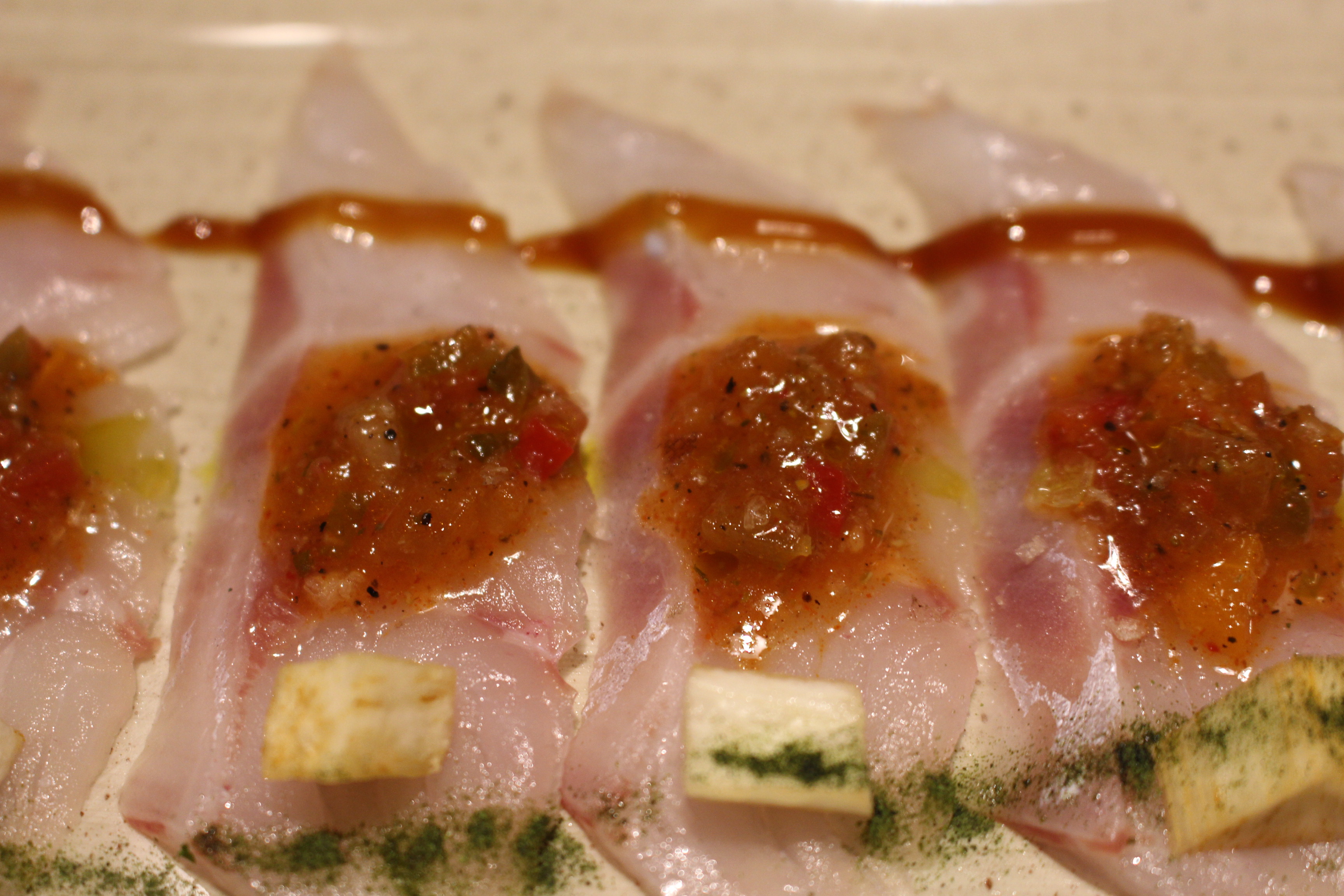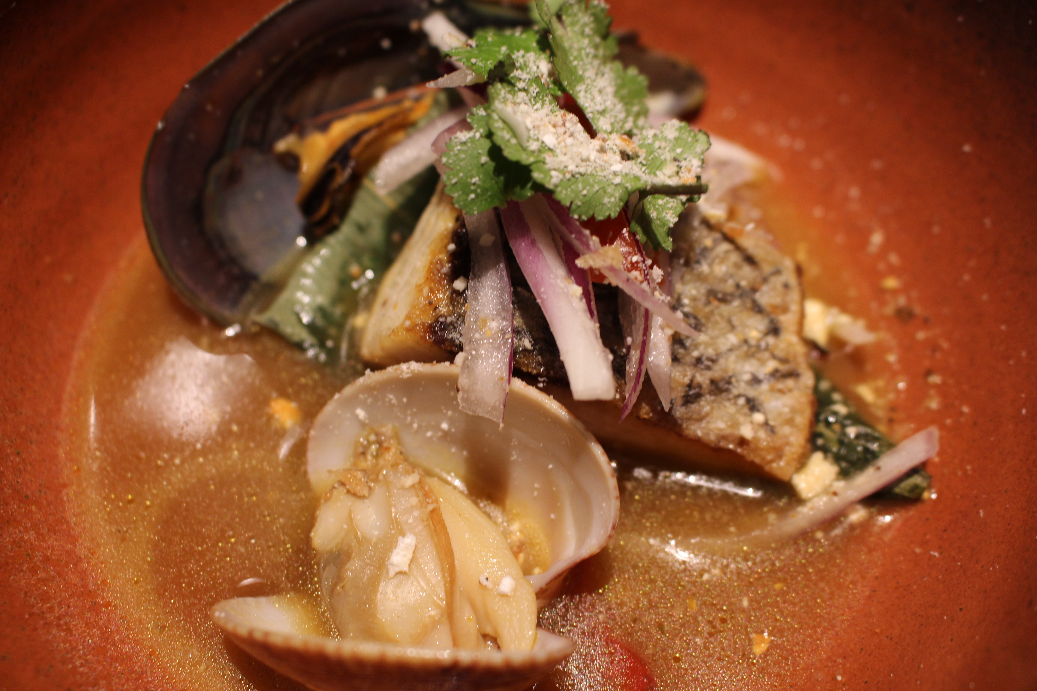 Os puedo decir que el menú me encanto, que encontré a un Luis más evolucionado que nunca, la estética de los platos te invita a disfrutarlos, llenos de matices, combinaciones de sabores, picantes, ácidos, refrescantes, muy cuidados. Os destacaría todas las propuestas y en especial el salmonete marinado en ajo, jengribre y pisco con aceite de sésamo caliente o el ceviche de mejillón con leche de tigre, una delicia.