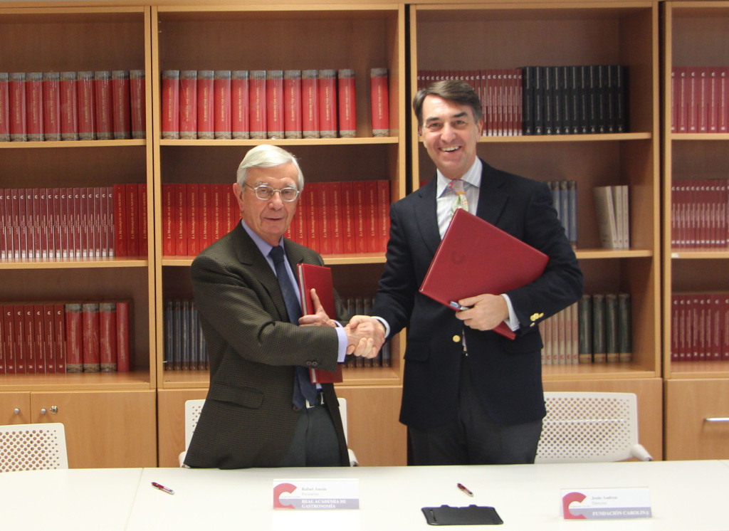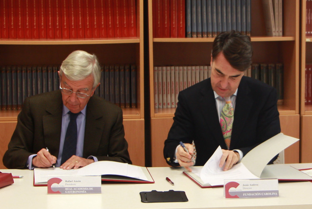 El presidente de la Real Academia de Gastronomía, Rafael Ansón, y el director de la Fundación Carolina, Jesús Andreu, firmaron ayer un acuerdo de colaboración para desarrollar conjuntamente actividades dirigidas a la difusión e internacionalización de nuestra dieta y gastronomía. El propósito del acuerdo consiste en proyectar la Marca España en aquellos aspectos ligados a la investigación, la vanguardia y la creatividad en dicho campo.