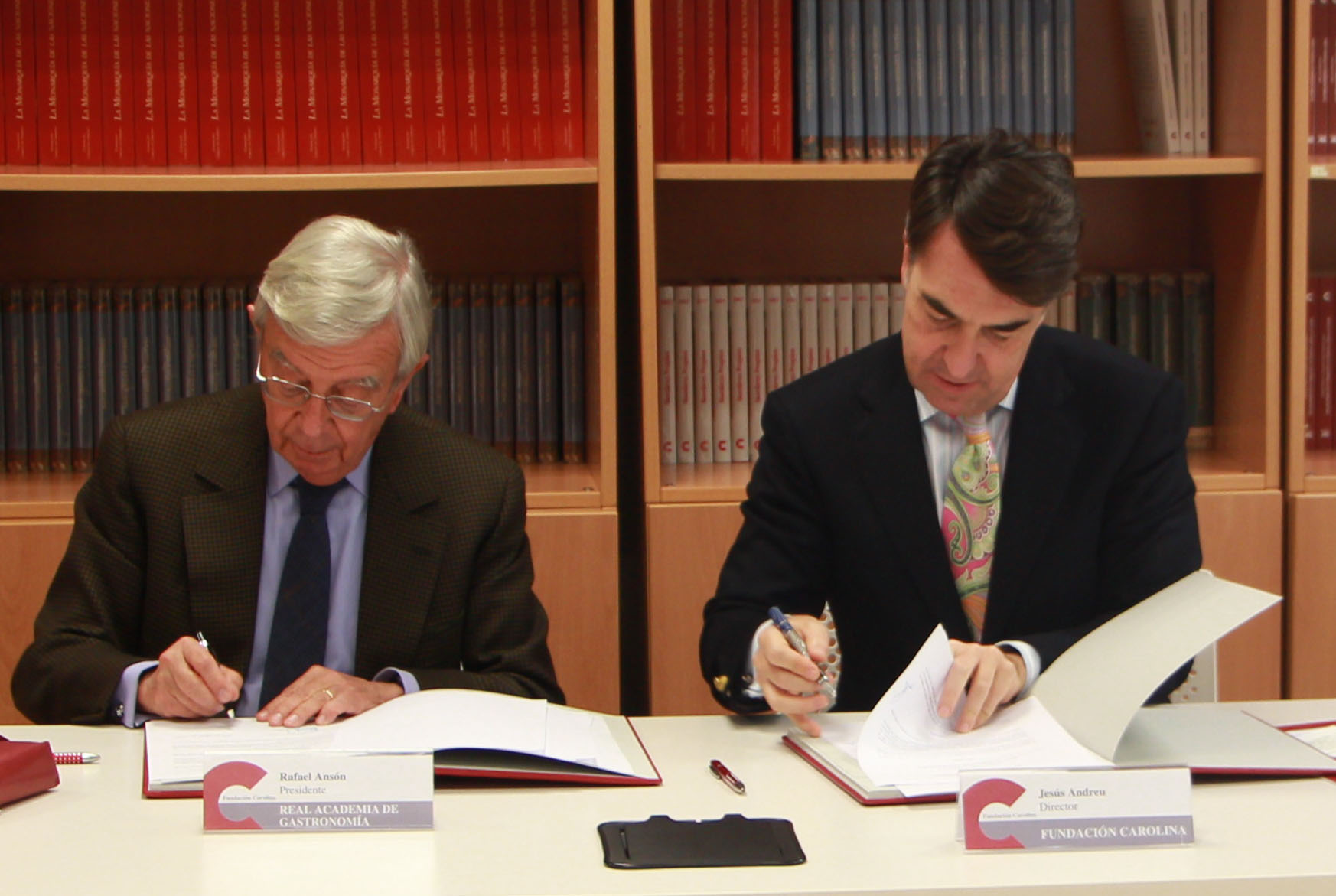 El presidente de la Real Academia de Gastronomía, Rafael Ansón, y el director de la Fundación Carolina, Jesús Andreu, firmaron ayer un acuerdo de colaboración para desarrollar conjuntamente actividades dirigidas a la difusión e internacionalización de nuestra dieta y gastronomía. El propósito del acuerdo consiste en proyectar la Marca España en aquellos aspectos ligados a la investigación, la vanguardia y la creatividad en dicho campo.