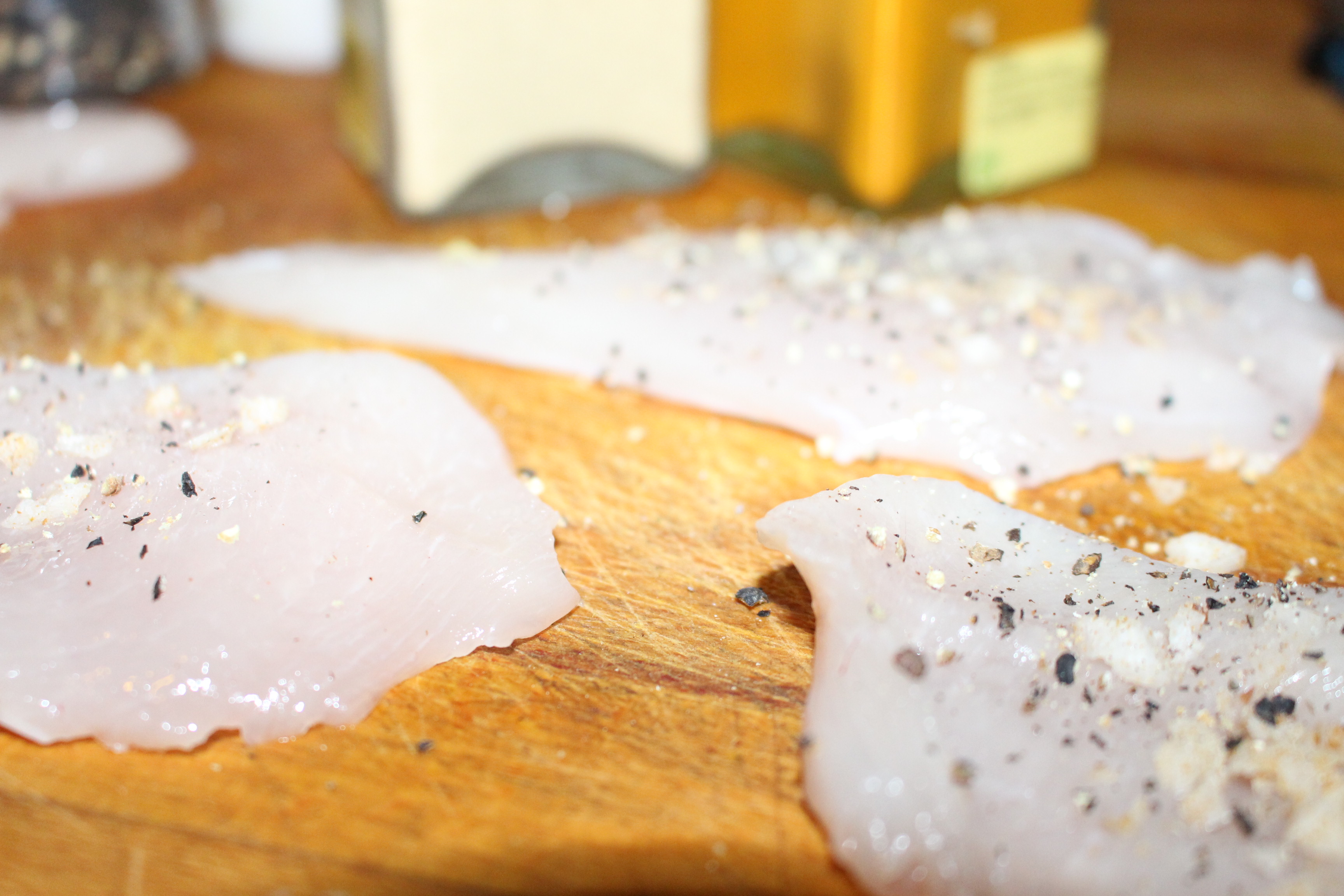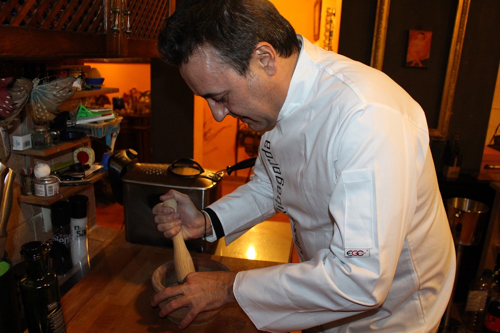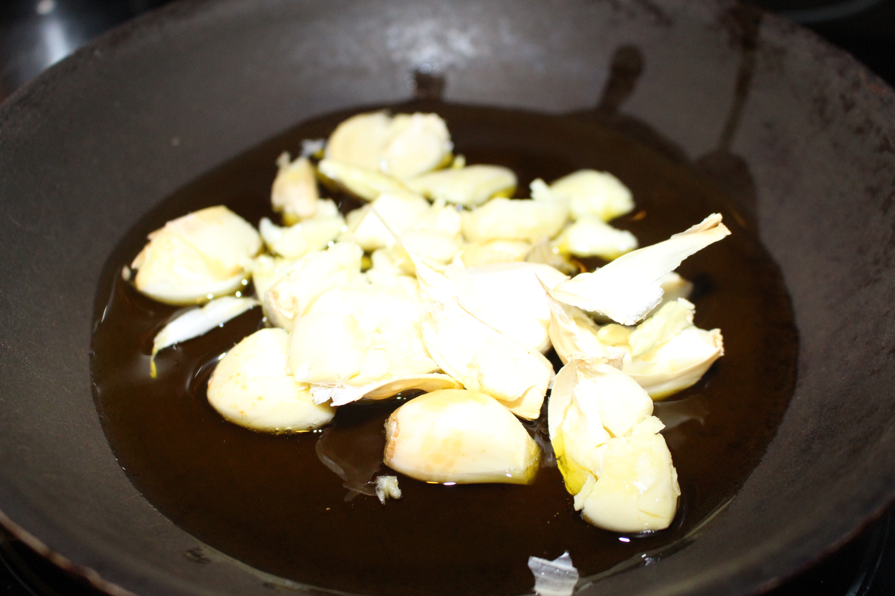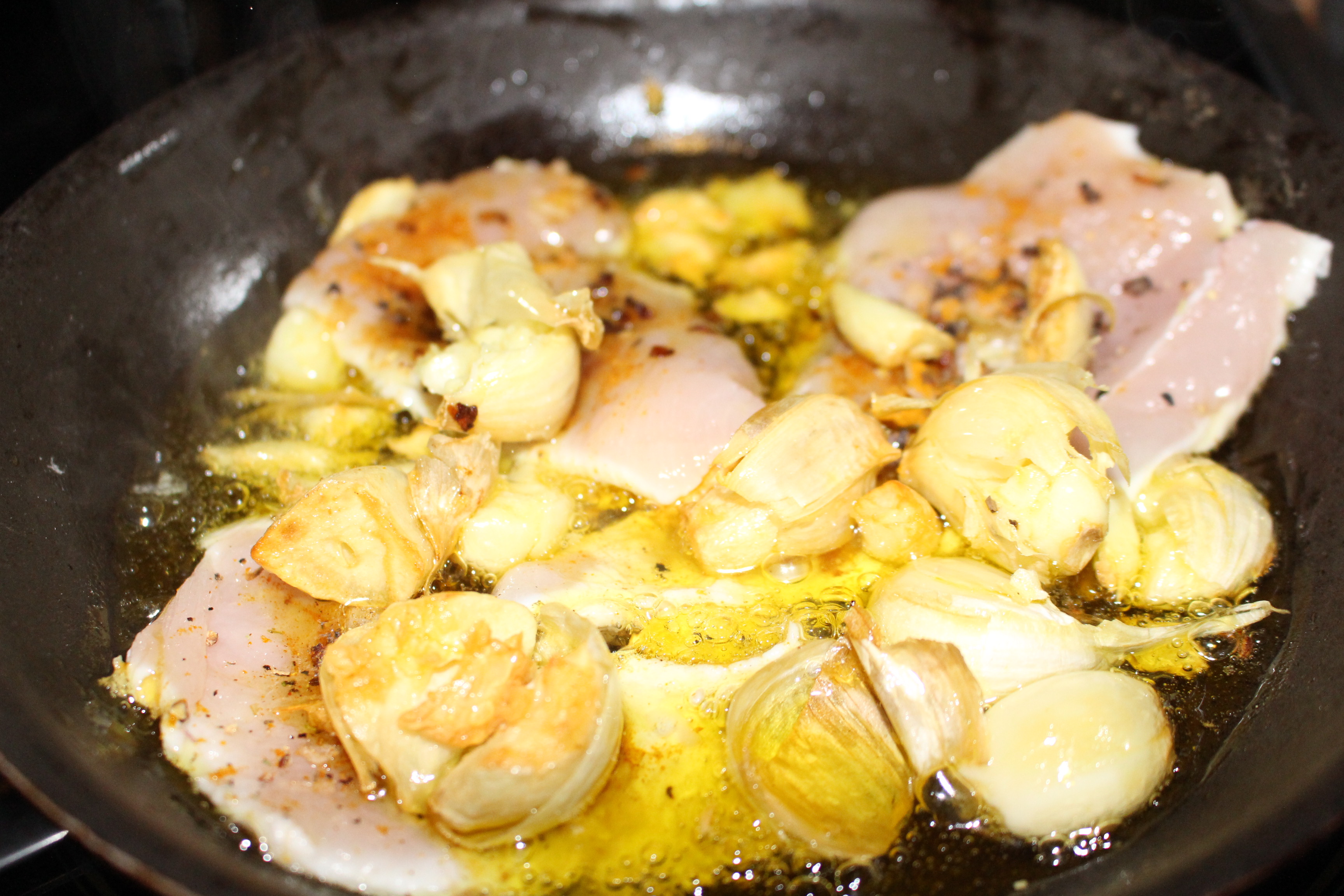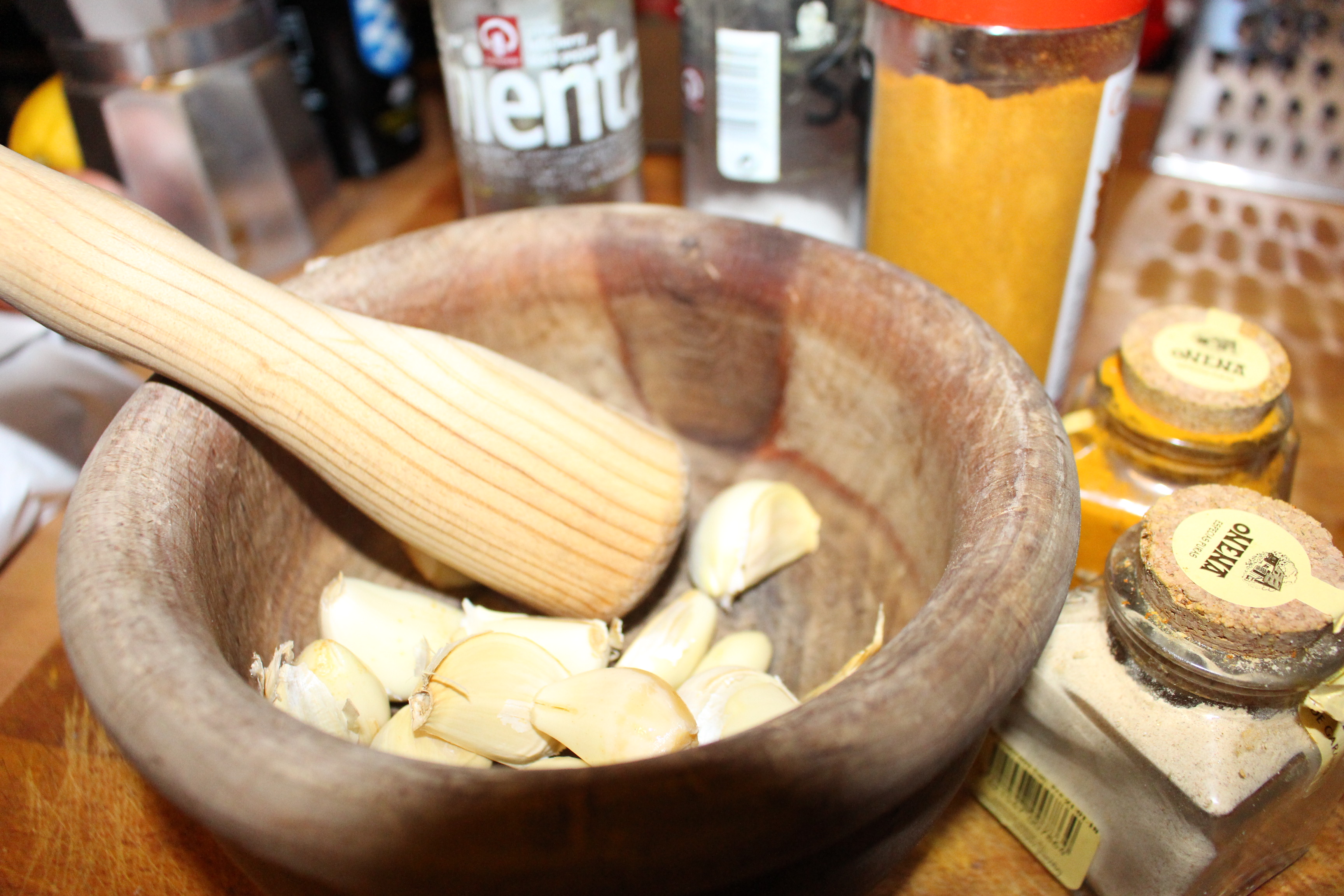 Con el mortero machaco unos ajos y los pongo en una sartén pequeña para que se llene de su sabor con un buen aceite de oliva. Mientras salpimento las pechugas y les voy añadiendo las especias. Una que me gusta especialmente es la cúrcuma que últimamente la utilizo mucho por eso de sus propiedades para la salud.