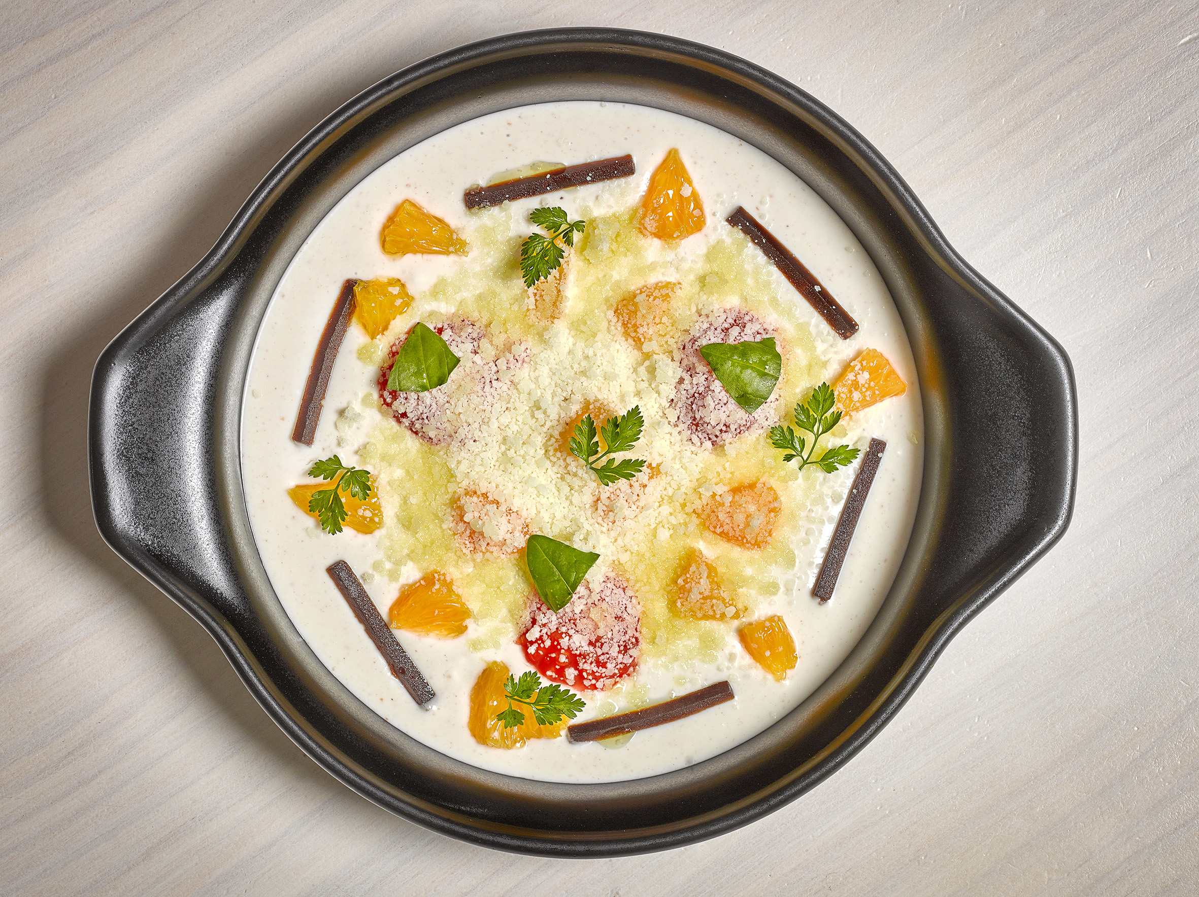 Altrapo Mazamorra de almendras, cous-cous de Idazabal, naranja y  vinagre