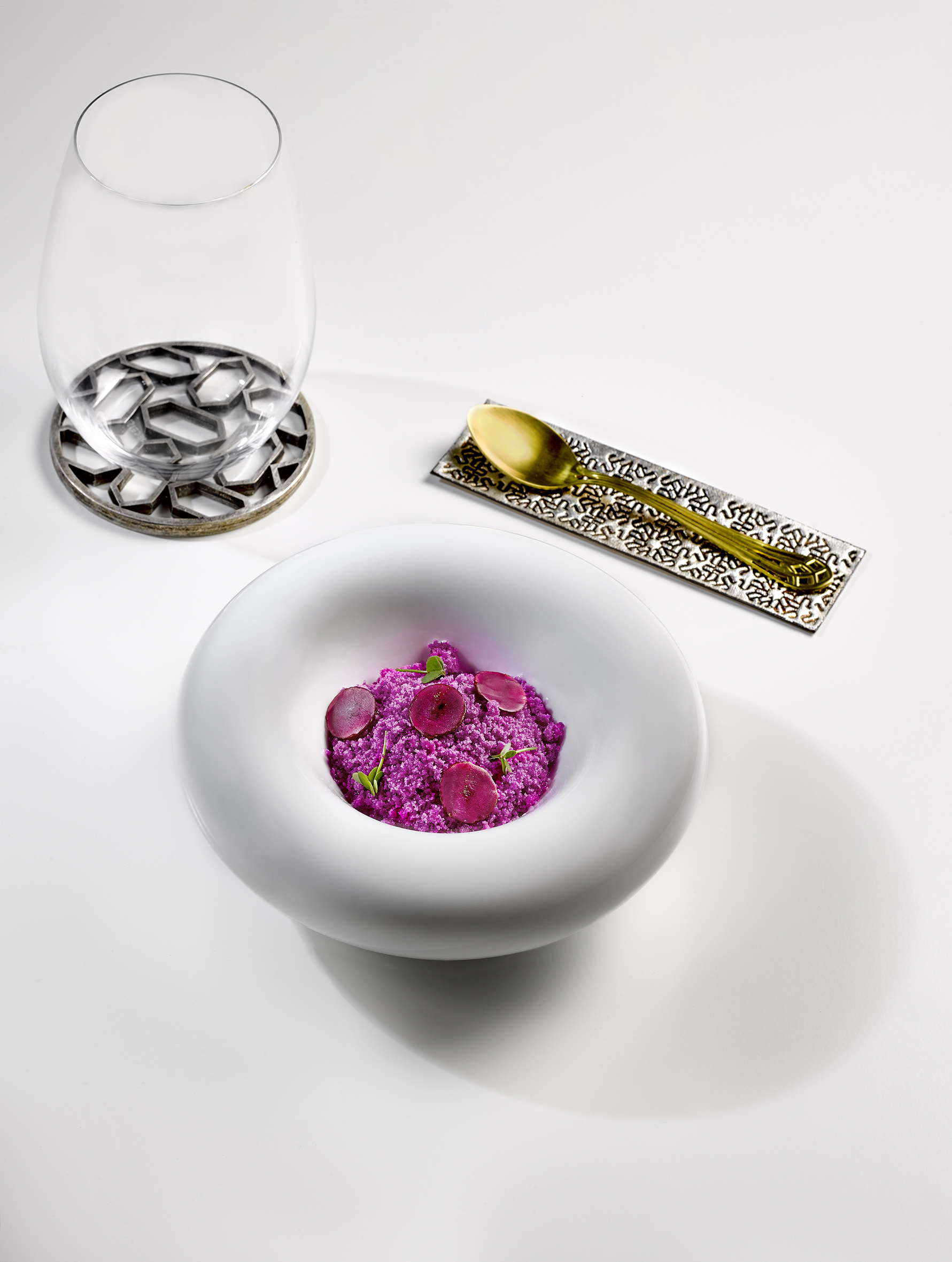 El resultado de todo este proceso creativo son platos tan sugerentes y evocadores como Pepino de la Sabana con Shanklish y menta, Karim de piñones, melón de primavera, erizo del Sáhara y orégano fresco, Acelgas guisadas y yema de gallina emulsionada con mantequilla de cabra ahumada, Pichón asado y foie gras de pato en arena del desierto, cúrcuma, majuelo y tahine o el postre Furniyya de algarroba y su corteza.
