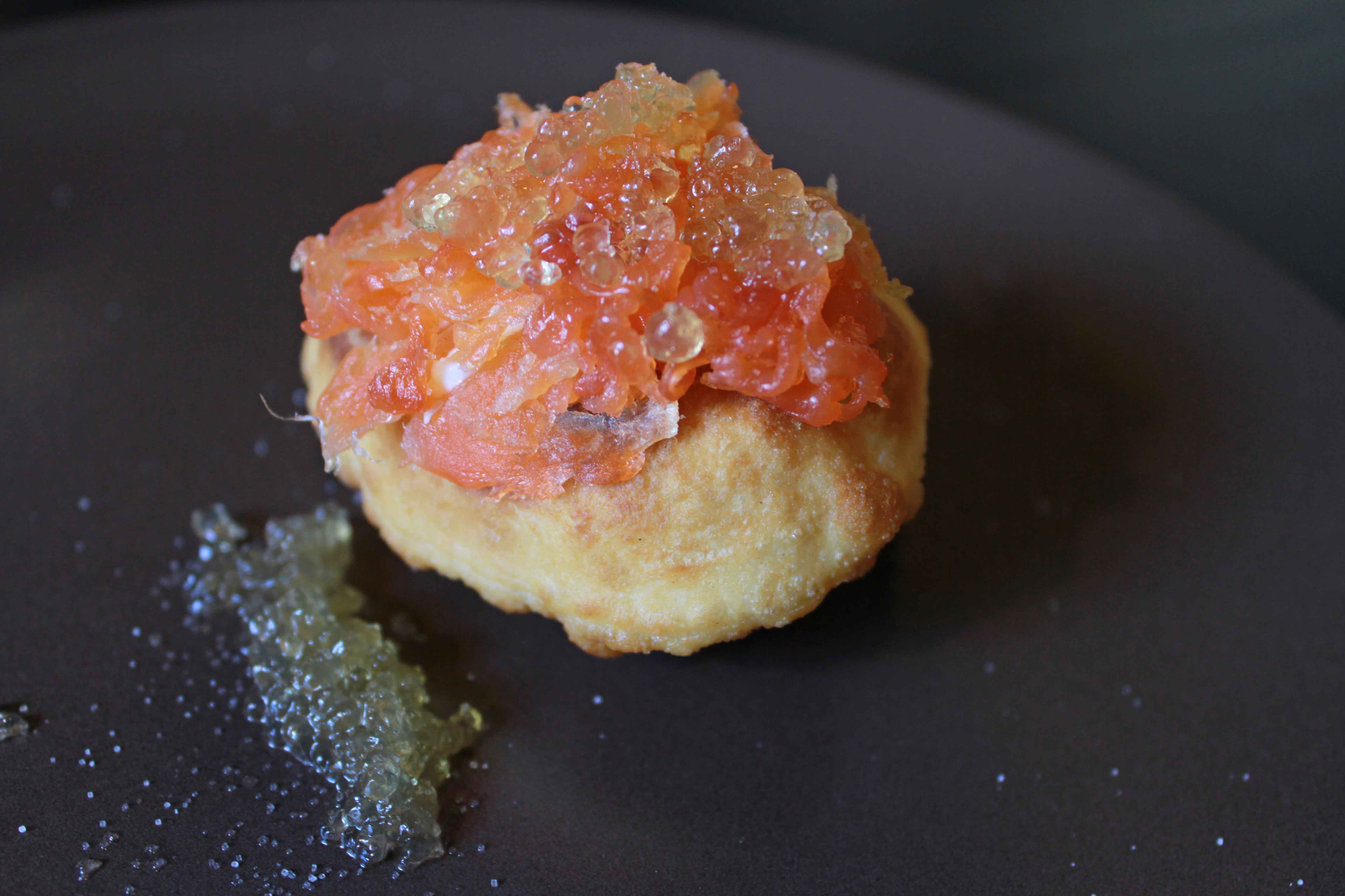 Ya en Sigüenza, y para ser cabal, como lo es el castellano recio, lo lógico es empezar la ruta por el Castillo Parador. Además de para ambientarnos, servirá para hacerla cuesta abajo, sin perder el resuello y con tiempo para disfrutar del paseo por las calles. Será entonces cuando el visitante-comensal se encuentre al caballero Ginés Navarro. Entre las candelas de la fortaleza ha preparado un Cabrito asado con amanita caesarea, que se toma en vaso. Hecho al modo tradicional, el chef saltea la carne con una variedad de seta que se encuentra en los montes seguntinos, la amanita caeserea, y le añade un poco de agraz, “zumo de la uva verde que se puede utilizar como condimento”, explica el cocinero. Como corresponde al lugar, el pincho lo “coronan” un crujiente de pan artesano, “muy fino, casi sin fermentar”, que se fríe, una bolita de puré de romanescu, “cuajada con gelatina de algarrobo” y un caviar de aceite de oliva, de la variedad picual, que le aporta al pincho los matices del color amarillo, al tiempo que intensidad a su degustación.