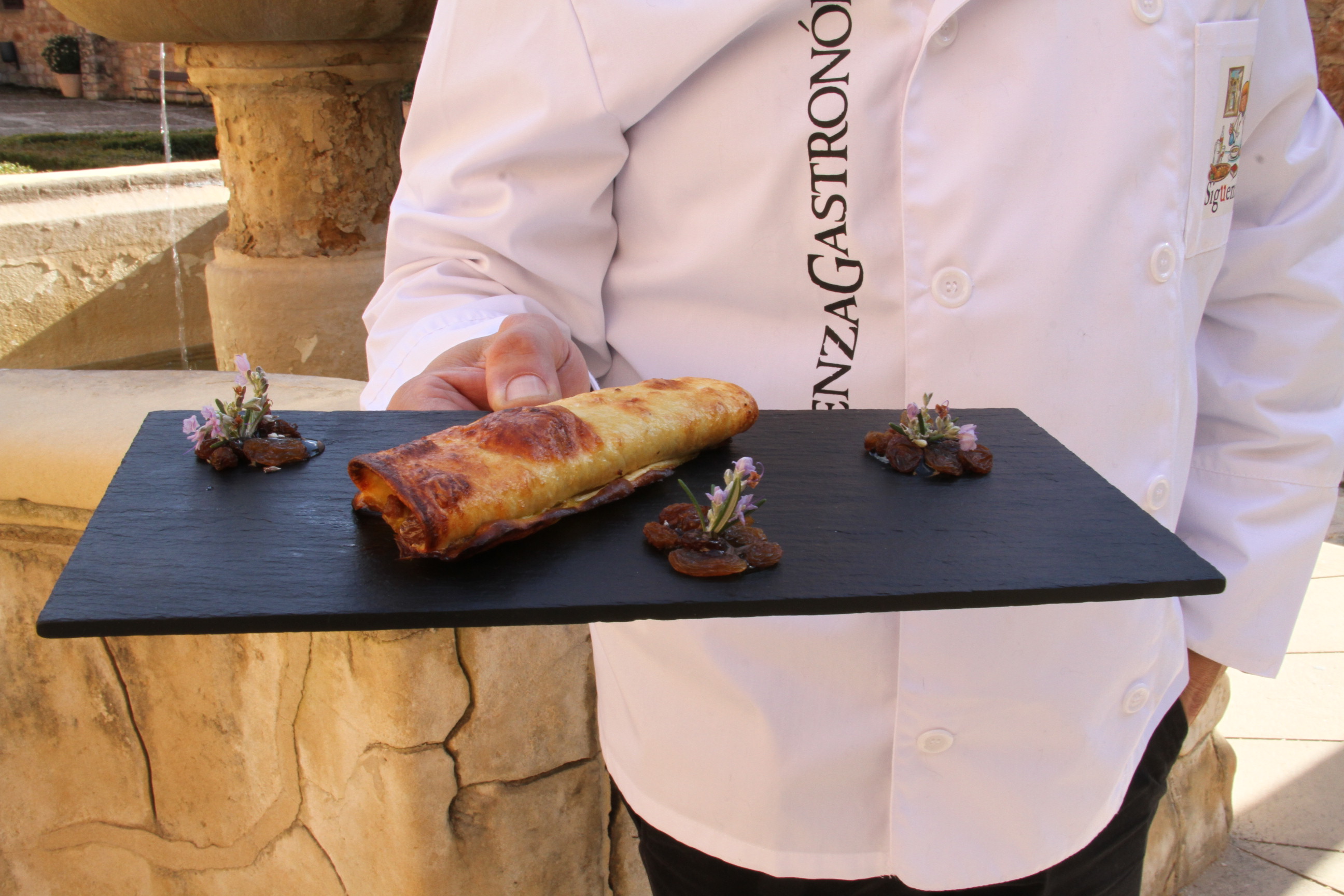 Y para terminar la Ruta, ya en la localidad seguntina de Alcuneza, es obligada la visita a La Granja de Alcuneza. Allí, el comensal puede degustar una Tajada en salsa de uvas y aroma de nuestra tierra (pincho medieval del año). Estefanía Verdes, madre del malogrado chef Santos García Verdes a cuya memoria se dedica el concurso, ha creado un pincho originalísimo en el que la cuchara está hecha de pan especiado con semillas de amapola. Naturalmente, se come. La tajada, es de solomillo de cerdo. “Lo abro, lo parto en cuatro y le pongo nueces, espinacas y orejones de melocotón seco”, cuenta con ese cariño infinito de las madres cuando hablan de comida, y aún más en este caso. La cocinera tiene tanto cuidado en la mezcla de sabores como en la estética final del pincho, de amplia variedad cromática. Después de aderezarlo con sal, pimienta y tomillo, lo pasa por la sartén para sellarlo, antes de introducirlo en el horno. “Cuando está hecho, lo dejo que se enfríe para que se pueda cortar”, termina la chef. Para acompañar, Estefanía adorna su creación con una salsa de uva roja, a la que también añade moscatel, sal y pimienta, además de las hijas de la vid. La decoración final lleva miel y aceite, a modo de lágrimas, para utilizar en todo lo posible “los colores y aromas de nuestra tierra”.