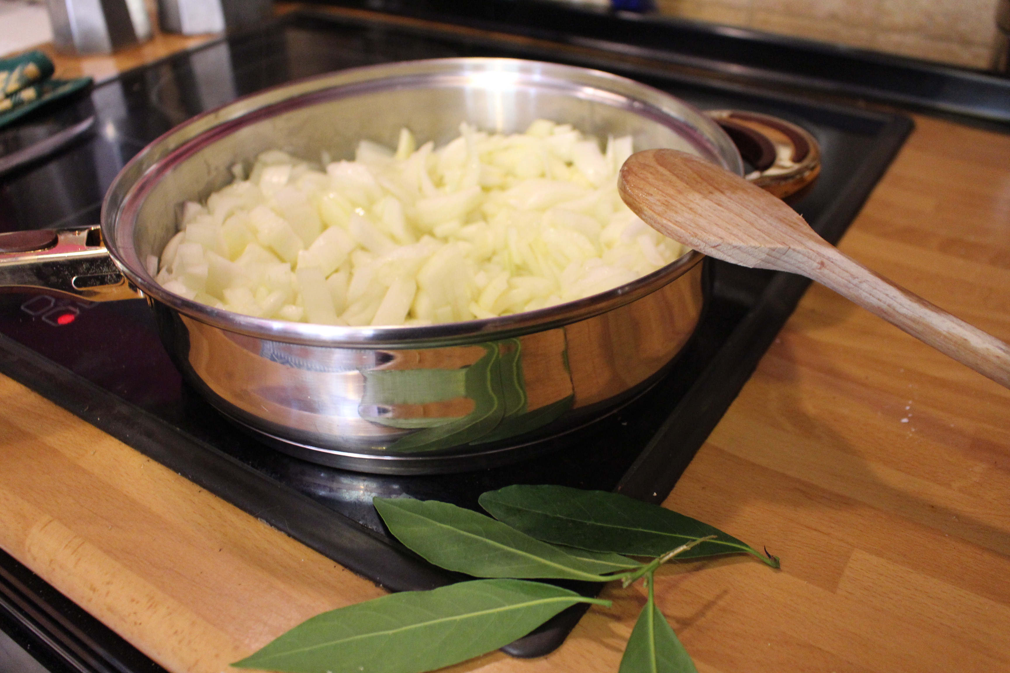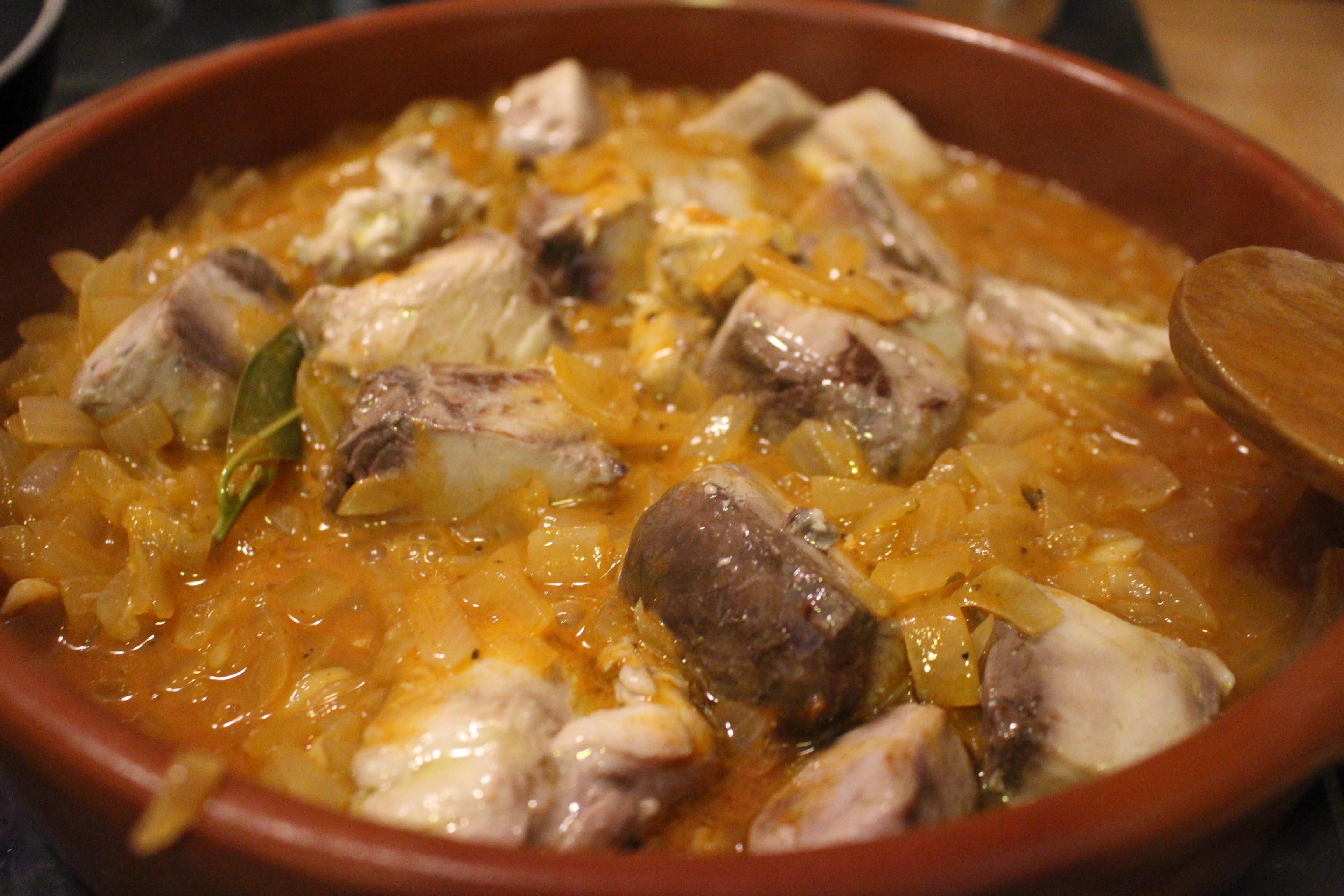 Salpimentamos el bonito y lo doramos en la sartén ( poco tiempo para que no se quede muy seco). Lo retiramos y en ese mismo aceite incorporamos las cebollas cortadas en juliana y los dientes de ajo y lo ponemos a pochar. Ponemos el laurel y el orégano y cuando las cebollas están a punto añado vino blanco, un poco de vinagre y un chorro de vino de Jerez. Al evaporarse el alcohol pongo el pimentón y añado los tacos de bonito. Le doy unas vueltas y listo.