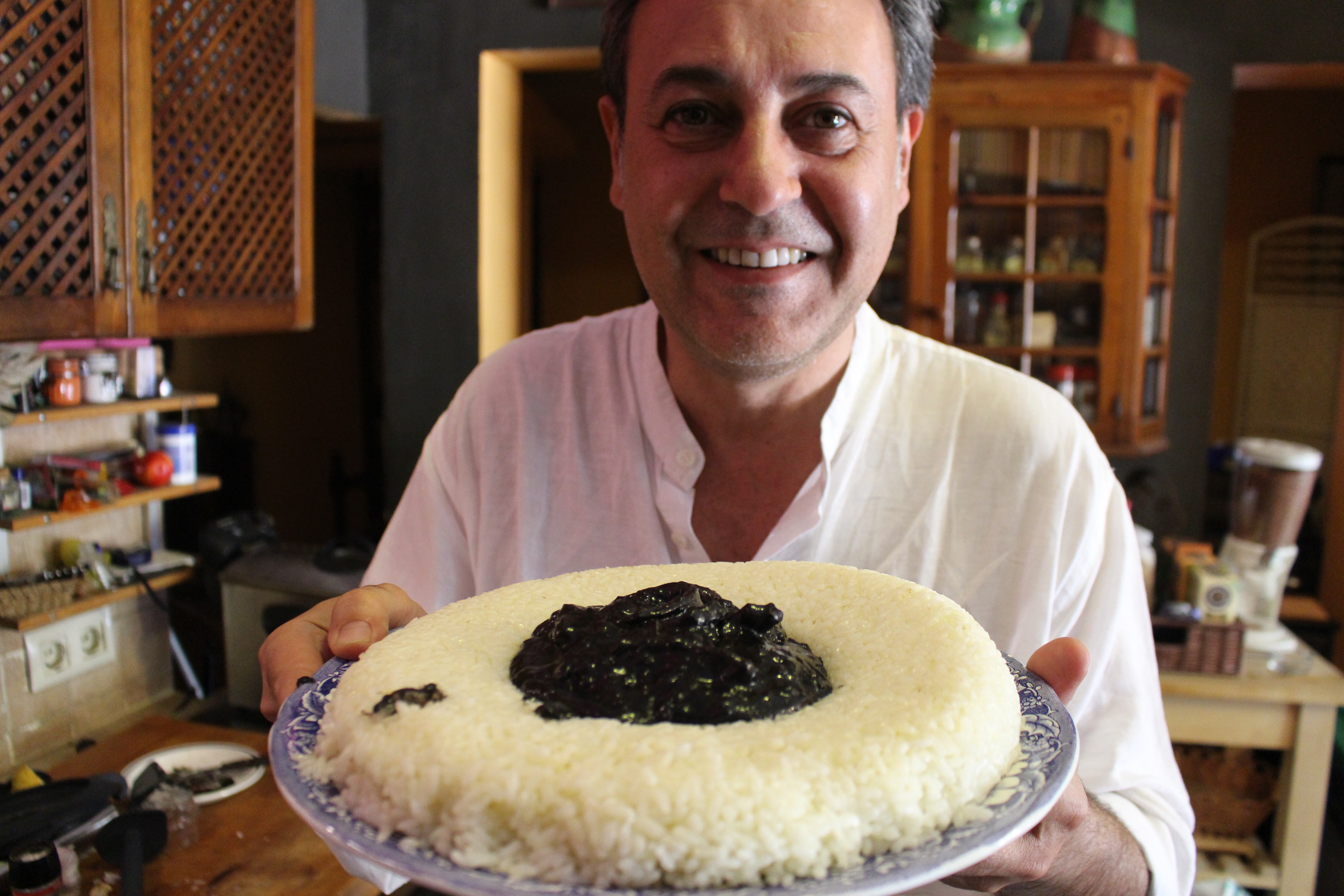 El origen de añadir la tinta del calamar al guiso ha sido objeto de estudio por muchos gastrónomos. En principio la tinta es tóxica, pero alguien descubrió que esa toxicidad desaparece con el calentamiento. Hay autores que atribuyen el comienzo de su uso en akelarres de brujas y conjuros.