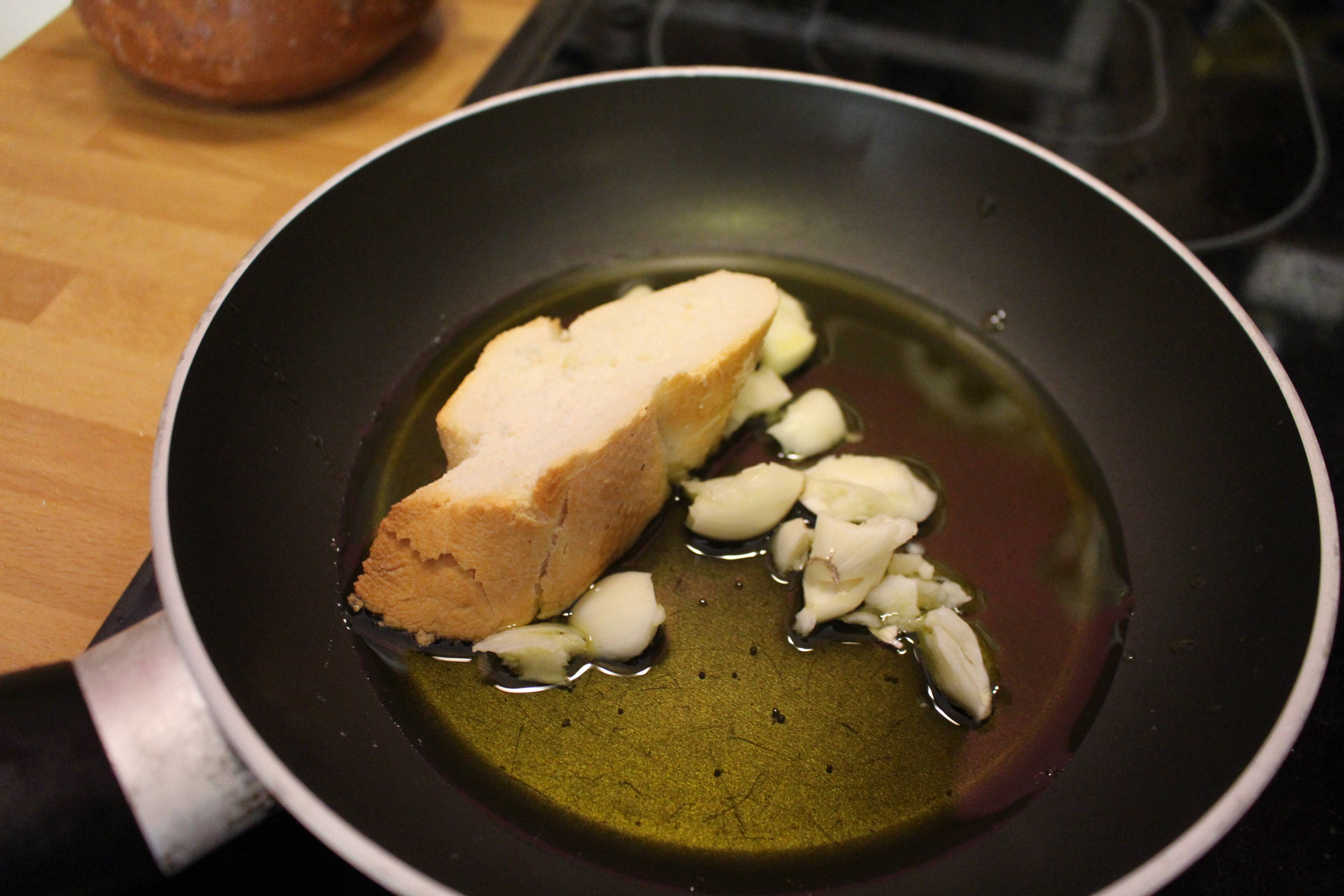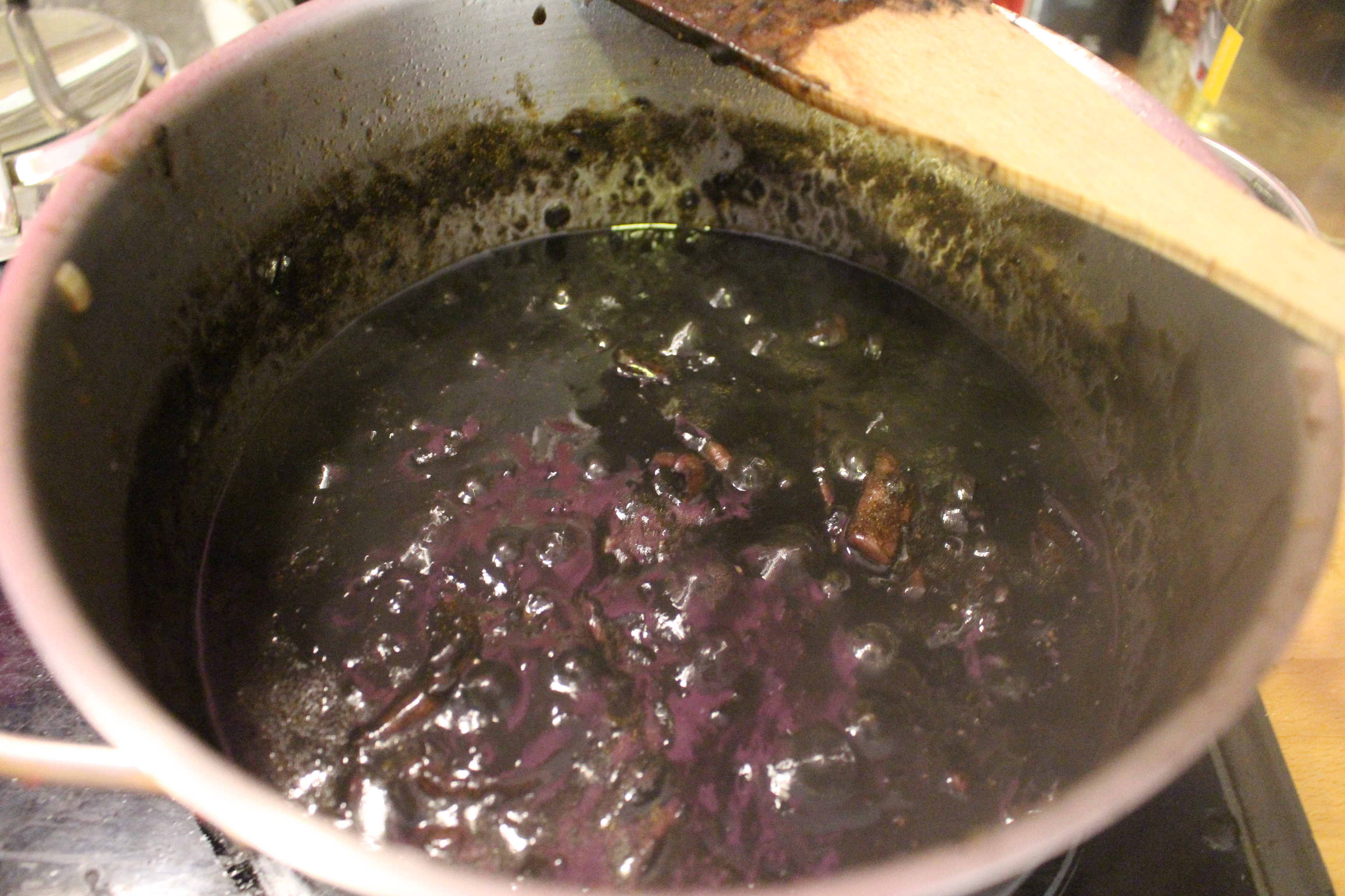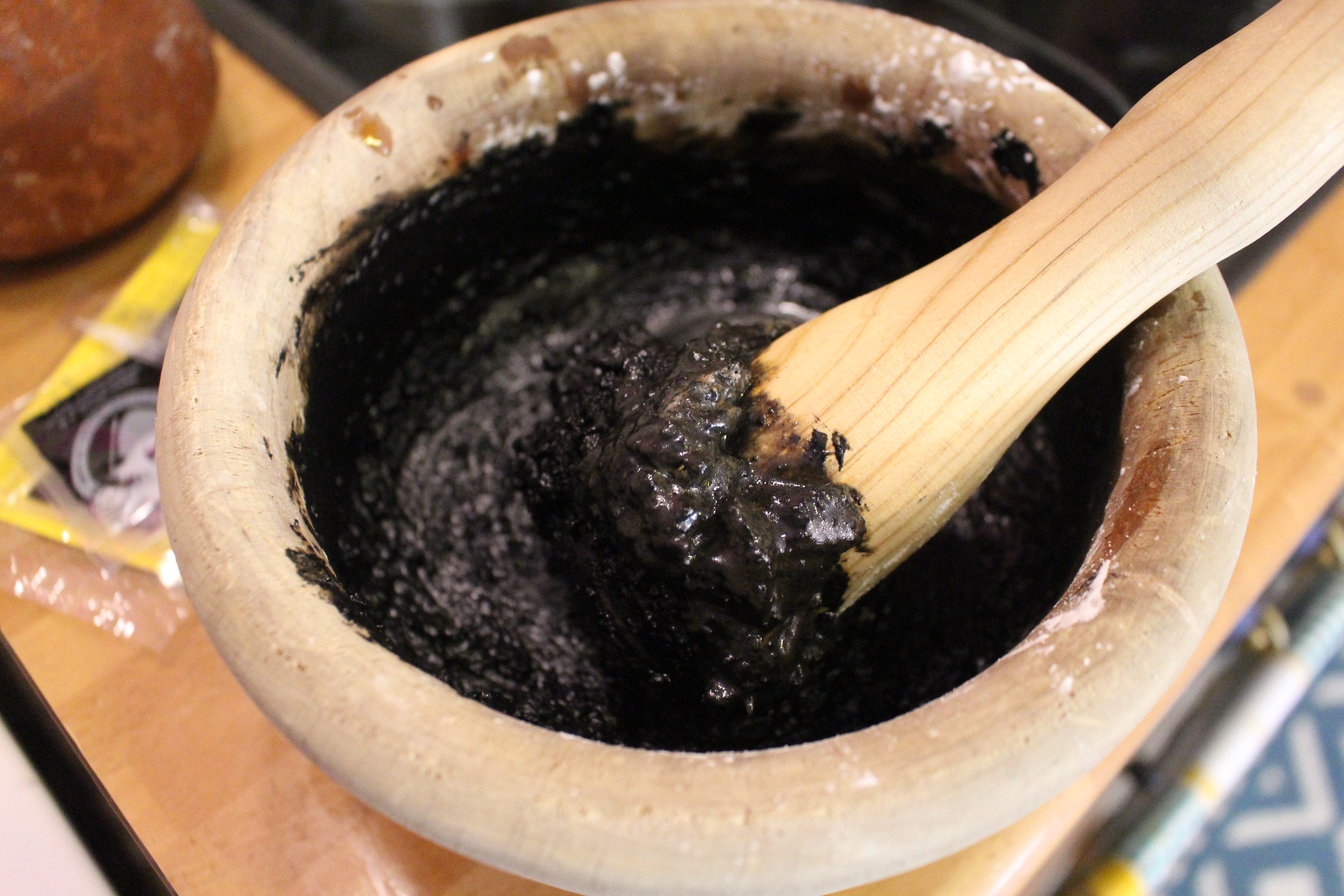 En una sartén pequeña doro los dientes de ajo y la rebanada de pan, que posteriormente machacaré en el mortero junto con la tinta y una cucharada de harina y un chorro de vino tinto, lo añado a la olla de los calamares, salpimento y se deja cocer unos 20 minutos.