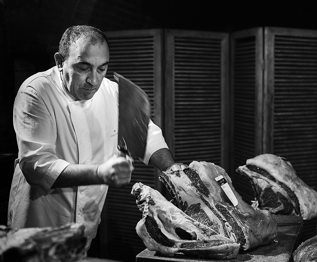Bueyes de diferentes razas, seleccionados previamente uno a uno, dominan la pradera próxima a la bodega donde se crían con todas las atenciones y cuidados. José confía en la influencia del carácter de cada individuo y tiene claro que aquellos animales criados con mimo y buen trato dan como recompensa la mejor calidad y textura. Por eso se esmera minuciosamente en cada detalle, desde la selección del animal en la tierra de origen en los montes de Galicia, Asturias, León o incluso Portugal, la alimentación con productos naturales, el transporte, el sacrificio –donde cuida que tenga una muerte serena y digna–, el despiece y la maduración. Un proceso que puede llevar hasta más de tres años para conseguir la textura y el sabor de la considerada por críticos de todo el mundo como la “mejor carne del mundo”.