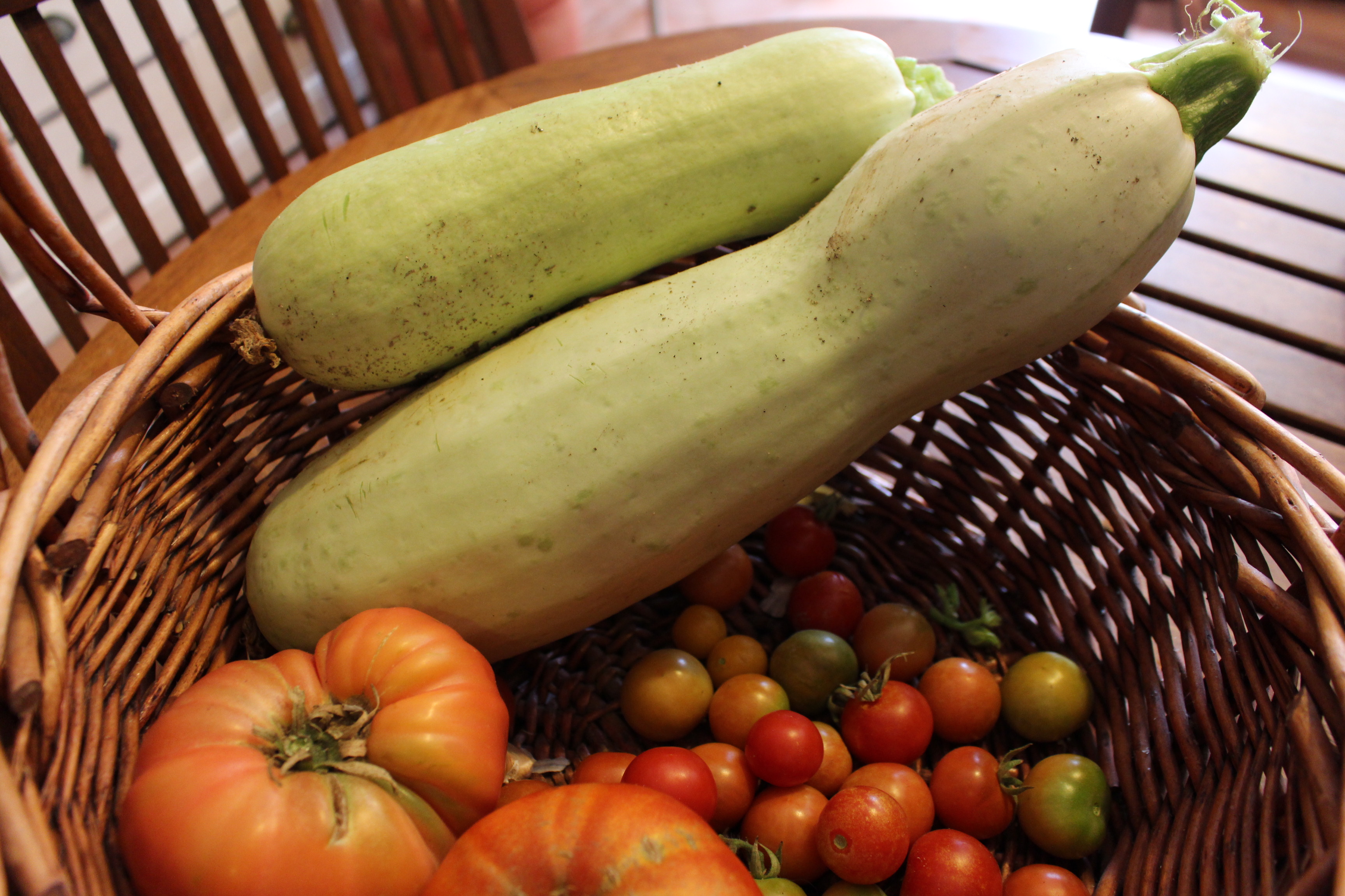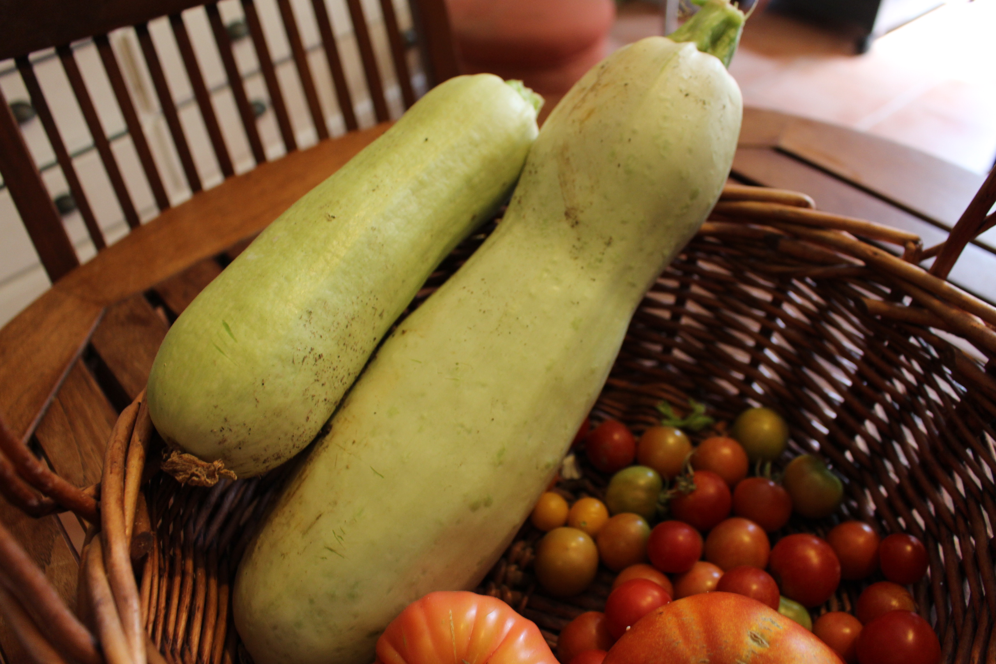 El huerto empieza a dar sus frutos, una inmensa satisfacción personal. Yo os recomiendo que aunque sea en tiestos o en pequeños huertos urbanos disfrutéis de la sensación de convertiros en pequeños hortelanos. Entre tomates y pimientos, la cosecha de este año, me sorprende con unos grandes calabacines blancos. Las semillas me las dio un  agricultor y me dicen que son más suaves de sabor que los verdes, con algo más de pepitas.