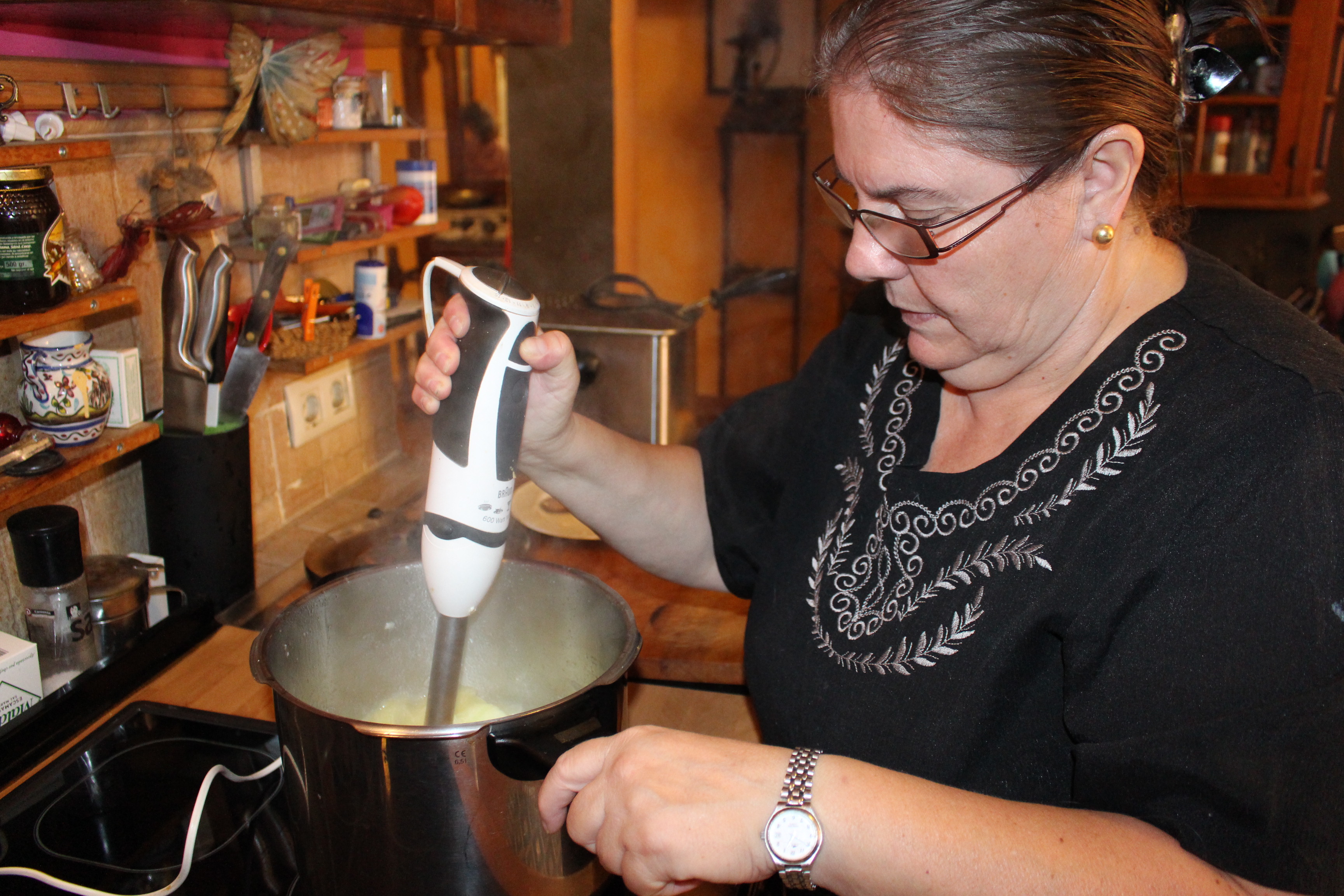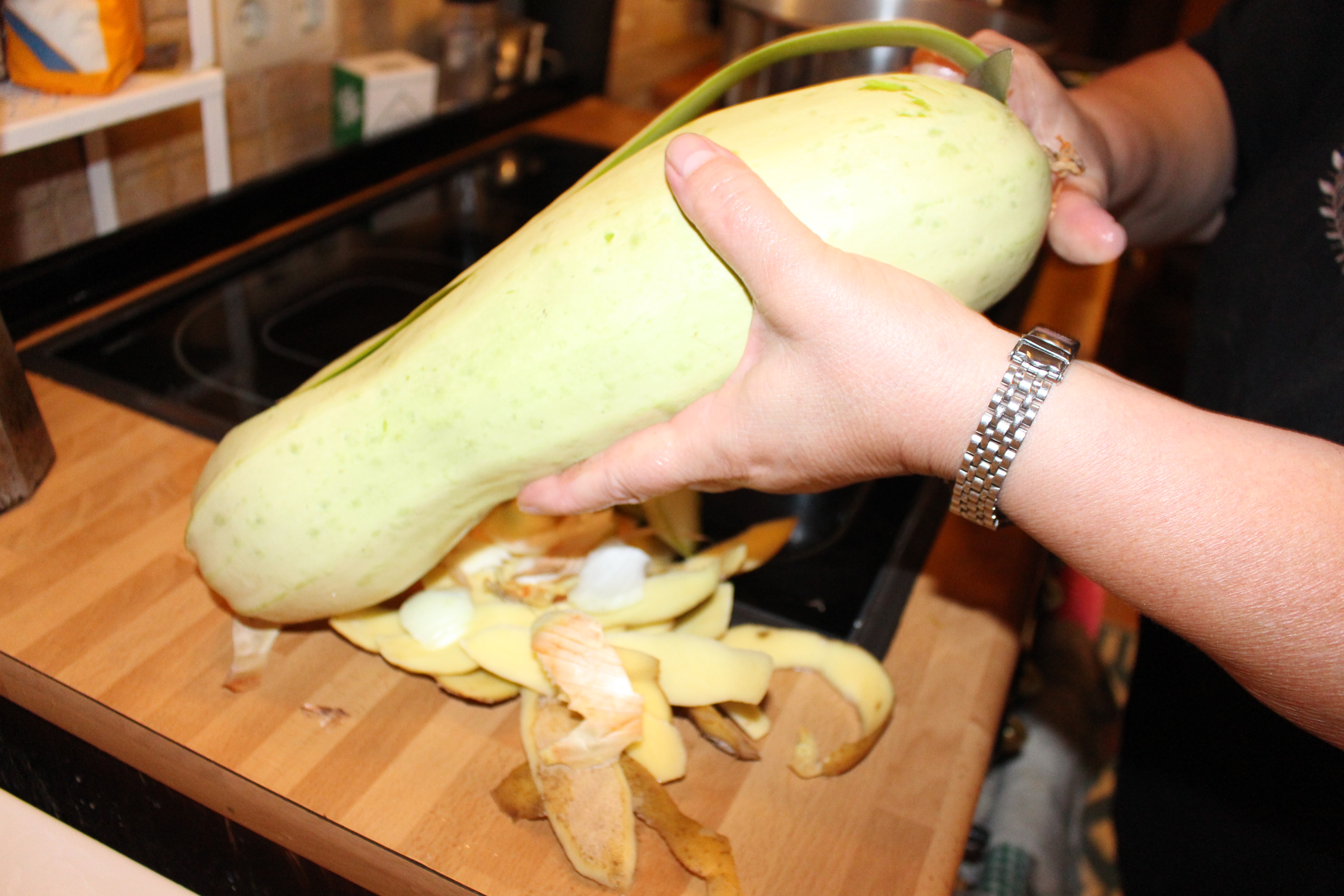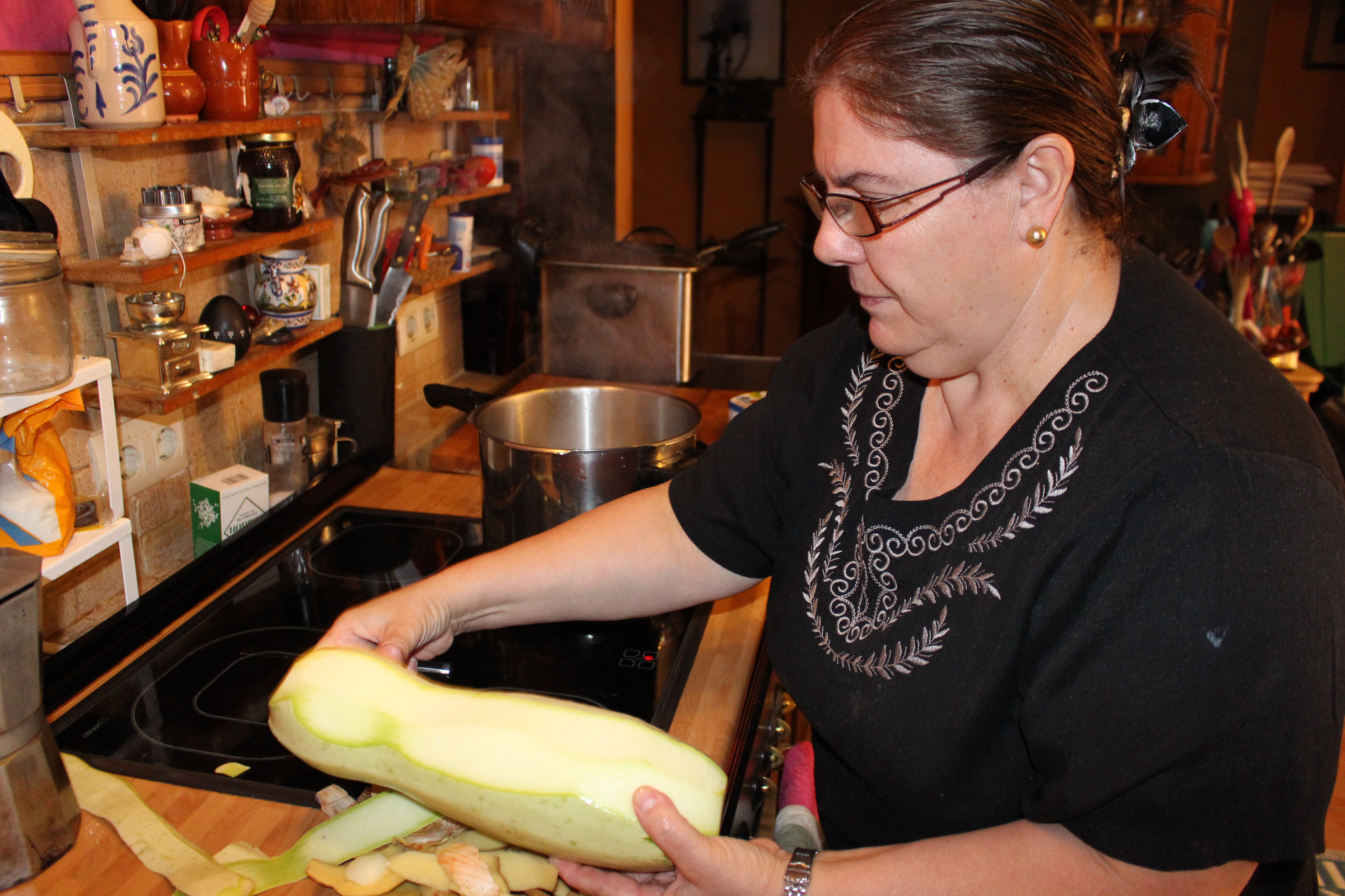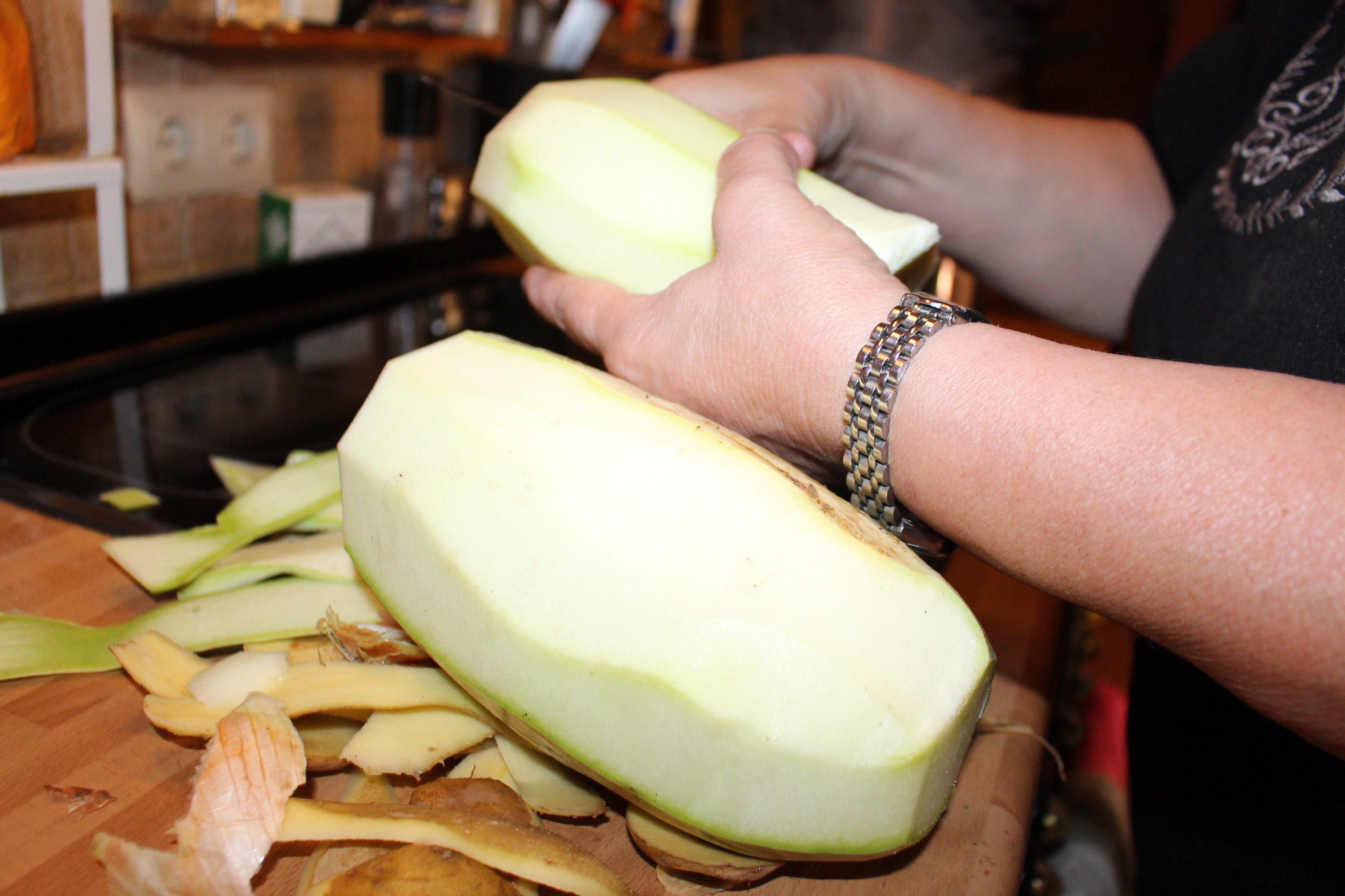 Orgulloso de mi cosecha, mi querida Juliana fascinada con el color y tamaño de los productos de mi pequeña huerta y con esa actividad intensa que la caracteriza me dijo que se ponía manos en la masa para preparar un puré de calabacín blanco. Os dejo la receta: