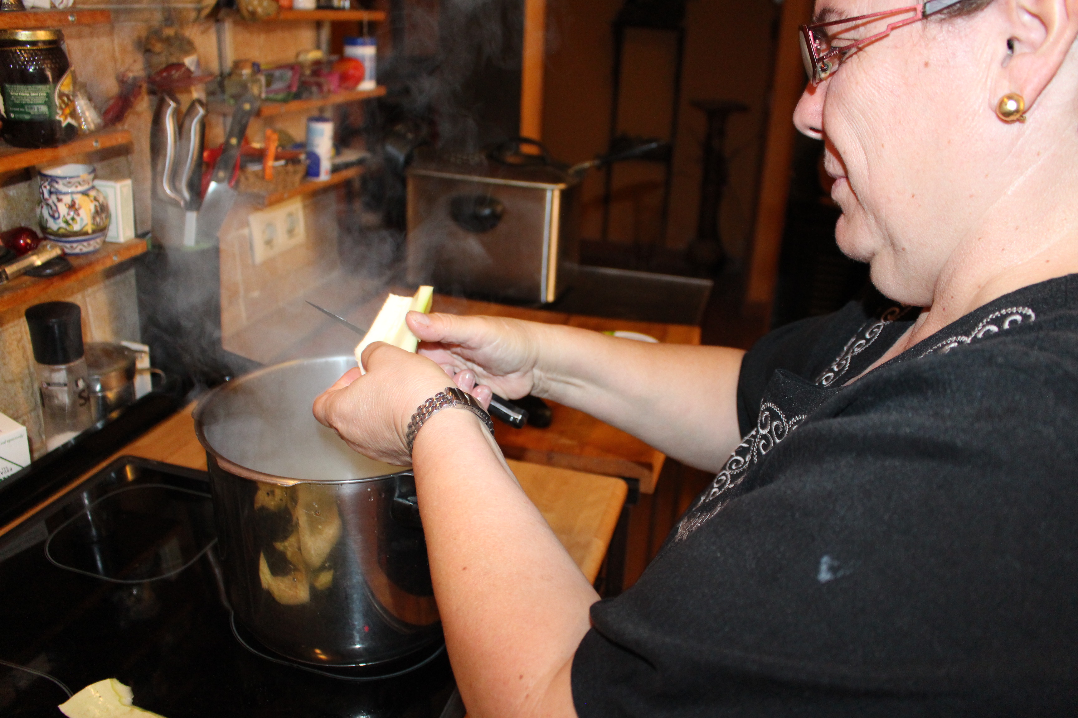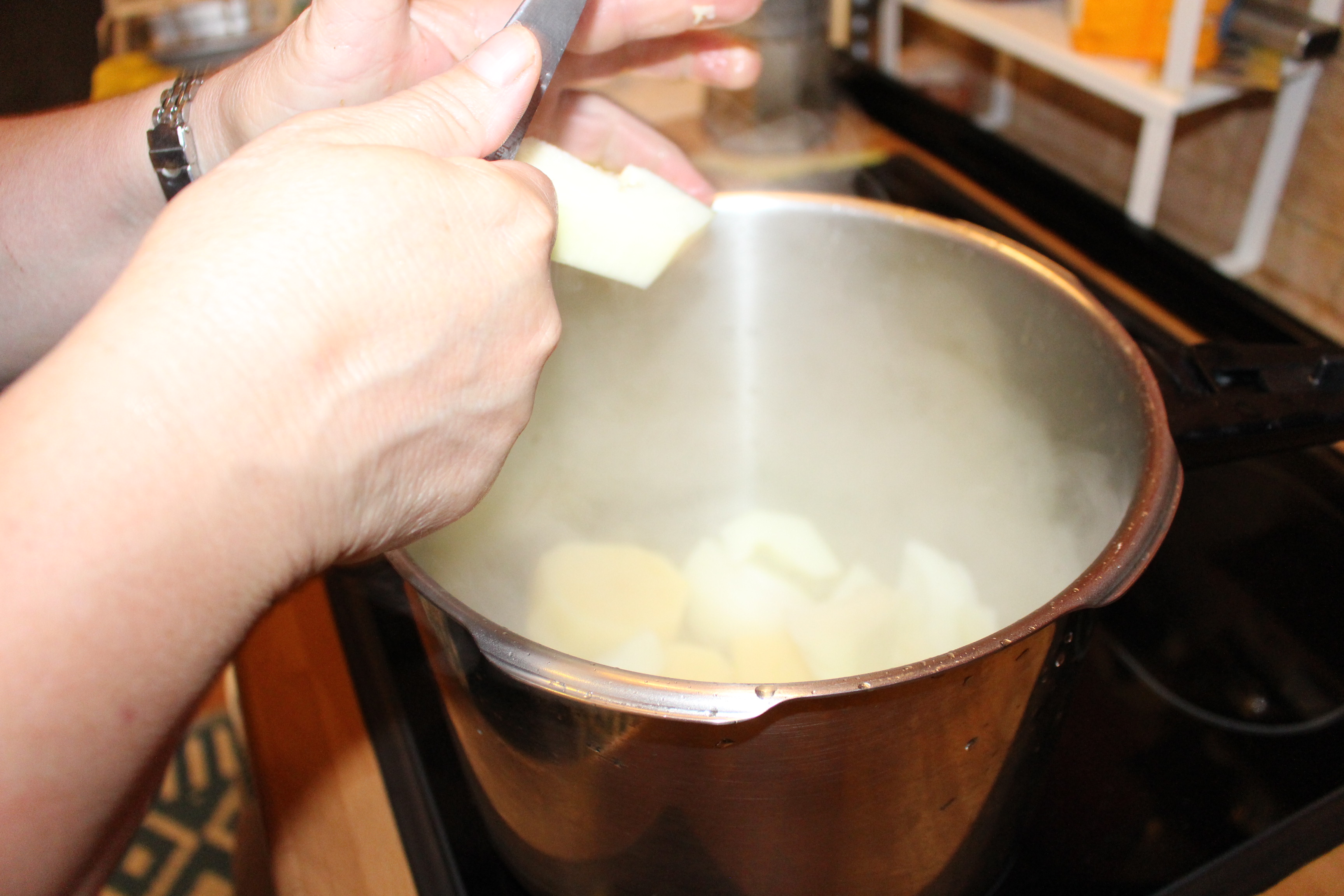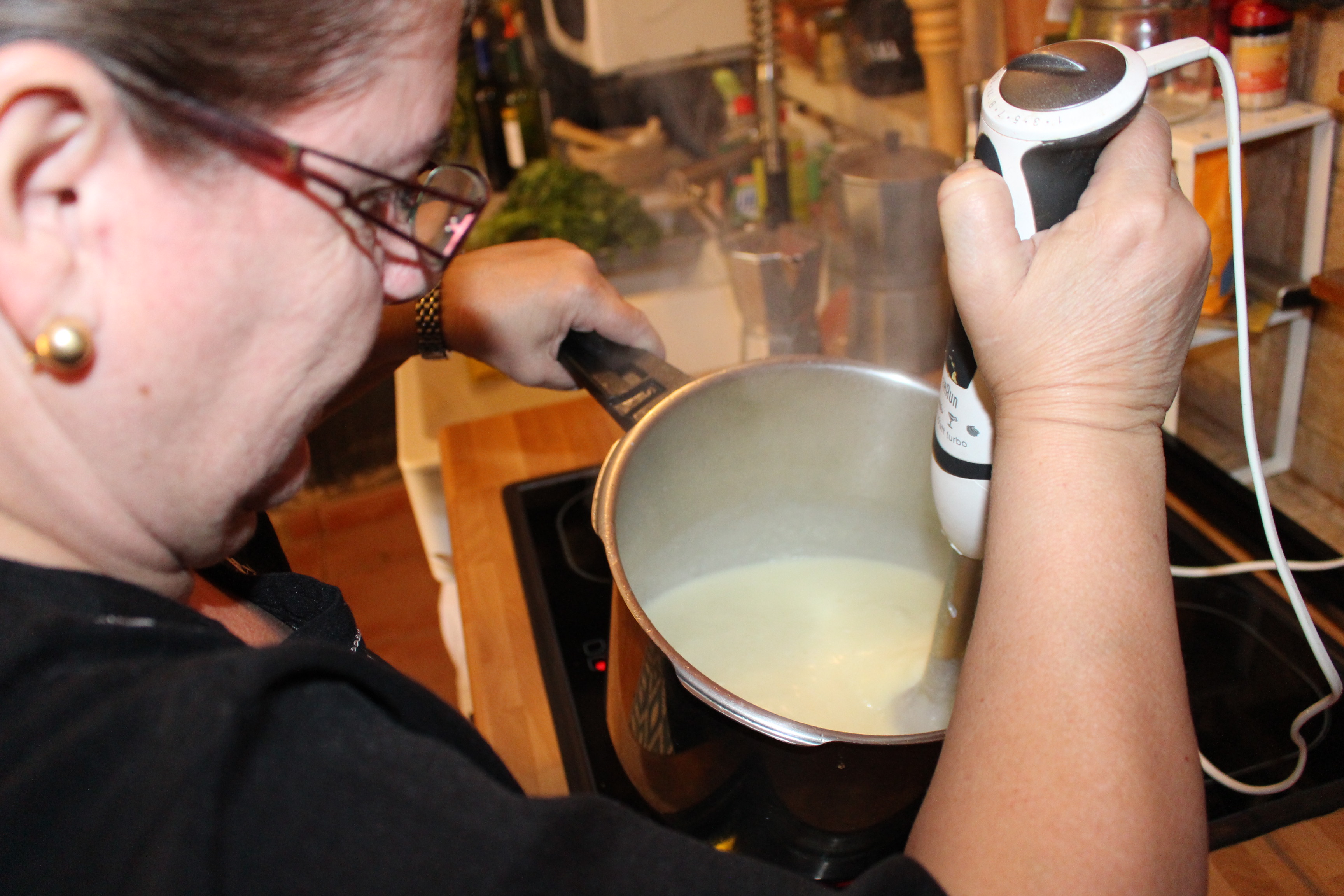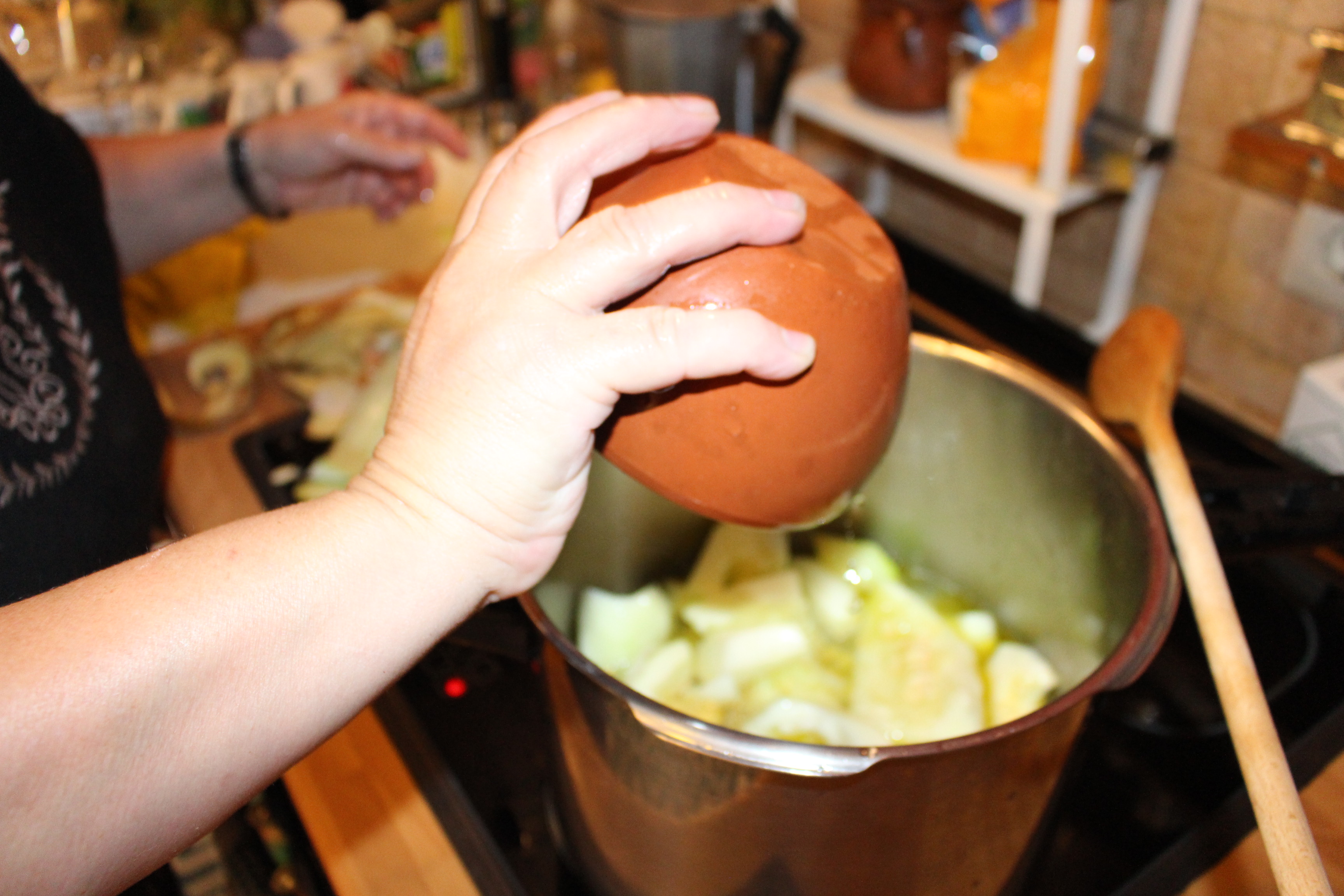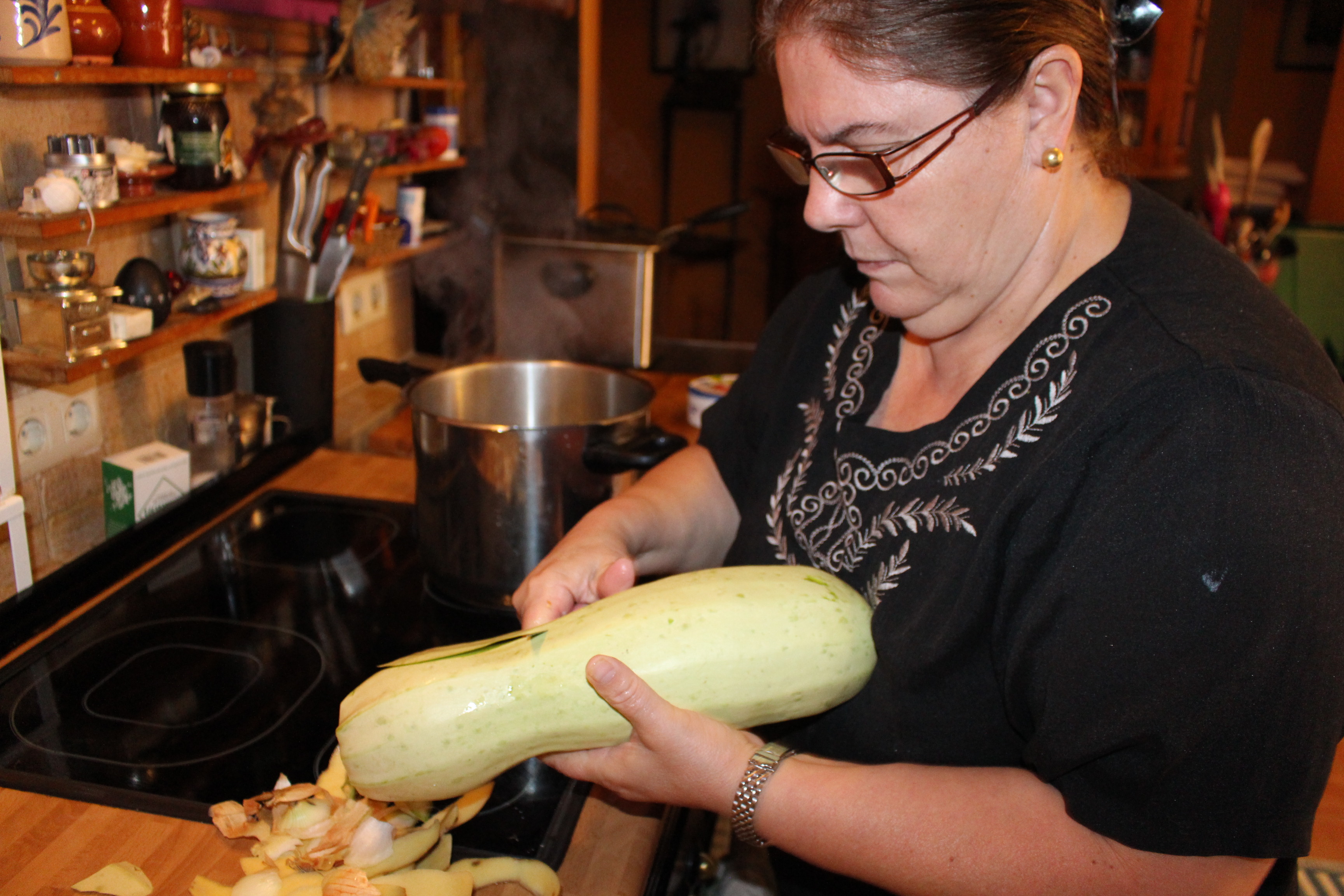 Orgulloso de mi cosecha, mi querida Juliana fascinada con el color y tamaño de los productos de mi pequeña huerta y con esa actividad intensa que la caracteriza me dijo que se ponía manos en la masa para preparar un puré de calabacín blanco. Os dejo la receta: