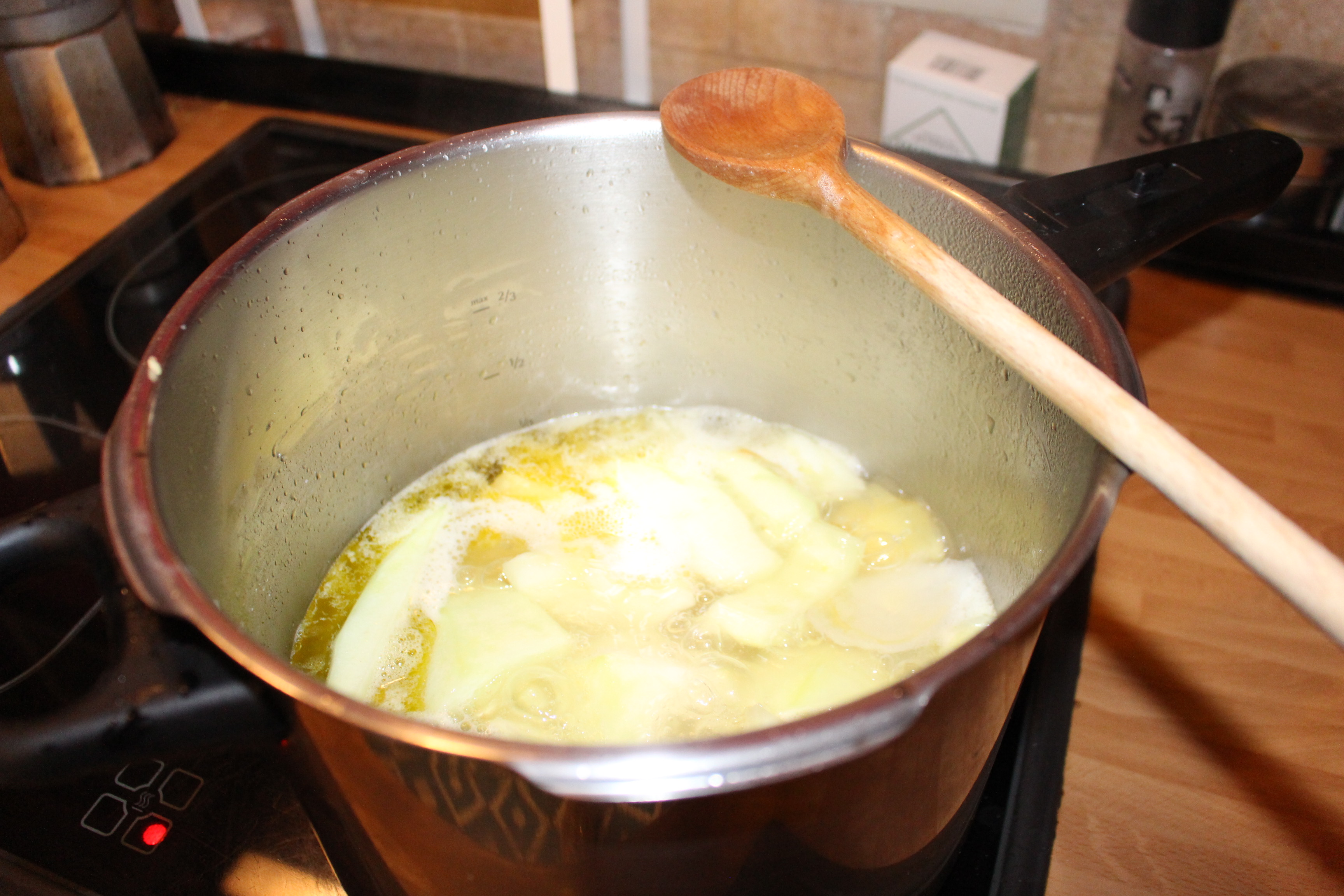 En una olla con un buen chorro de aceite de oliva, se coloca la cebolla cortada en cuatro trozos, la patata y el gran calabacín blanco. Se cubre de agua, que no sobrepase los ingredientes. Se deja unos 25 minutos hasta que está blando y se le añaden los quesitos. Se prueba de sal. Unas vueltas de cuchara y  tras unos cinco minutos más de cocción se pasa por la batidora.