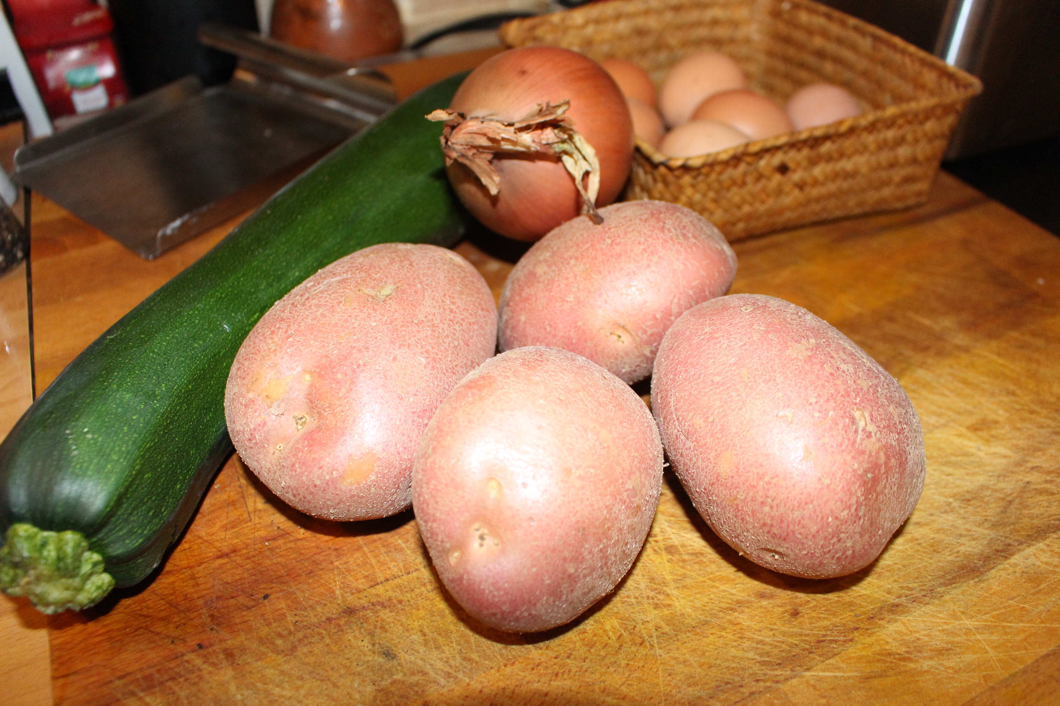 Tortilla paisana: huevos, patatas, pimientos, berenjenas, jamón.