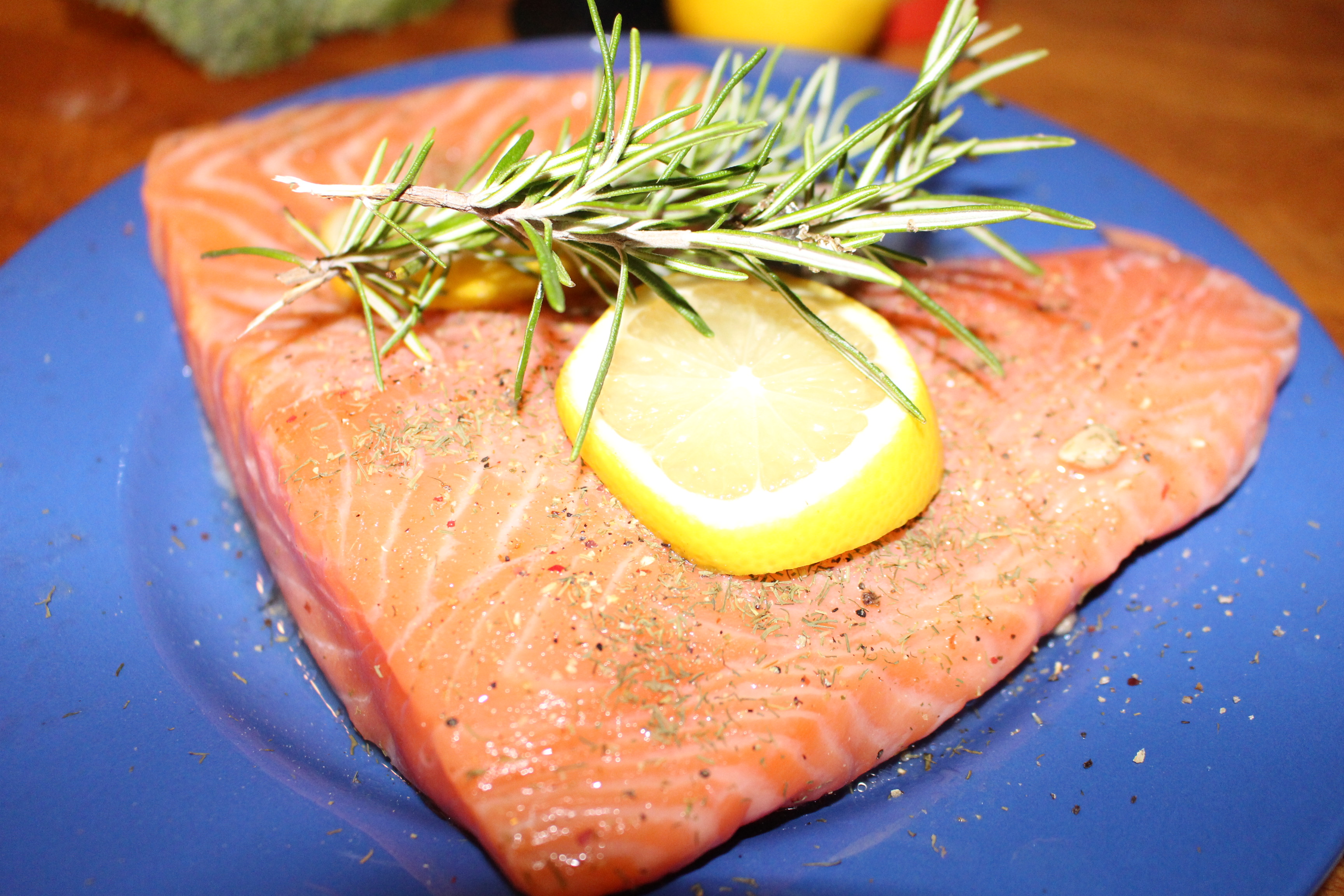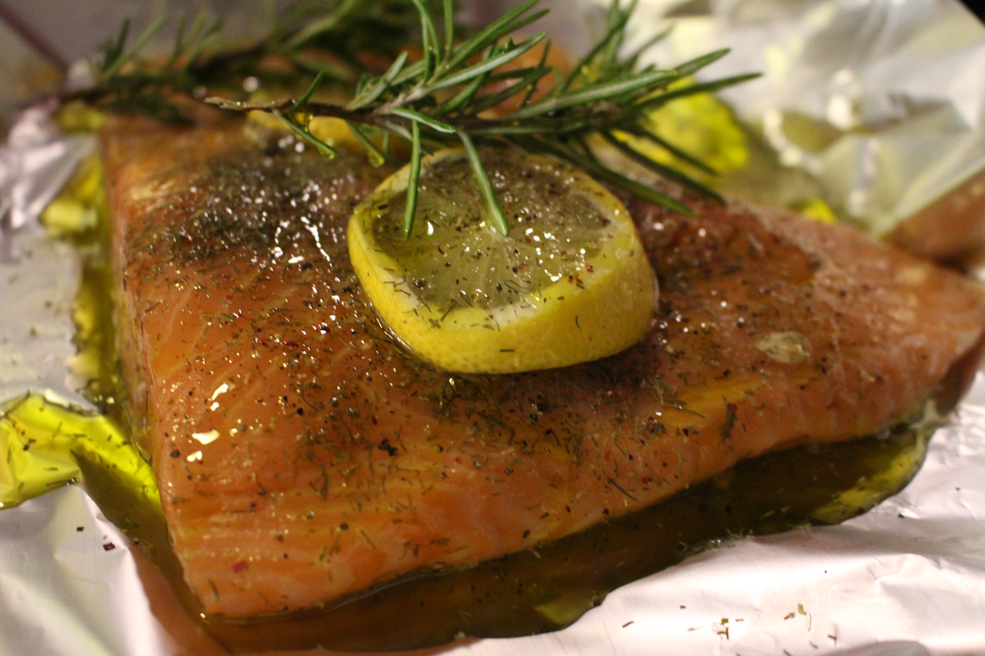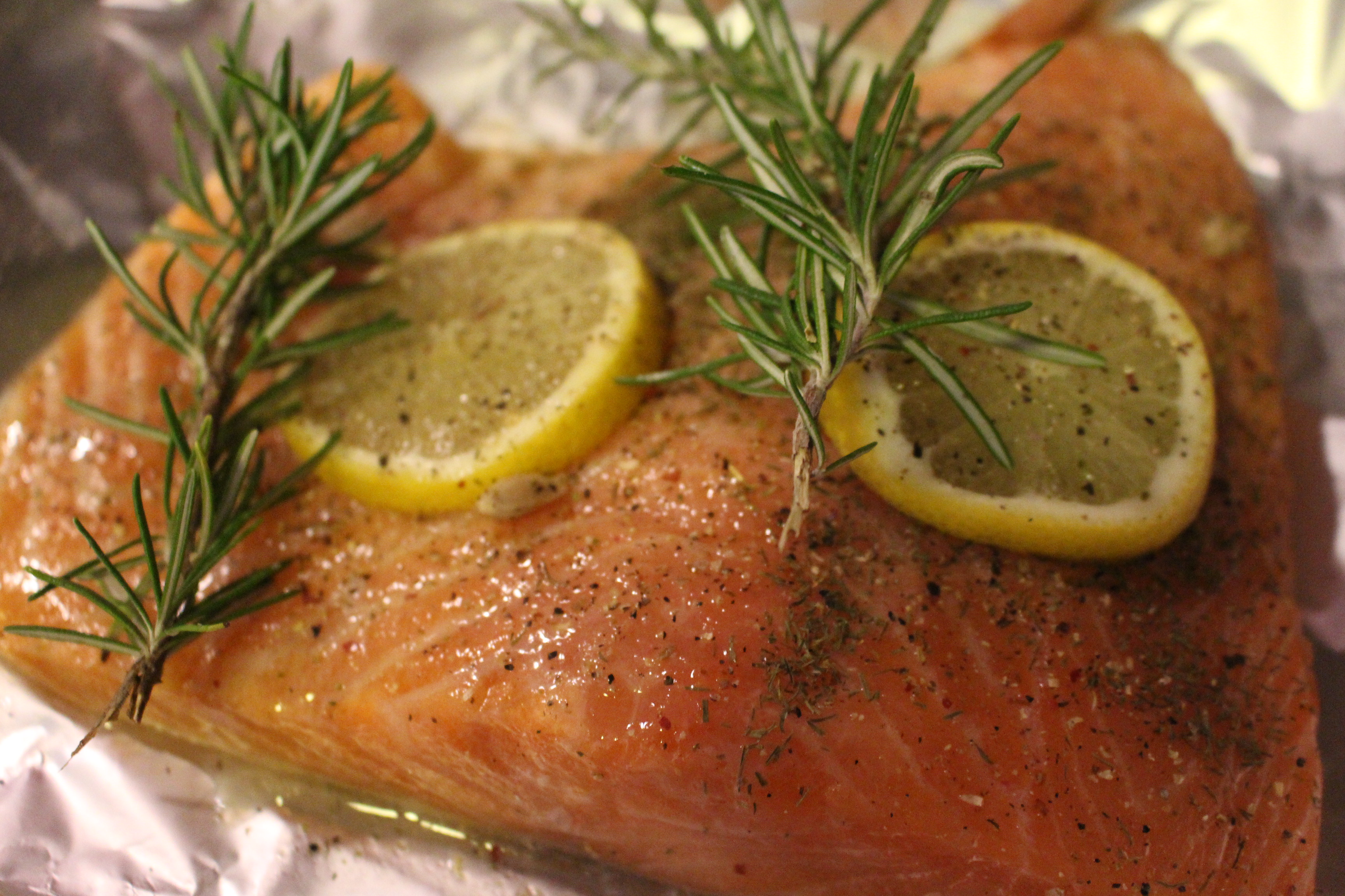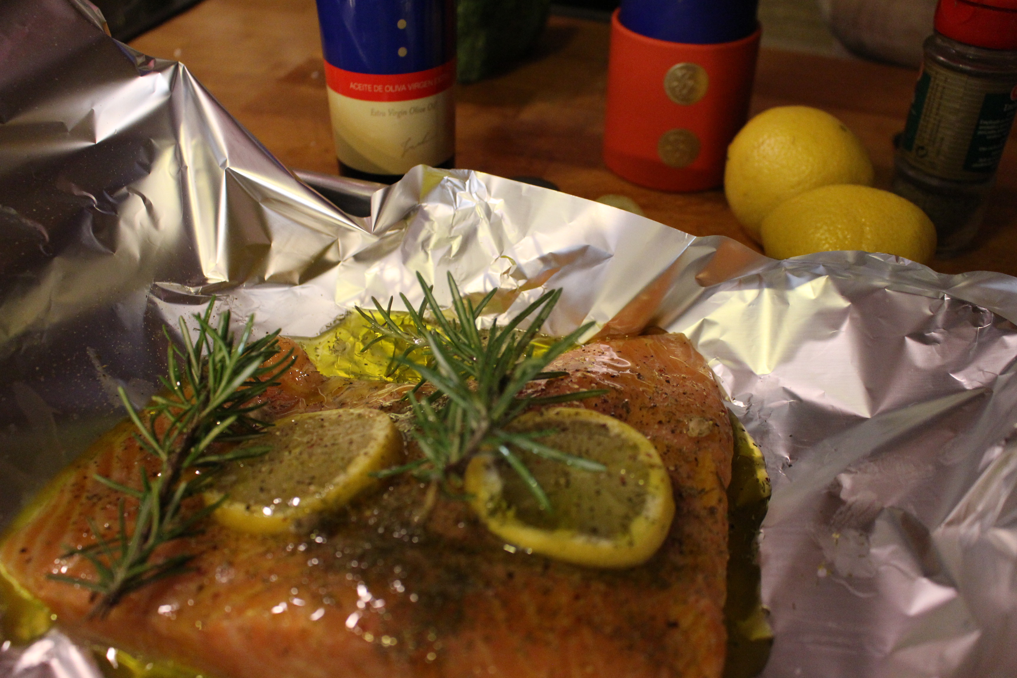 En un papel de aluminio, diseñado para cocinar, coloco el salmón, lo salpimentó  y añado las especias eneldo y unas ramitas de romero. Coloco dos rodajas de limón y añado un poco de zumo.