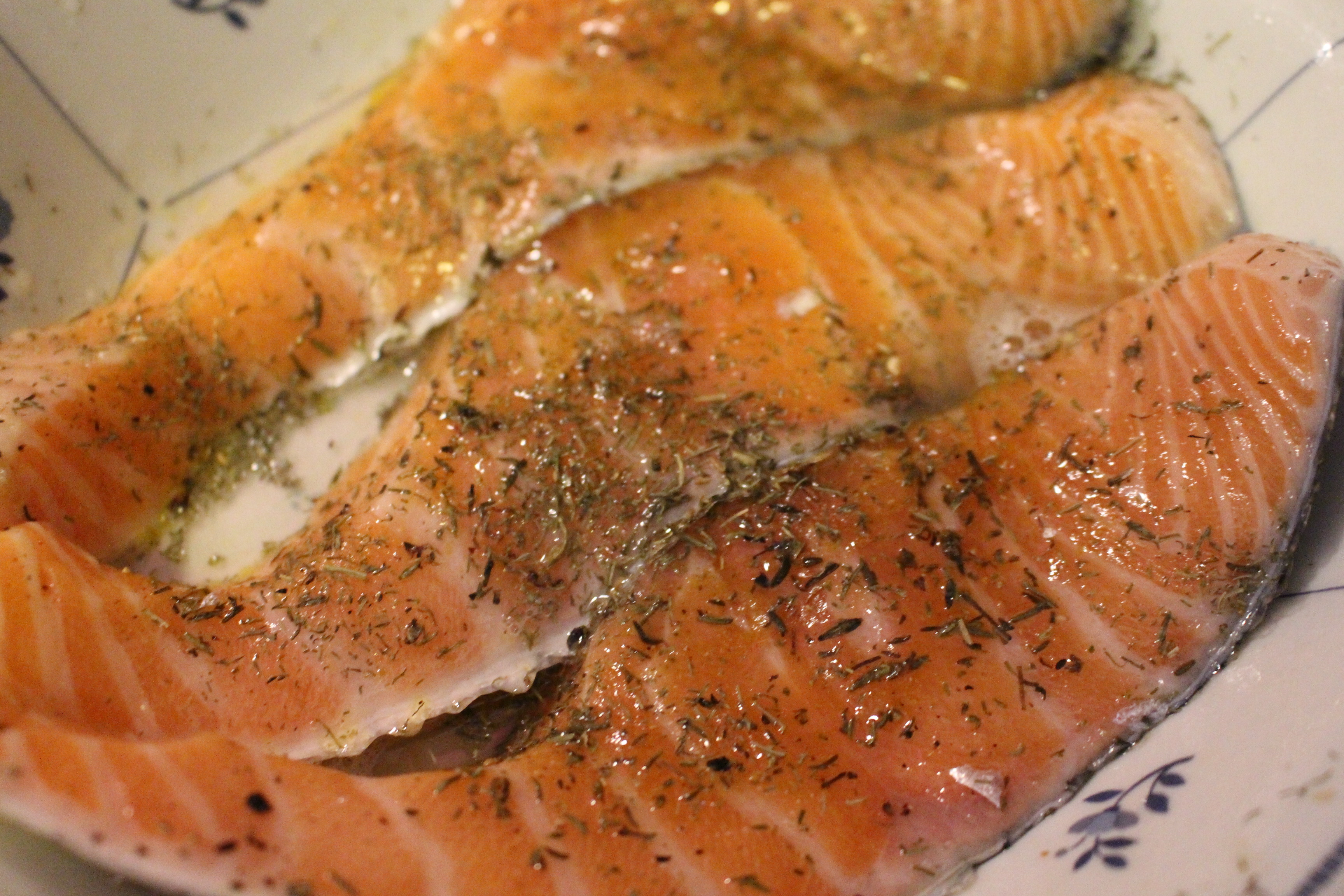 Aderezamos los escalopines de salmón con aceite de oliva, zumo de limón, eneldo y tomillo y reservamos un tiempo para que coja todo el sabor. ( Yo los dejo 1 hora aproximadamente)