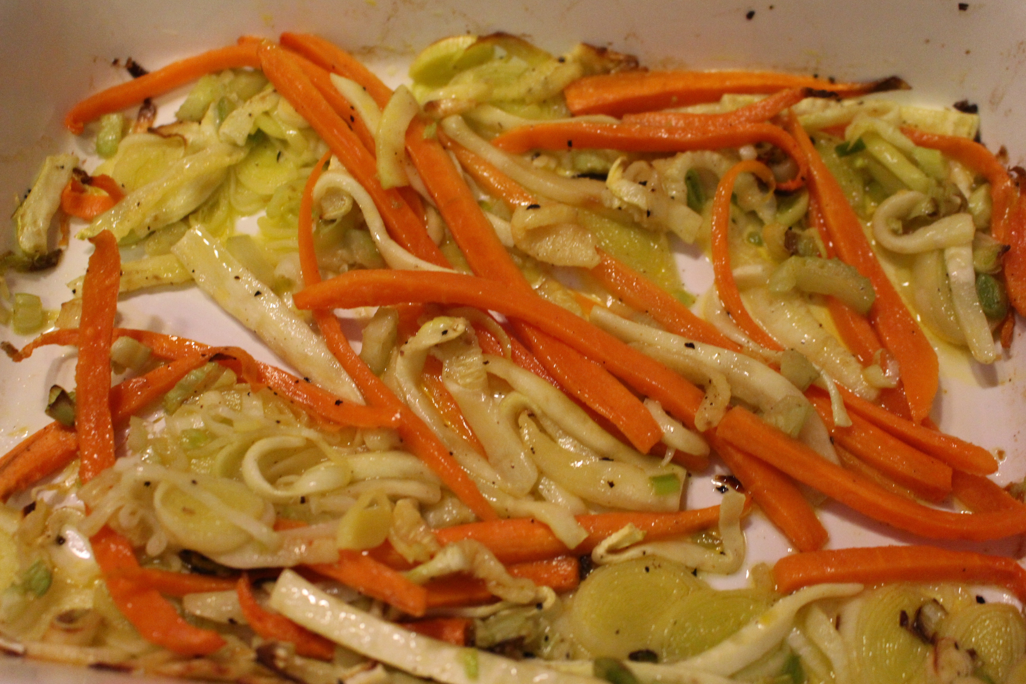 Cortamos las verduras y las colocamos en una bandeja de horno con un chorro de aceite de oliva, sal y pimienta. Las metemos en el horno, previamente calentado a 180 grados unos 20 minutos ( que no se quemen). Cuando están listas, colocamos encima los escalopines de salmón, como son muy finos en unos 10-15 minutos, con el horno a 180 grados están listos para disfrutarlos.