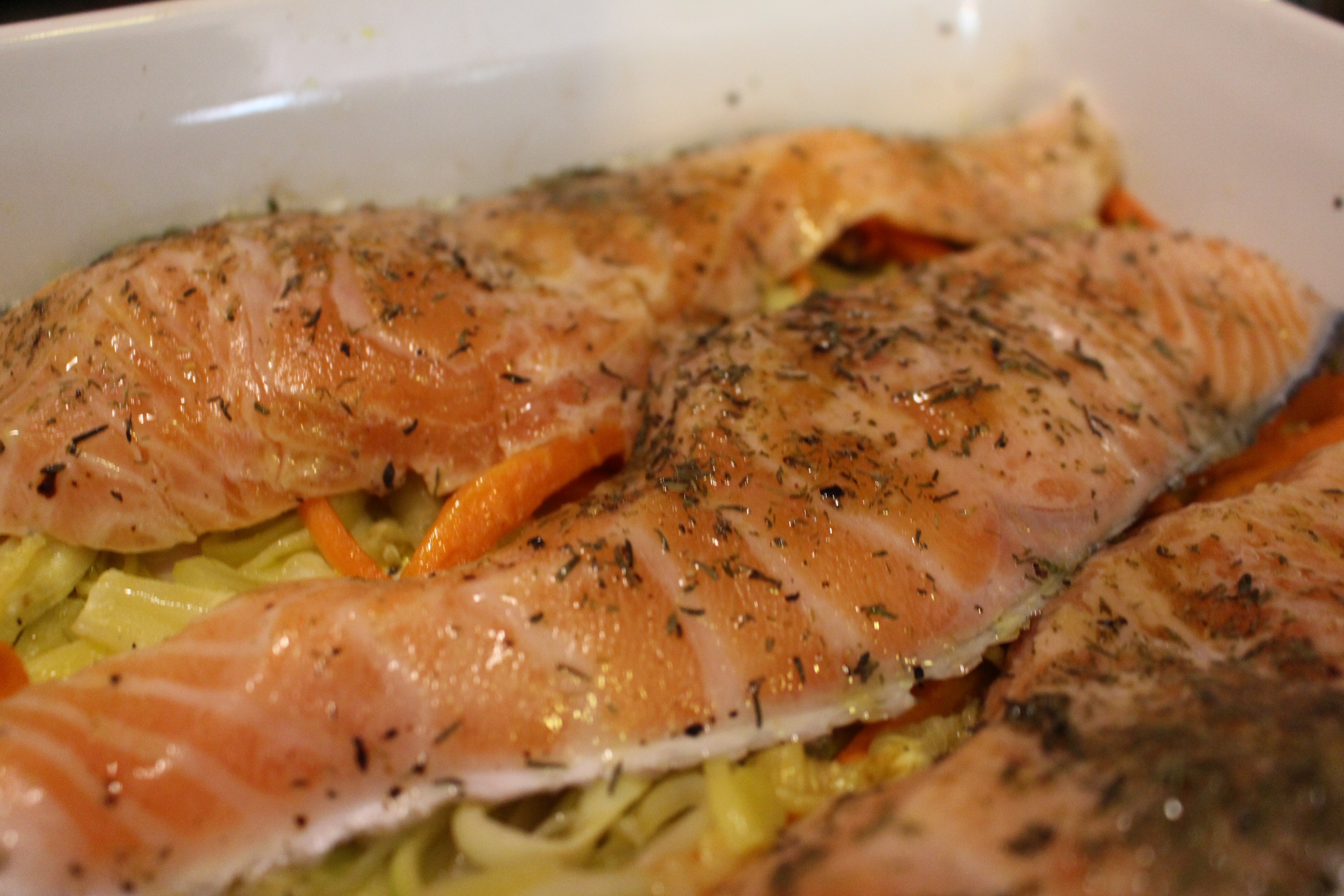 El salmón es uno de esos pescados llenos de buenas propiedades para el organismo, un luchador nato, que además acepta multitud de combinaciones a la hora de prepararlo. He querido cocinarlo con verduras al horno. El tomillo y el eneldo le potencian todavía más su sabor.