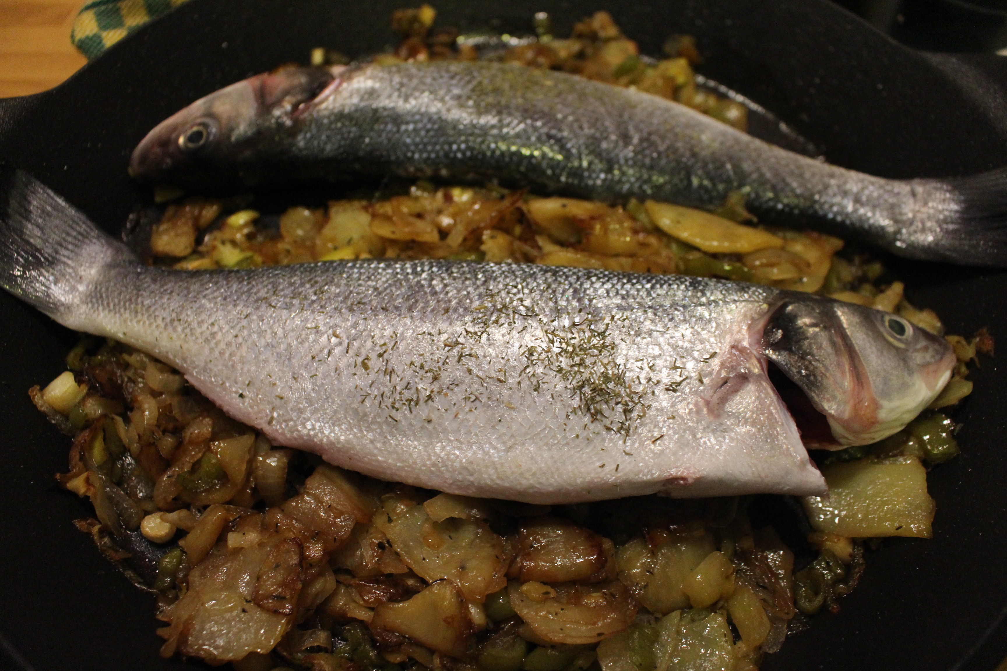 Cortamos las patatas con la mandolina, muy finas, la cebolla, el pimiento verde y el calabacín. Colocamos las verduras con un buen chorro de aceite de oliva en la bandeja del horno y añadimos sal y pimienta. En el horno previamente recalentado colocamos las verduras a 180 grados unos 25 minutos, tienen que quedaros blandas, en especial las patatas, pero que no que se quemen. Sacamos la bandeja a mitad de horno y le añadimos una copa de vino blanco, de calidad media y un chorro de salsa de soja. Volvemos a meter la bandeja en el horno y cuando el vino comienza a evaporarse, sacamos la bandeja y colocamos las lubinas aderezadas con un chorro de aceite, sal y eneldo.