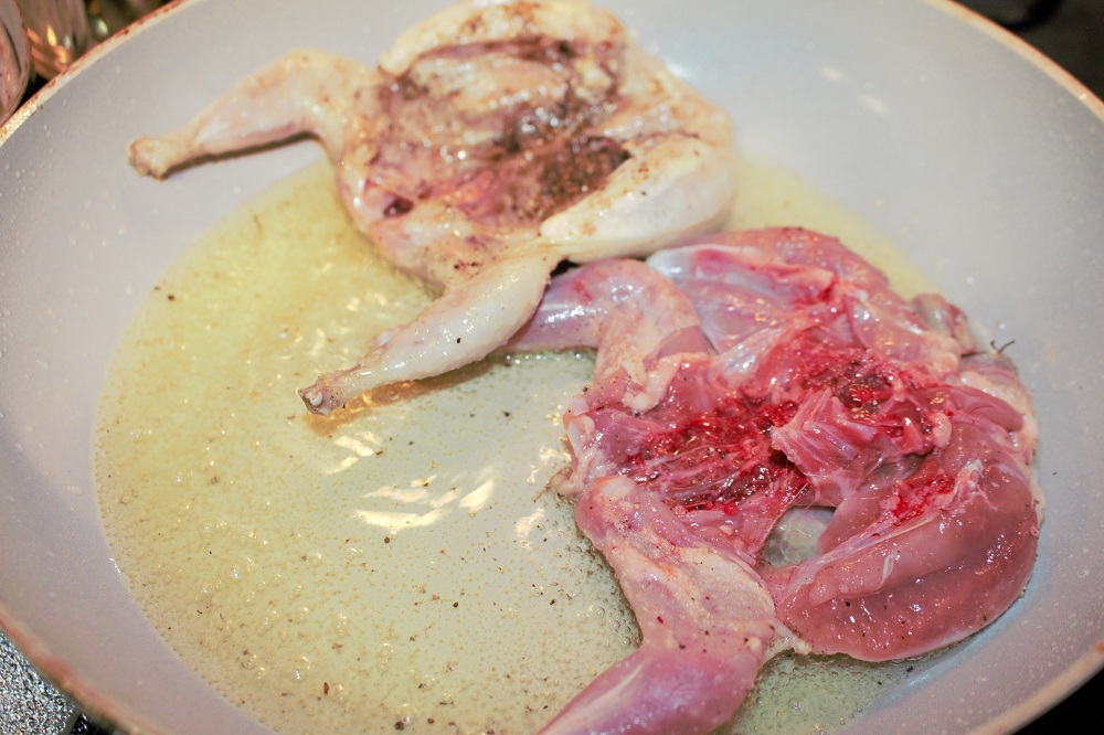 Le pedimos al pollero que nos abra las codornices para guisar, bien limpias, las salpimentamos y las ponemos en una sartén para sellarlas. Retiramos en un plato parte.