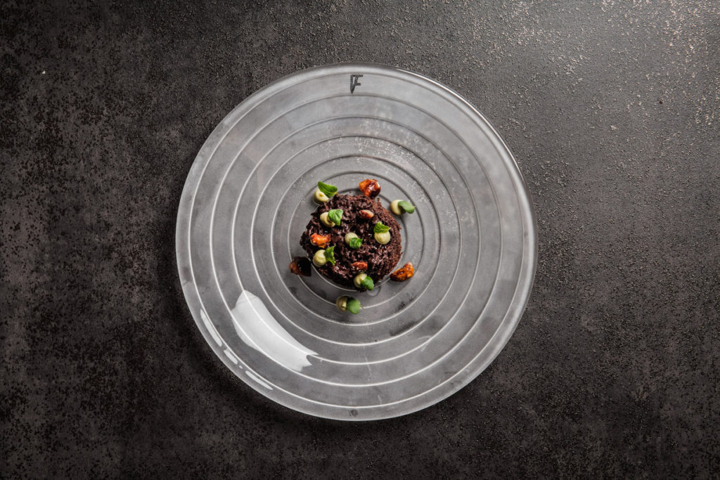 Por otro lado, los elementos clave de la otra mitad del binomio también están presentes en Fierro: lo que más sorprende y diferencia este restaurante del resto convirtiendo el espacio en único en Valencia es su única mesa, una mesa diseñada para acoger tan solo a doce comensales en cada servicio.