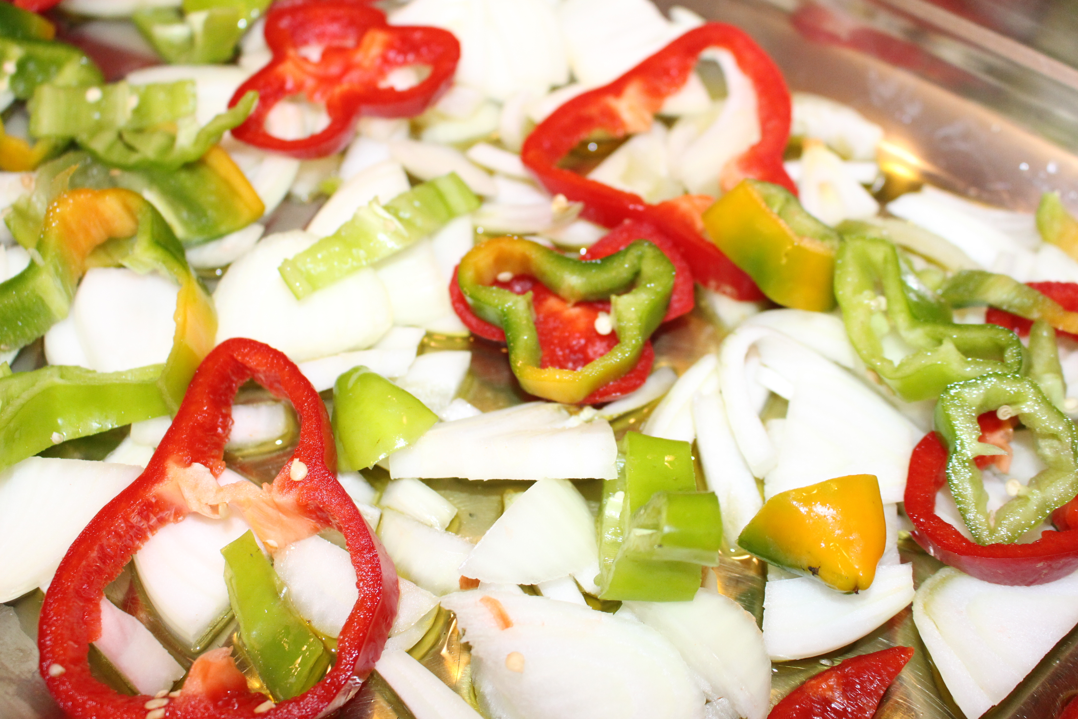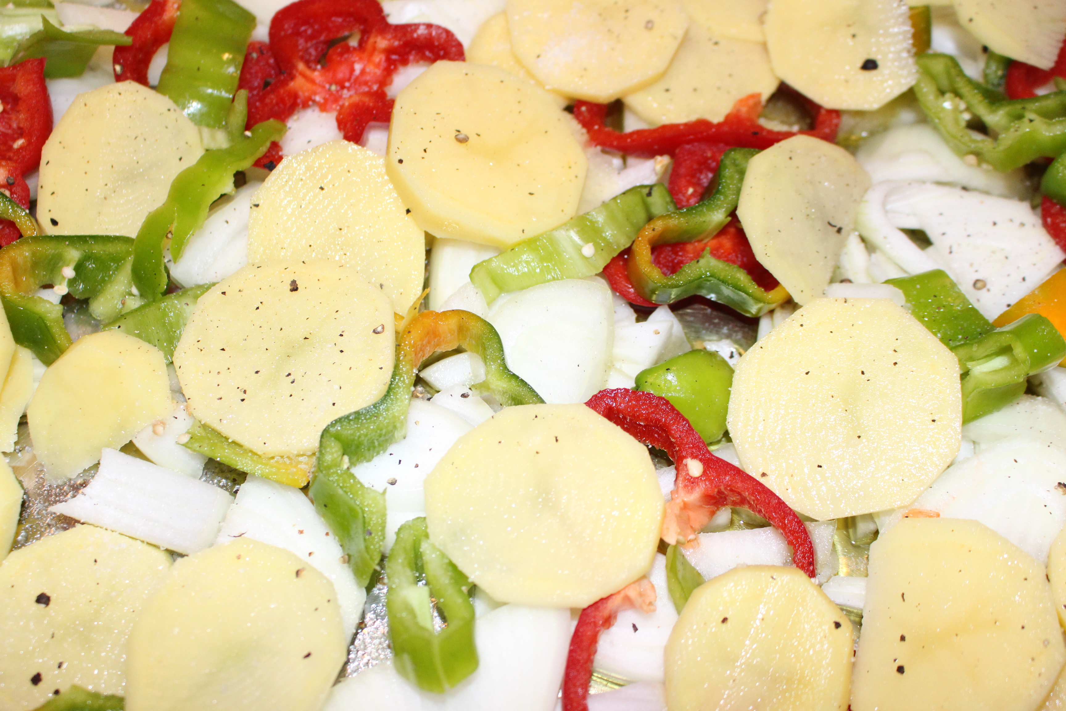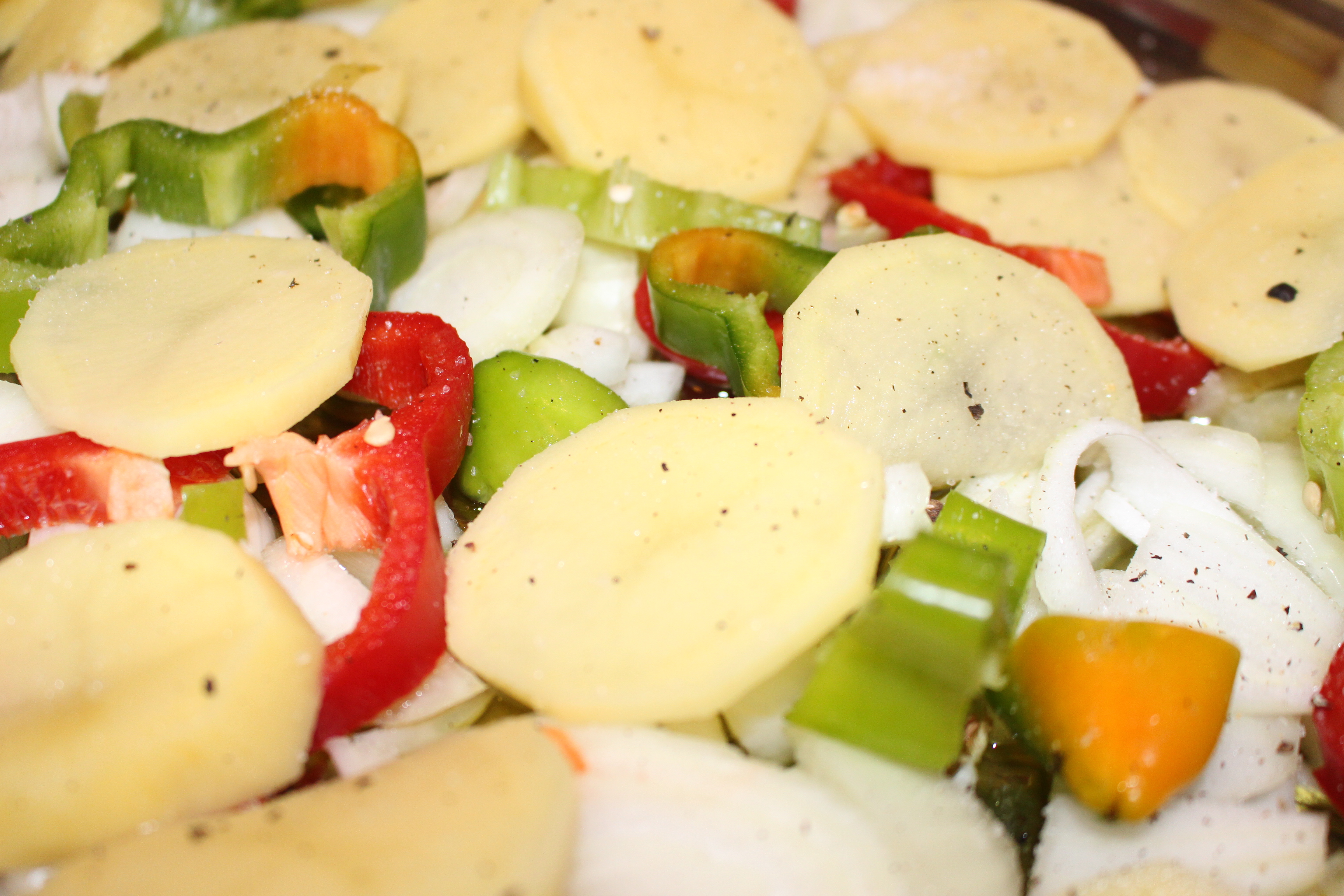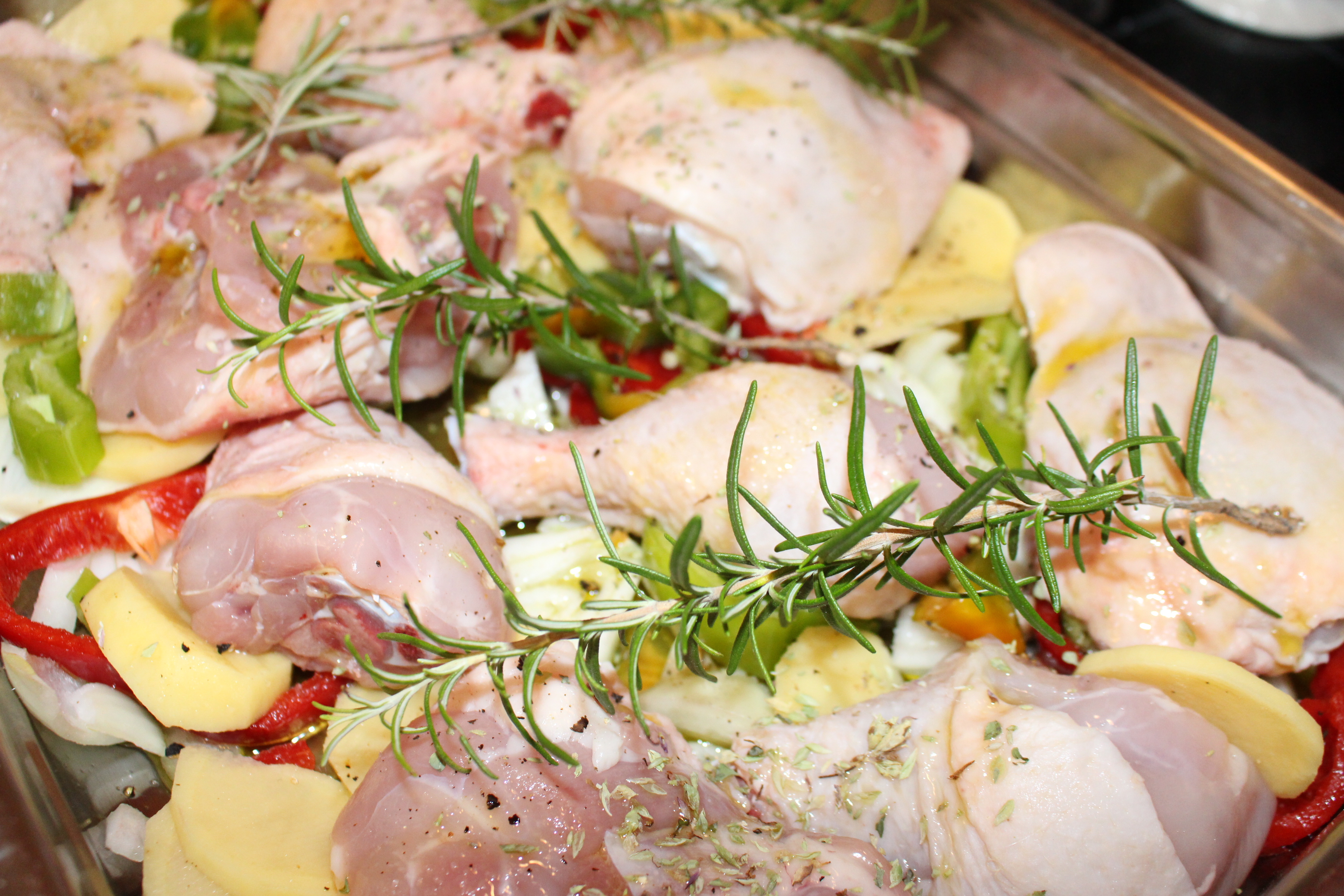 Es una receta muy sencilla. En la bandeja del horno con un chorro de aceite de oliva voy preparando un lecho de cebolla, pimiento verde y rojo y las patatas cortadas en láminas con la mandolina. Sazono con sal y pimienta y coloco los contramuslos de pollo.